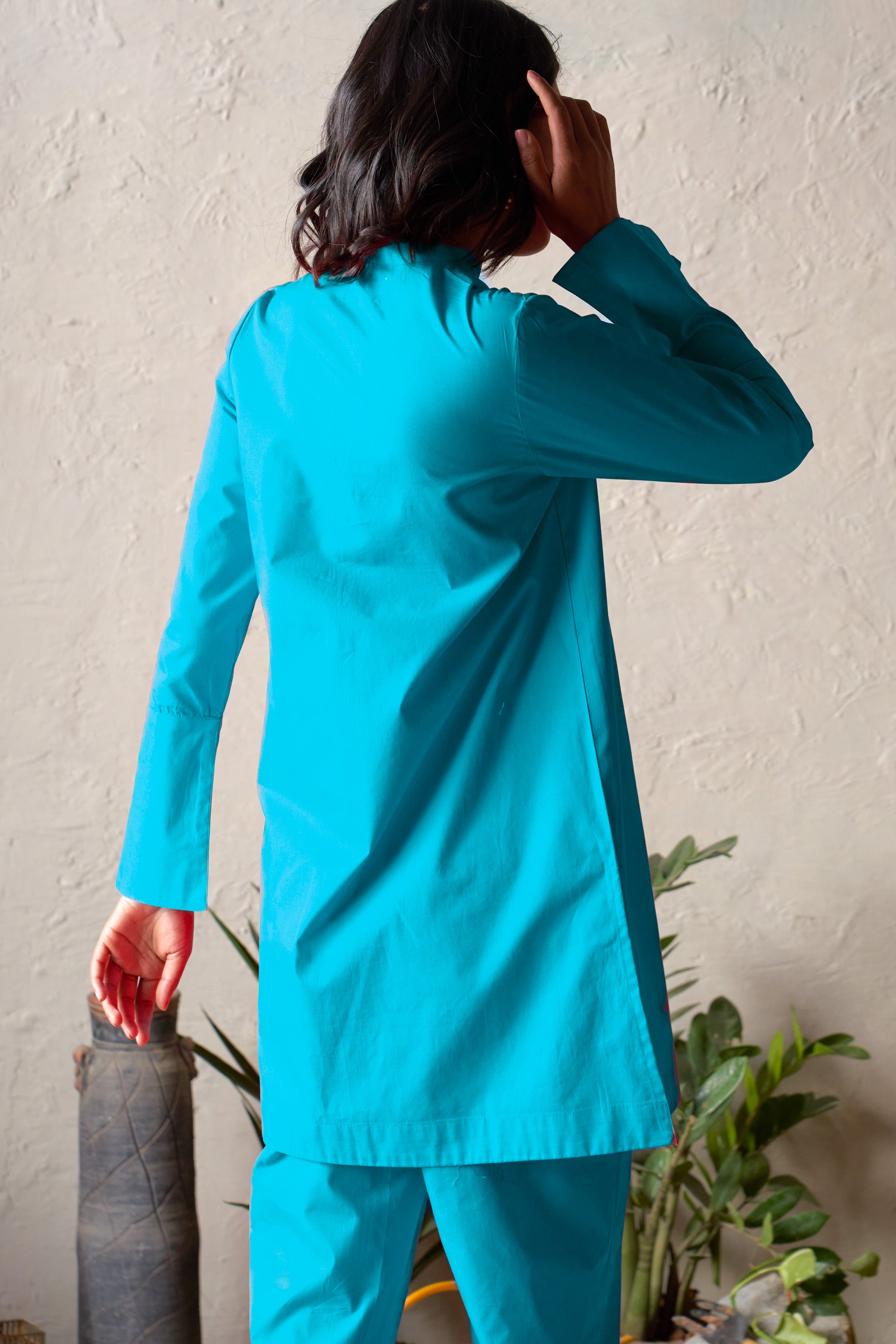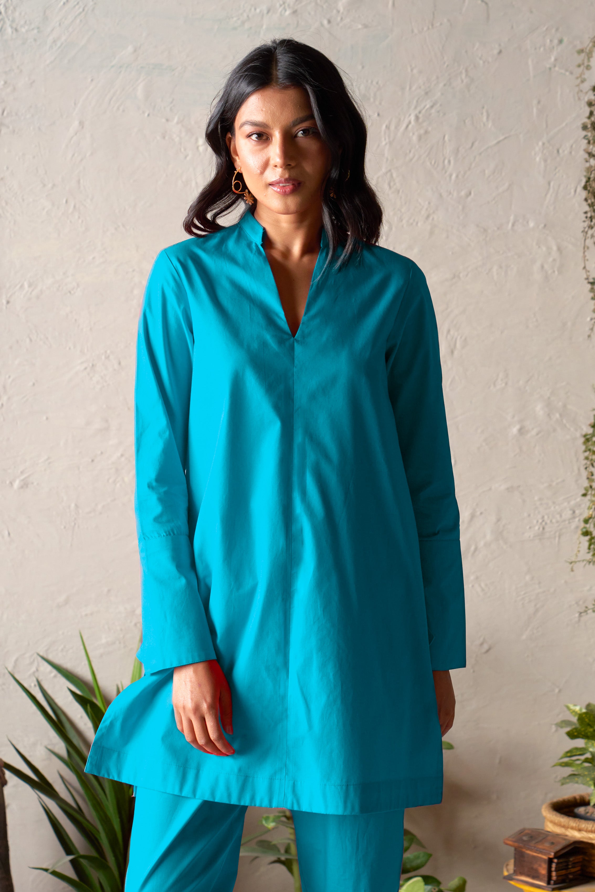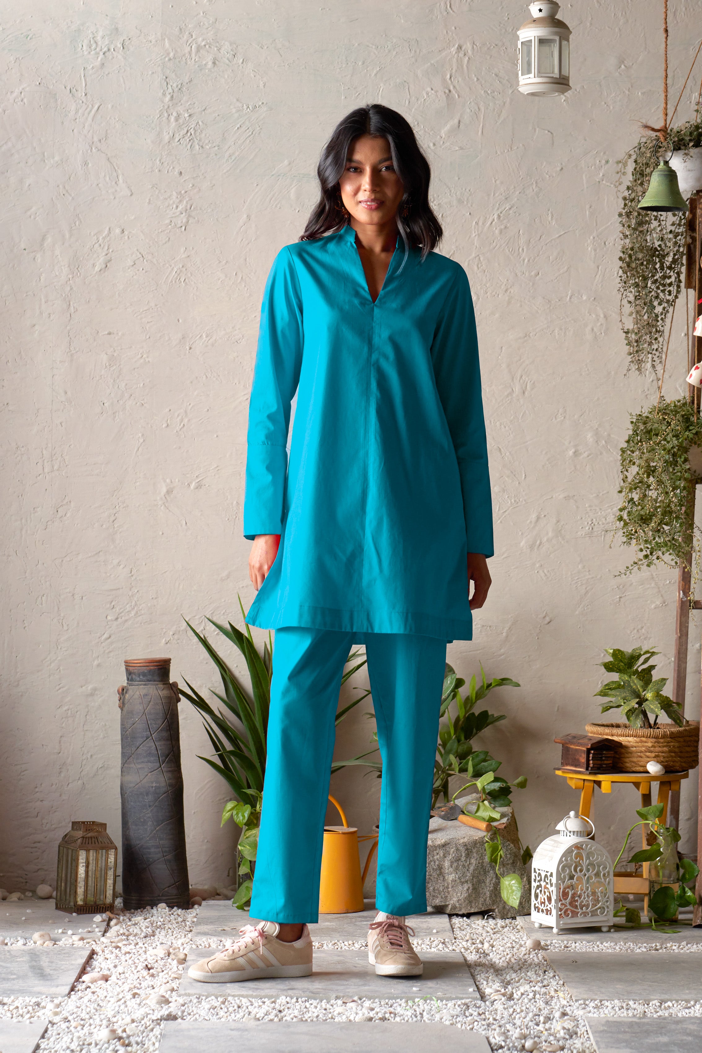 Portico Set is crafted in a rich peacock blue for understated statement dressing. Designed with a V-neck band collar, the mid-length straight kurta features high side slits that create a contemporary, fluid silhouette. Full-length sleeves add refinement, while the paired straight pants ensure comfort and versatility. An elegant everyday ensemble where structure meets ease.