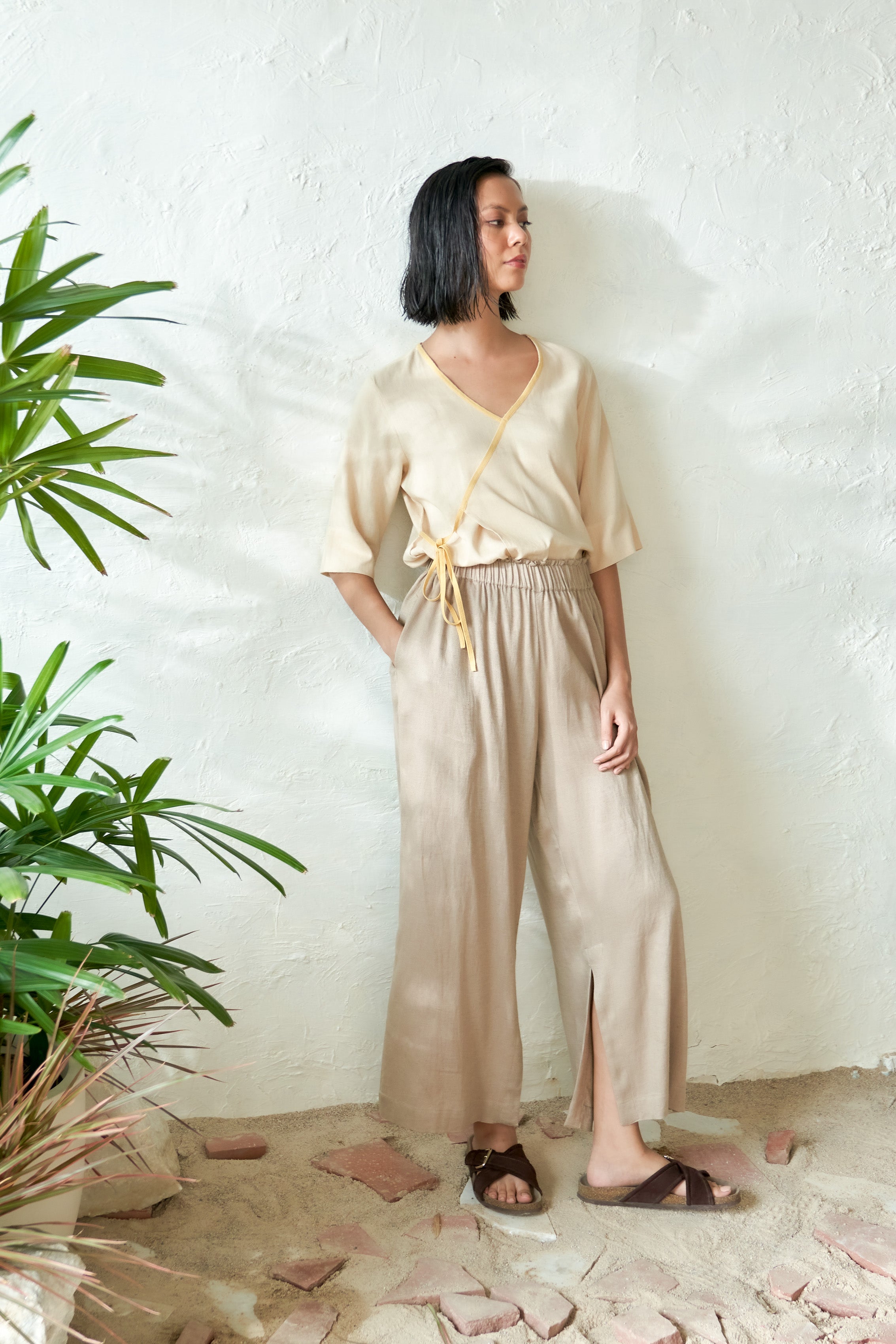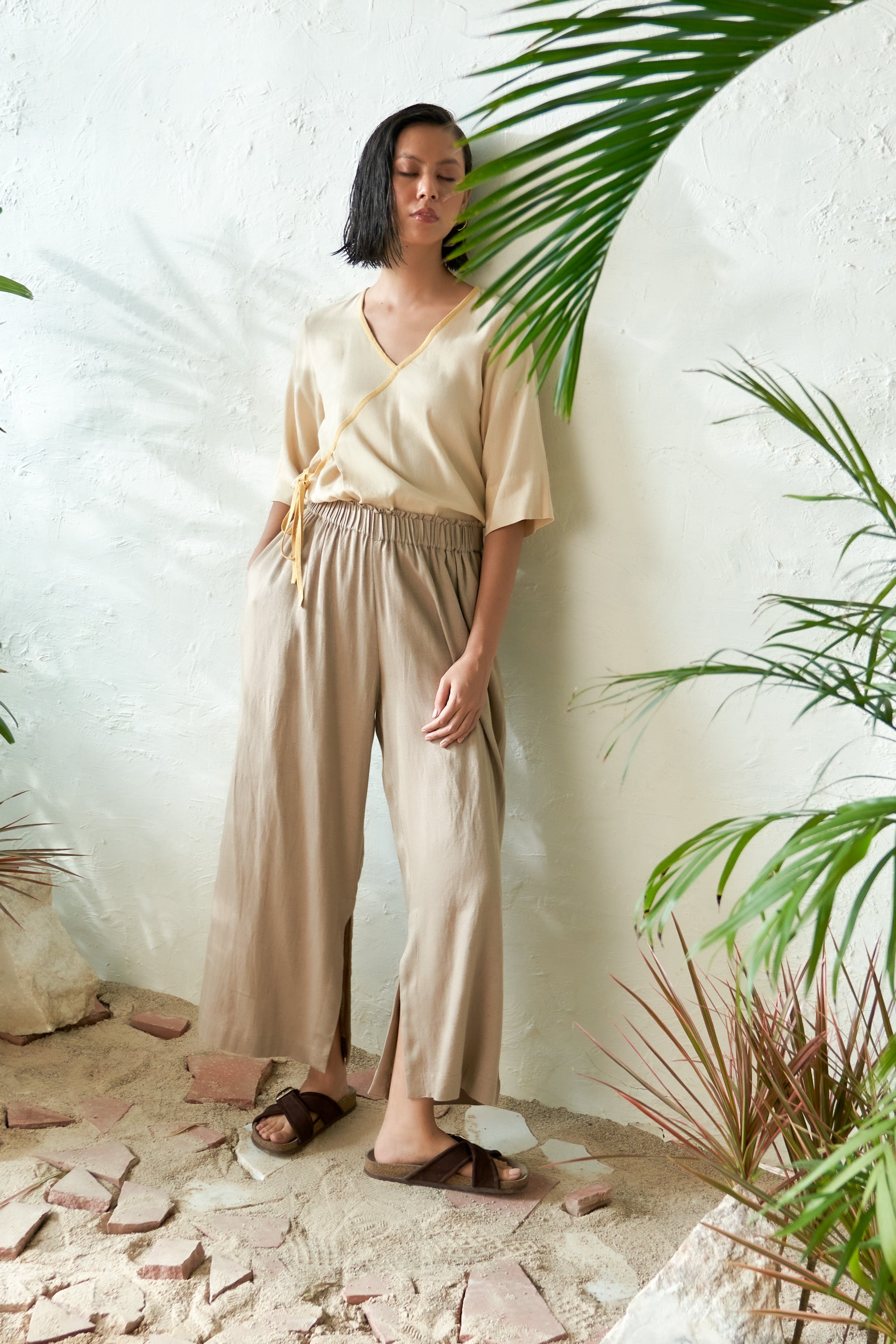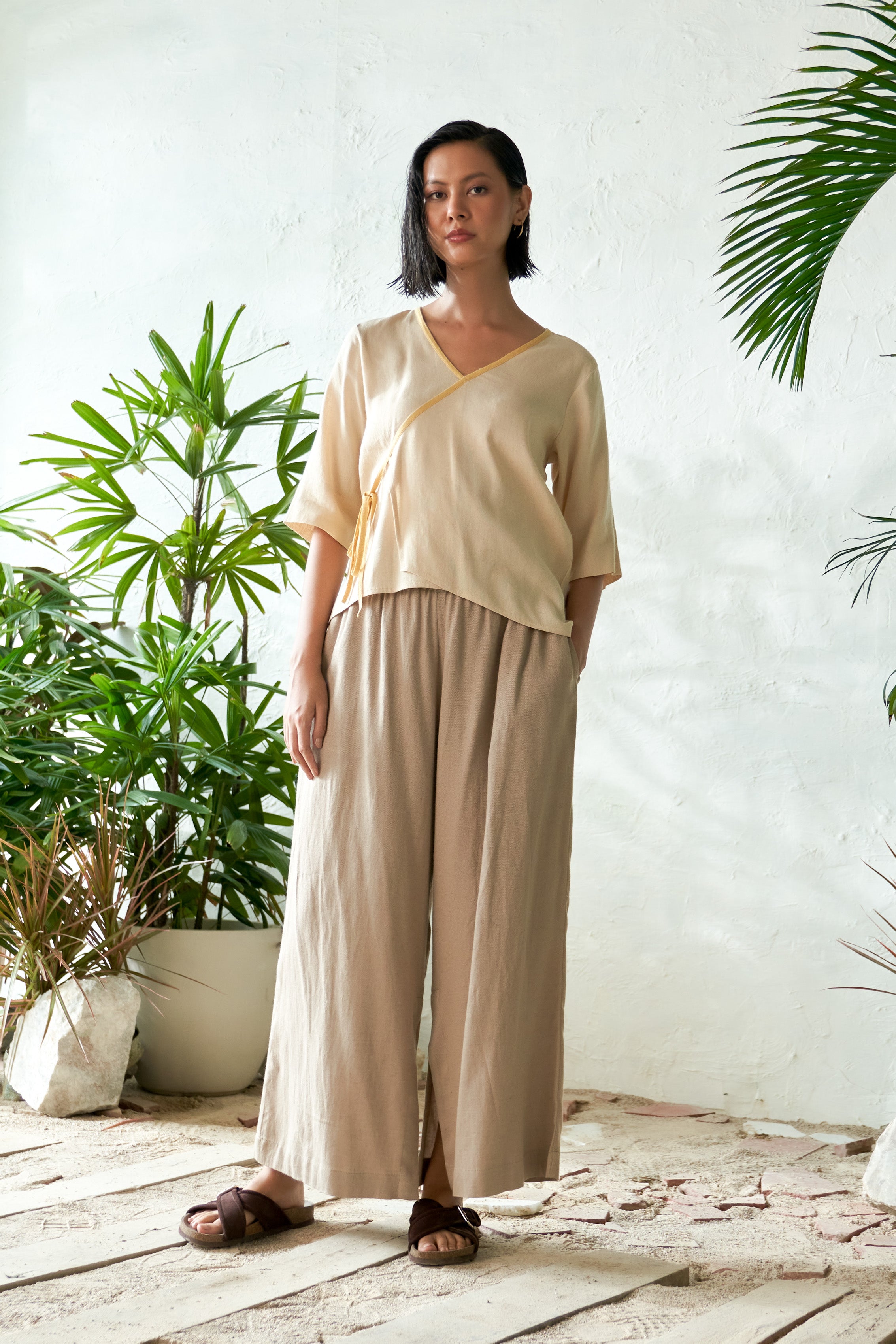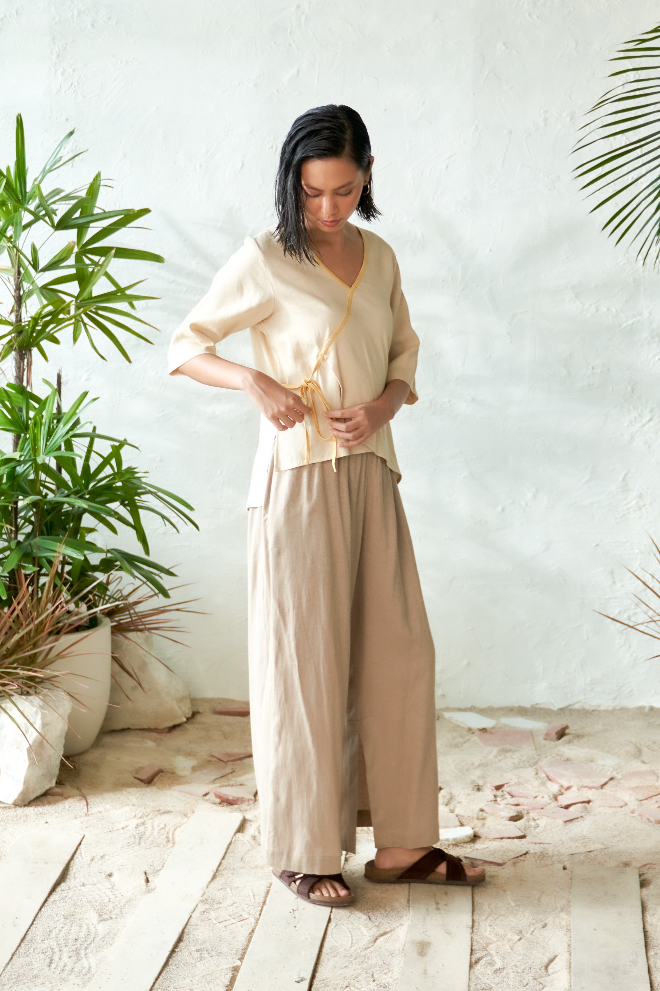 Elevate your summer style with the Beach Tan & Coffee Set. The Beach Tan Cross-Tie Top features a chic V-neckline, a stylish cross-section design, and an elegant side tie-up, crafted from breathable flex fabric for all-day comfort. Paired with the Breve Coffee Pant, designed with side slits, a flared casual fit, and an elasticated waistband, this set embodies effortless comfort and spontaneity, perfect for any warm-weather outing.