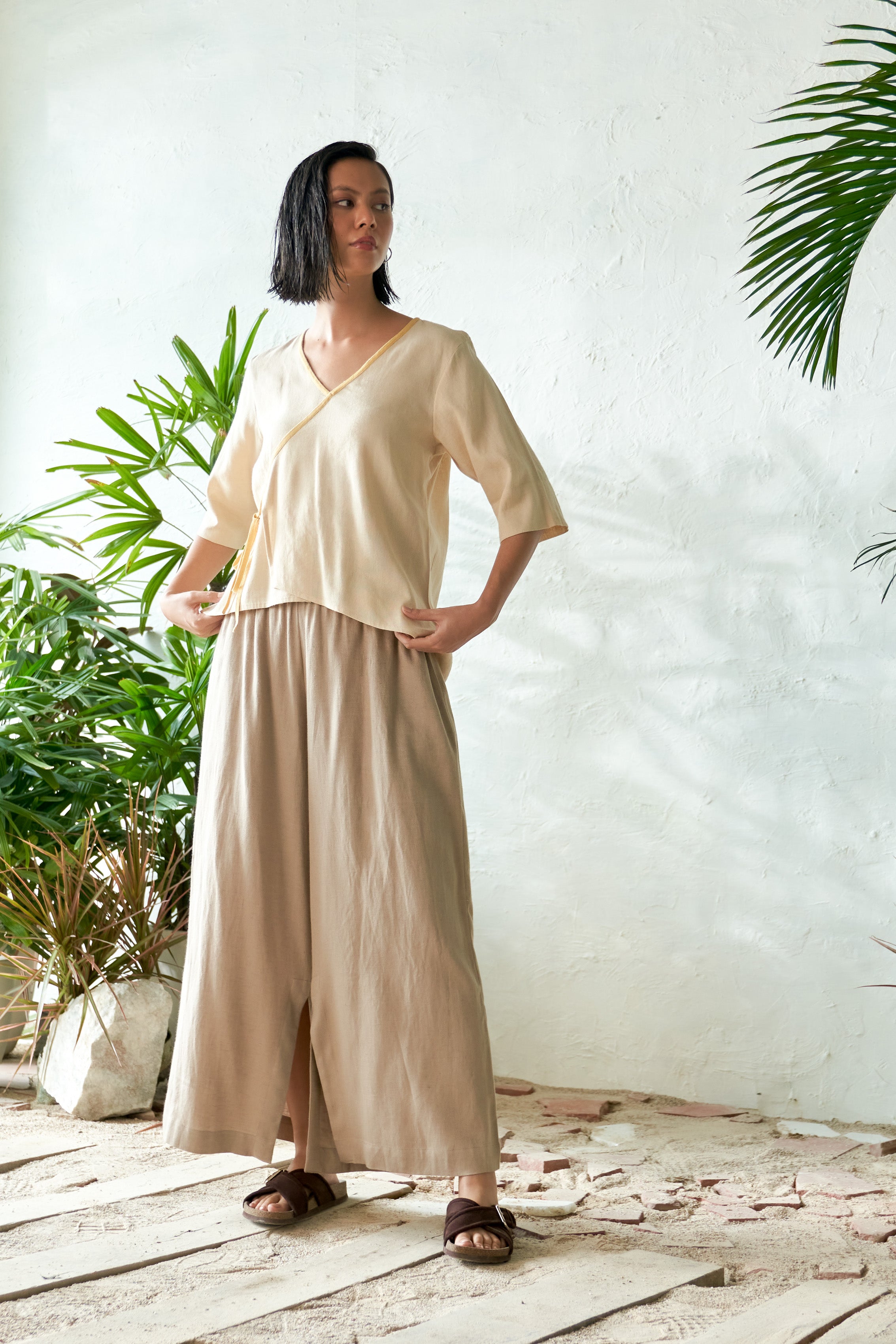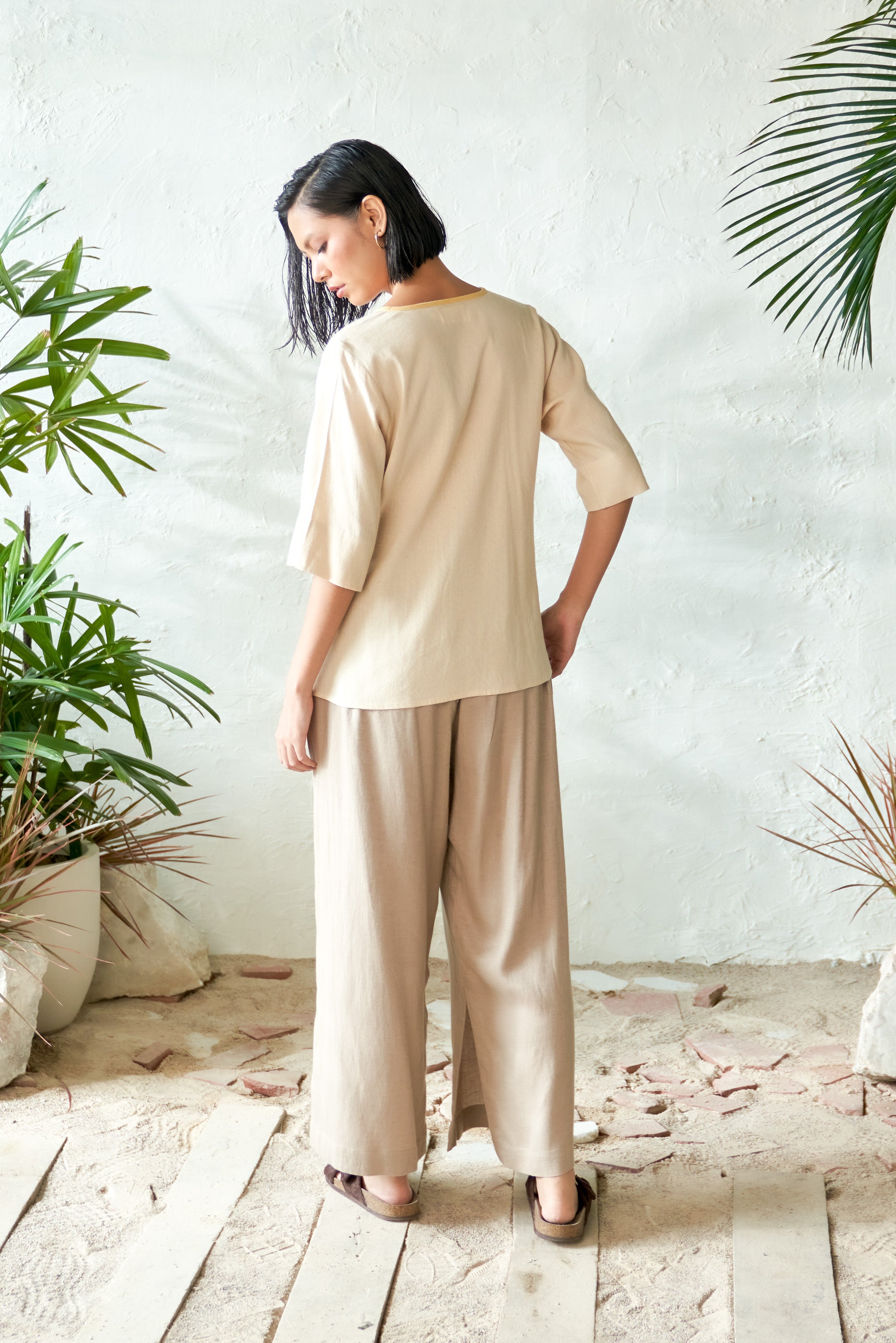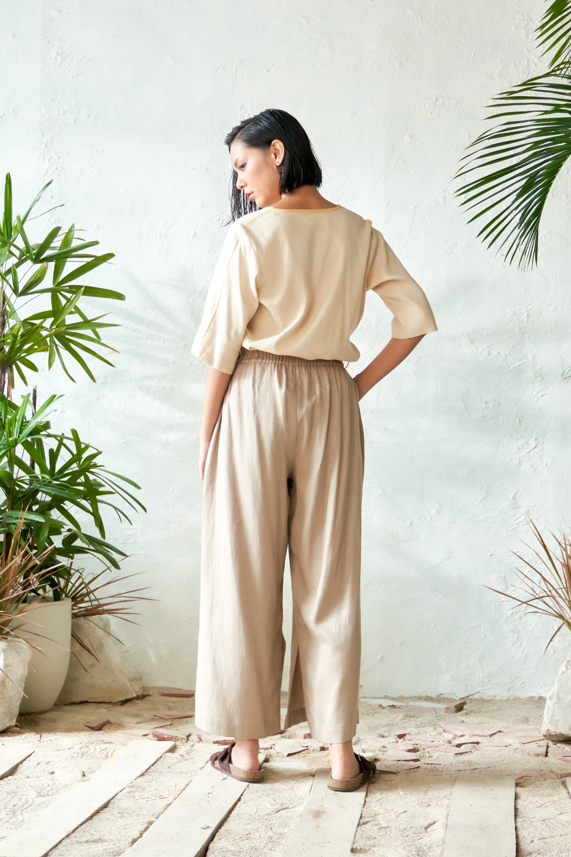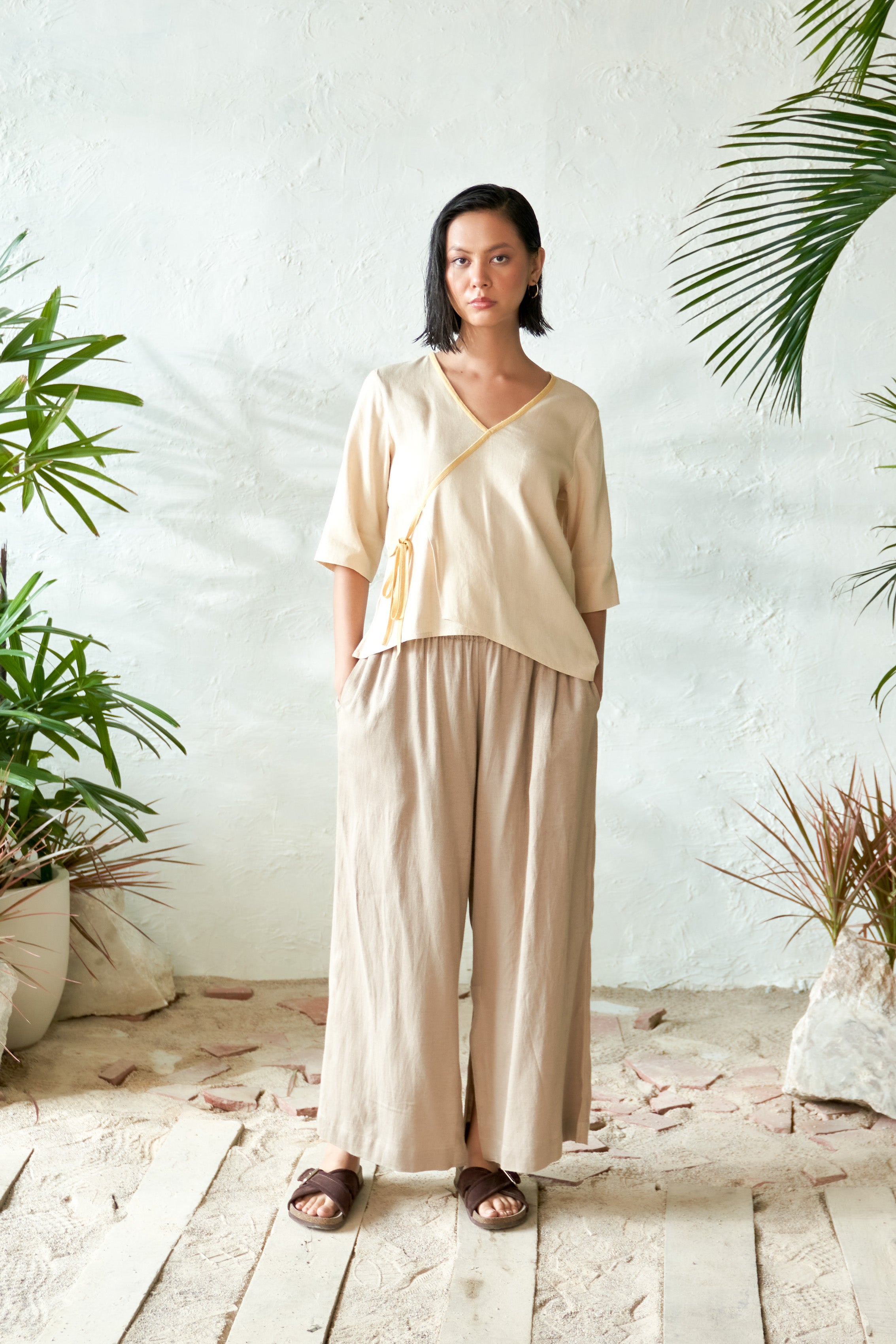 Elevate your summer style with the Beach Tan & Coffee Set. The Beach Tan Cross-Tie Top features a chic V-neckline, a stylish cross-section design, and an elegant side tie-up, crafted from breathable flex fabric for all-day comfort. Paired with the Breve Coffee Pant, designed with side slits, a flared casual fit, and an elasticated waistband, this set embodies effortless comfort and spontaneity, perfect for any warm-weather outing.