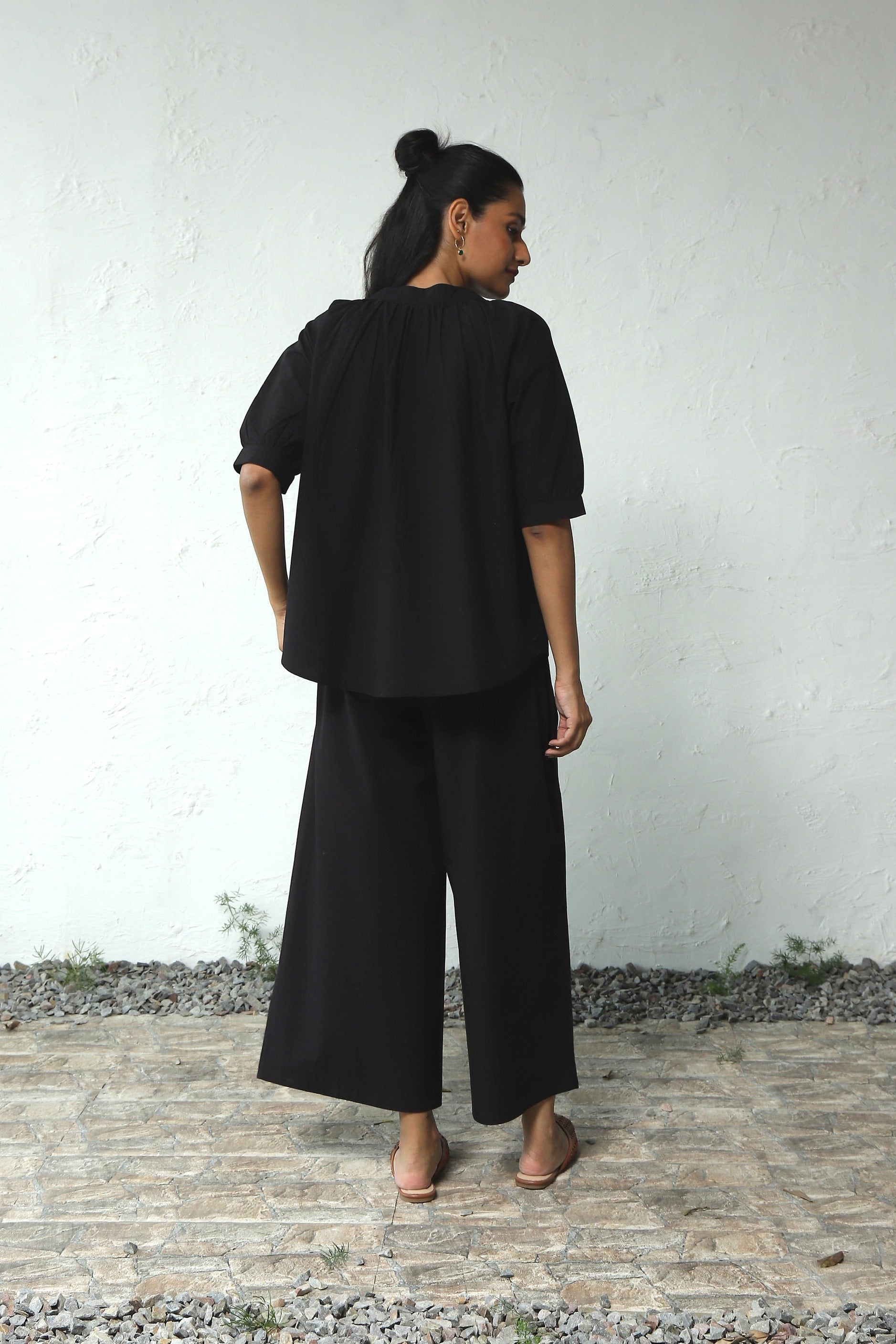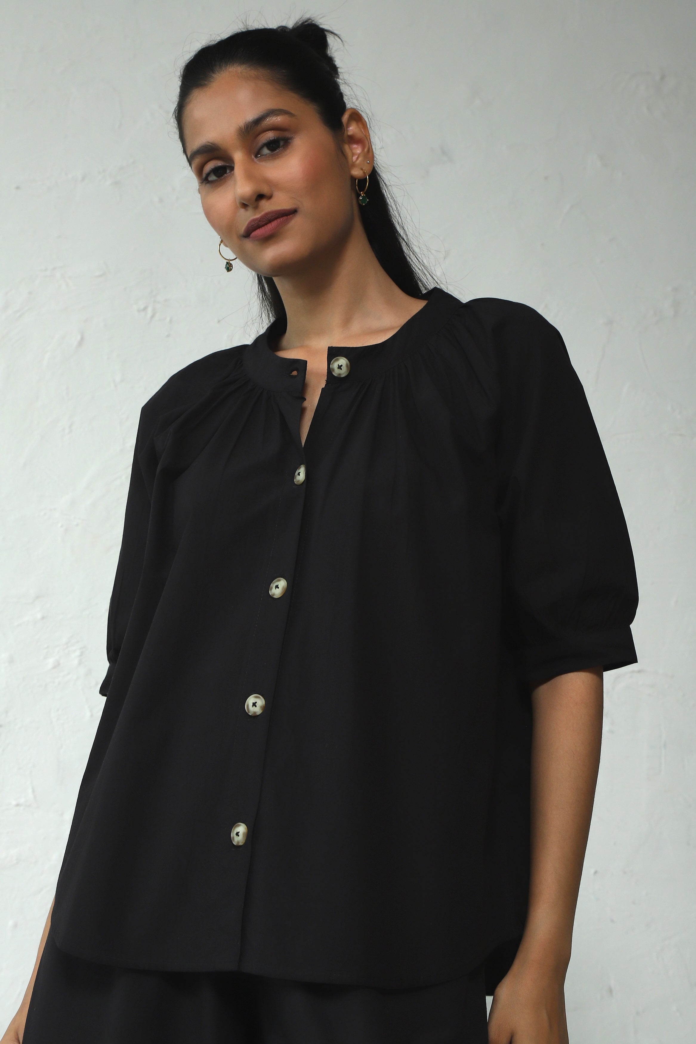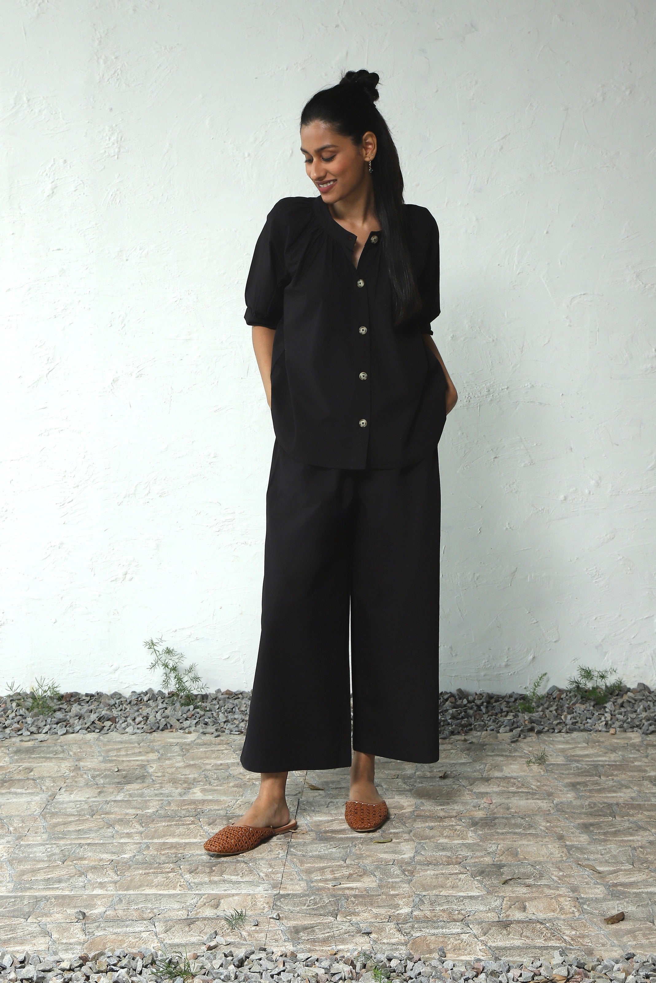 Black wanderer set your next travel expedition. Crafted from crisp cotton poplin, gathered round neck Top has subtle gathers around the neckline. The front placket features marble pattern buttons, enhancing versatility, even doubling as an open shirt. Paired with a flared pants which has elasticated waist and drawstring and functional side pockets.