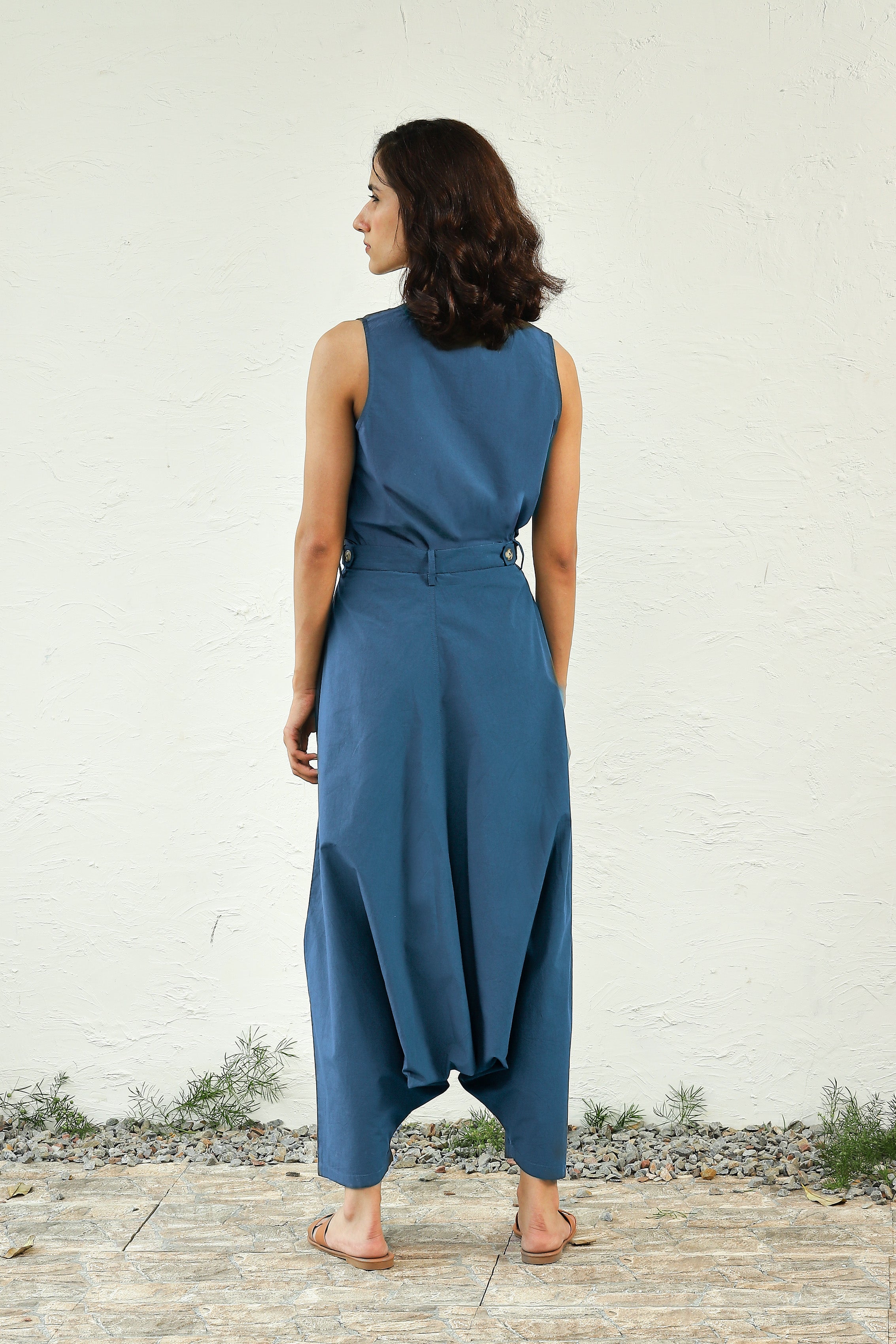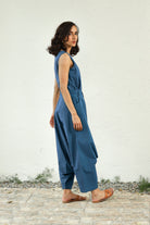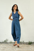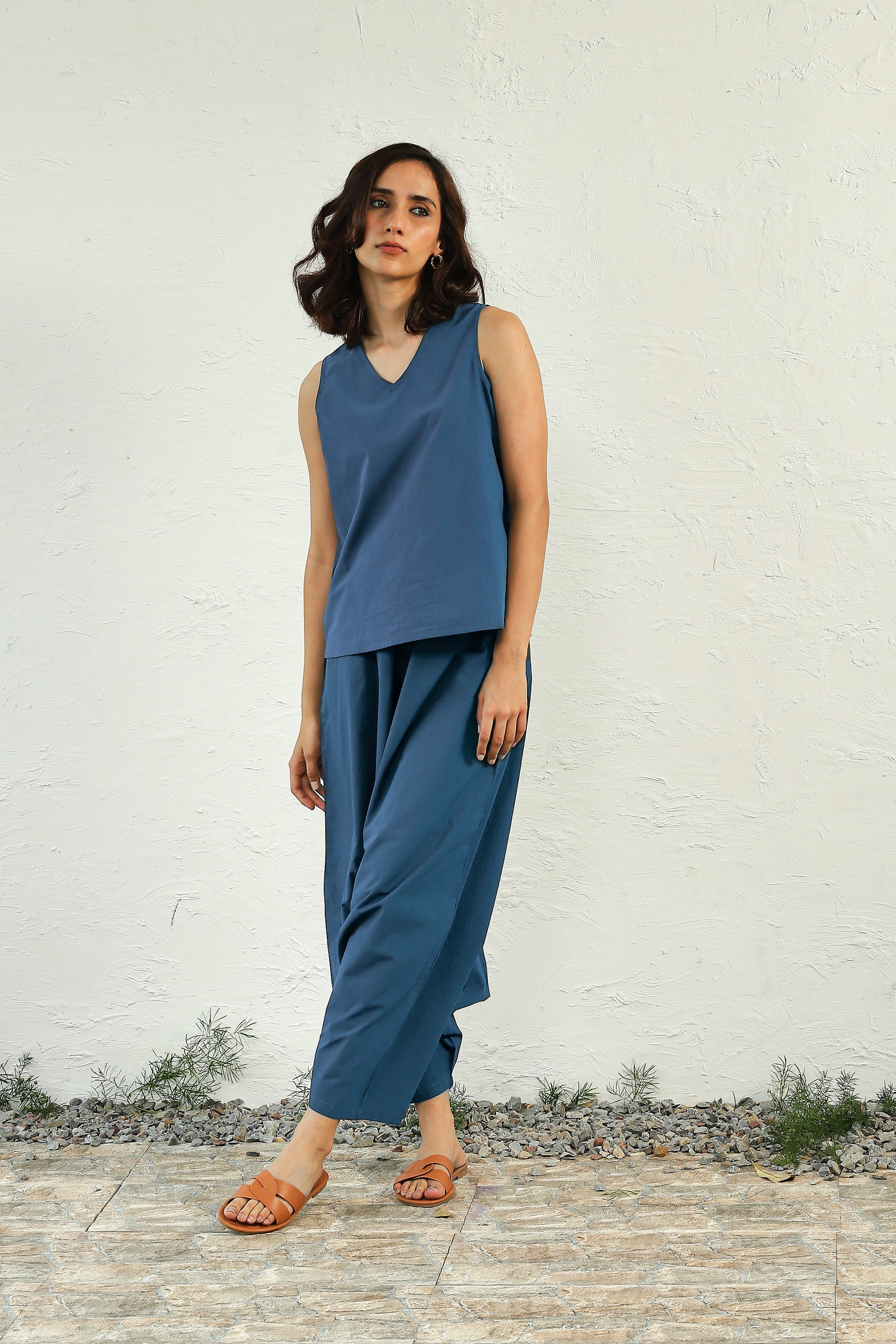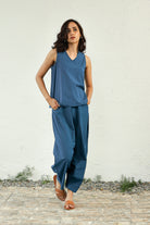 Canoopi Picks: Our most popular and comfortable harem co-ord set adapted into beautiful colour variants - this one in a coral true blue shade. The set includes a sleeveless top and harem pants in premium poplin cotton. The top with a versatile neckline is an airy silhouette, while the pants feature a dramatic flare at the center. This co-ord will undoubtedly capture your heart.