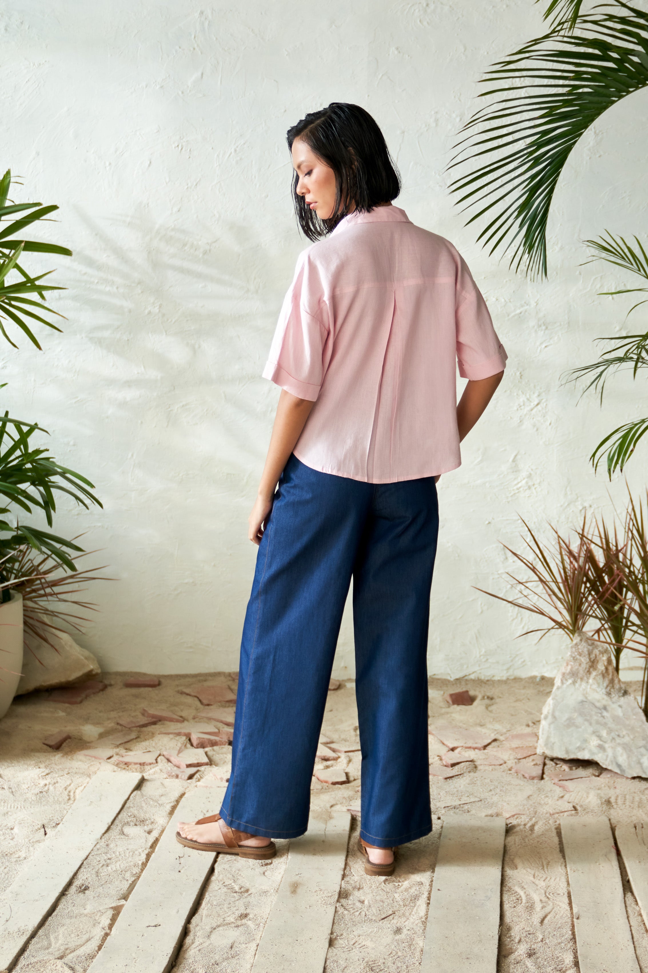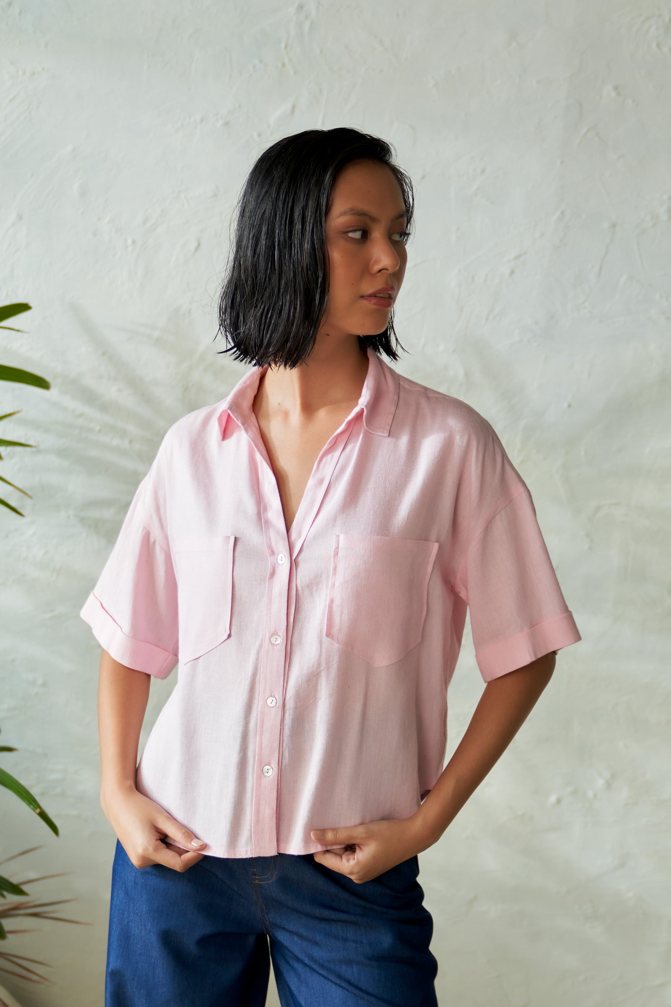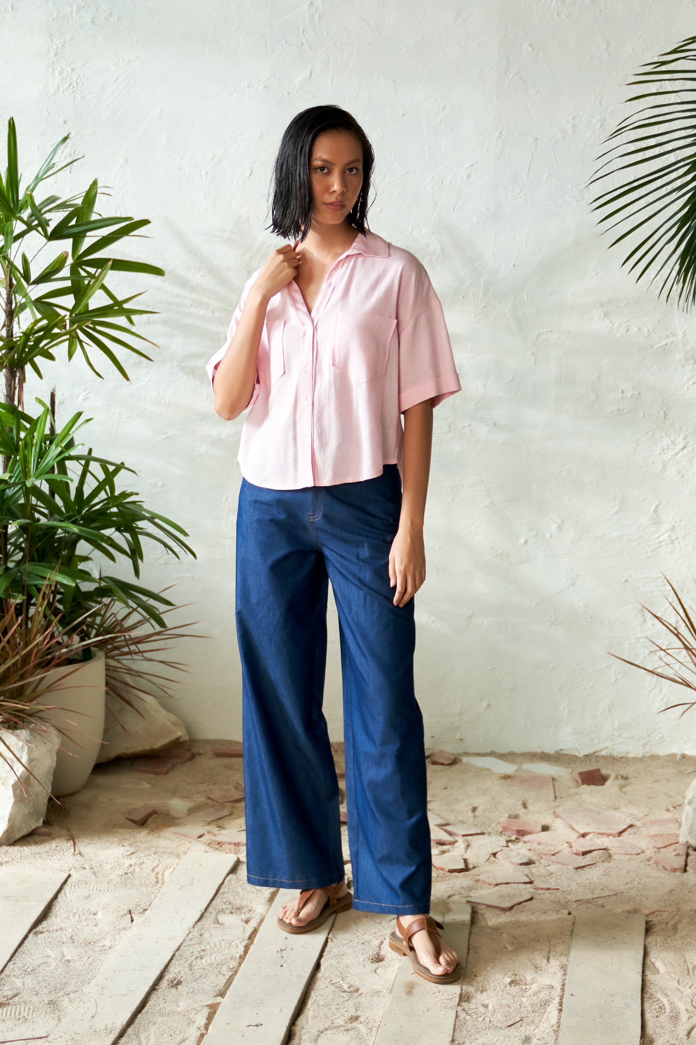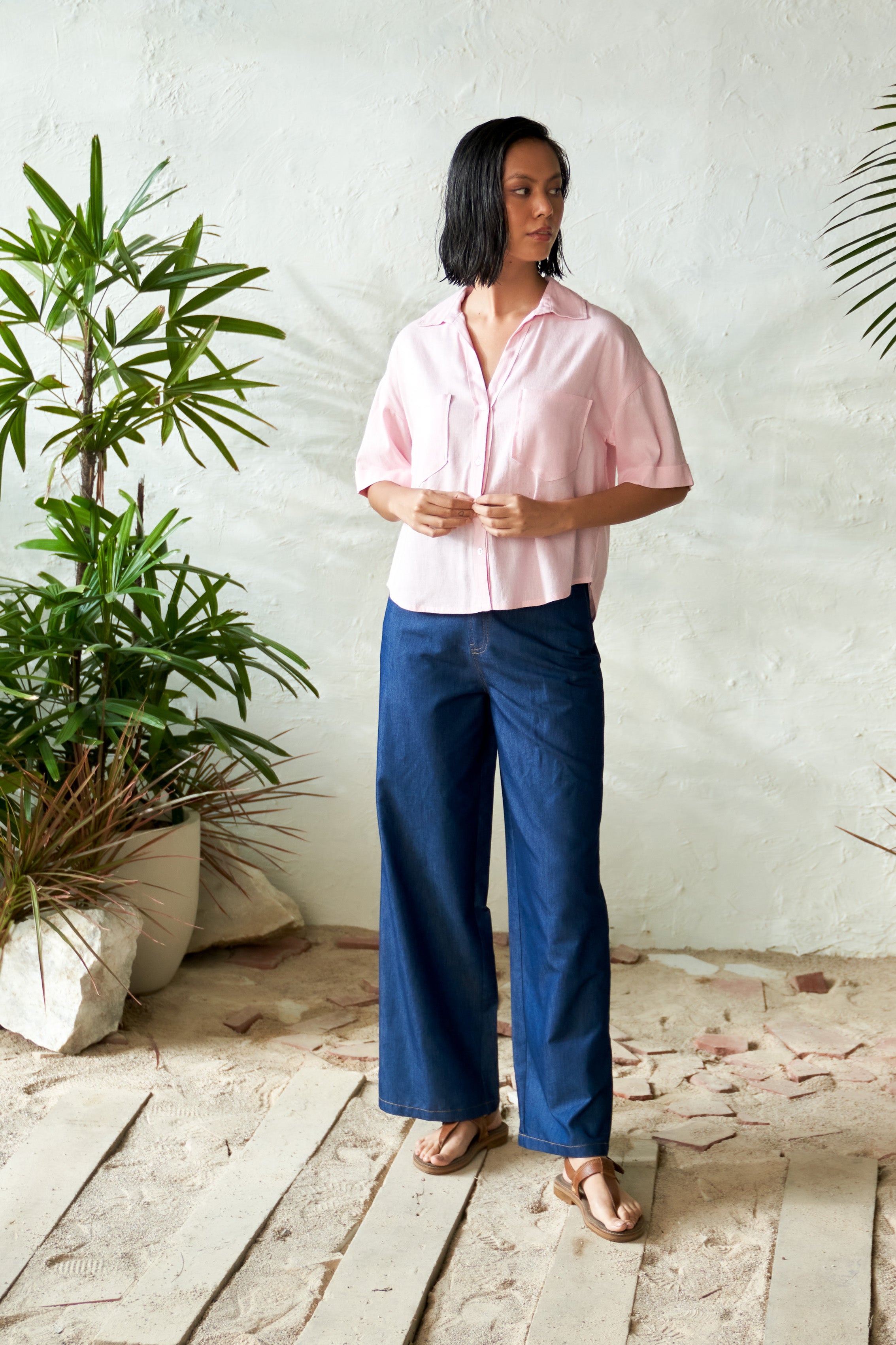 Discover the refreshing charm of the Candy Slush Shirt in a delightful light pink hue. Crafted from breathable summer staple flex fabric, it features neat front pockets, adding both functionality and style. Paired with the chic Onyx Blue Denim Pants, designed with a high-waist and straight fit, this set effortlessly combines comfort and sophistication. Perfect for casual outings or polished occasions, it’s a wardrobe essential for sunny days.