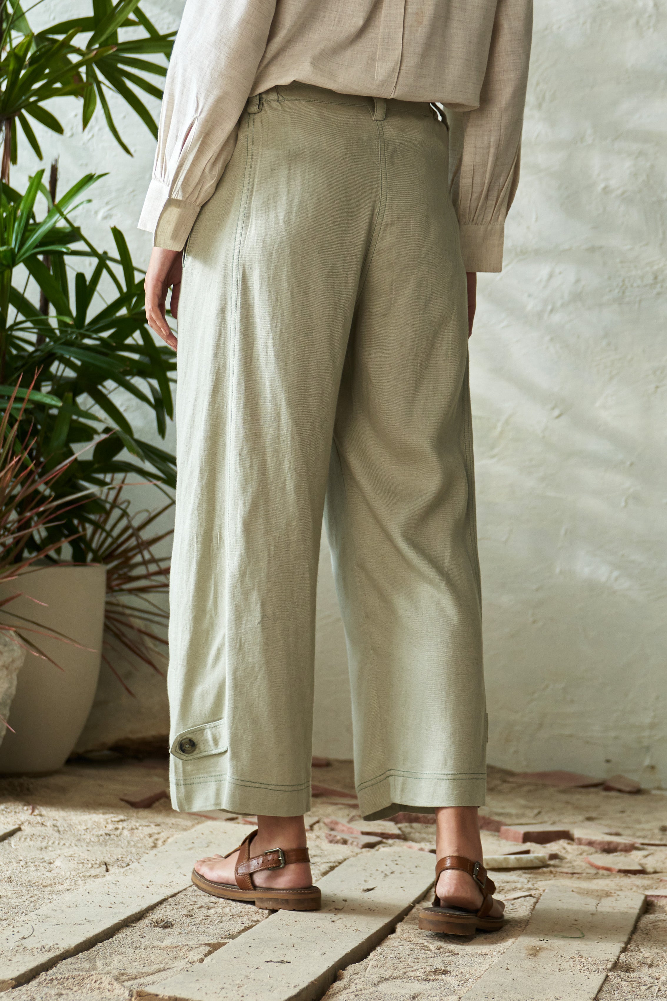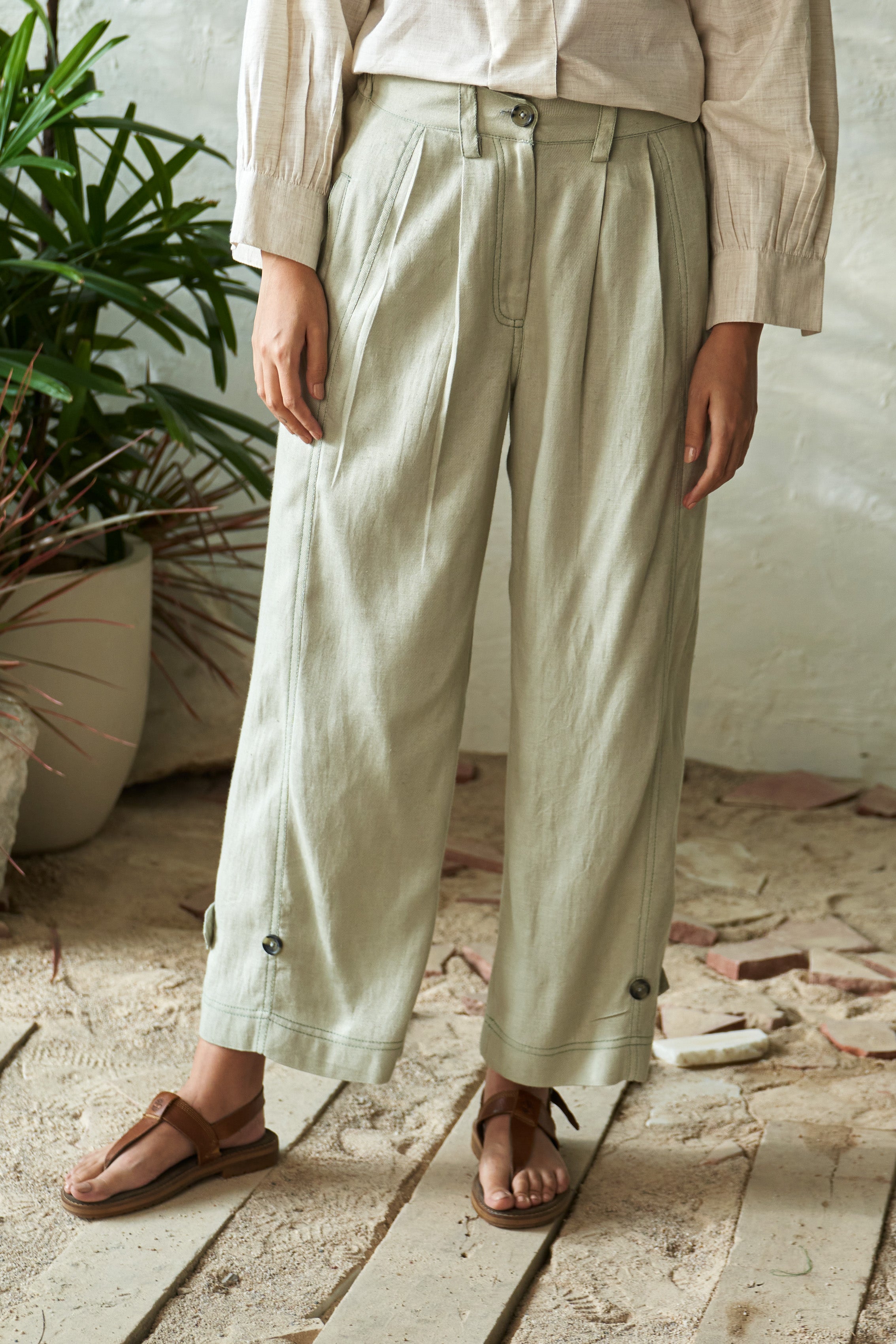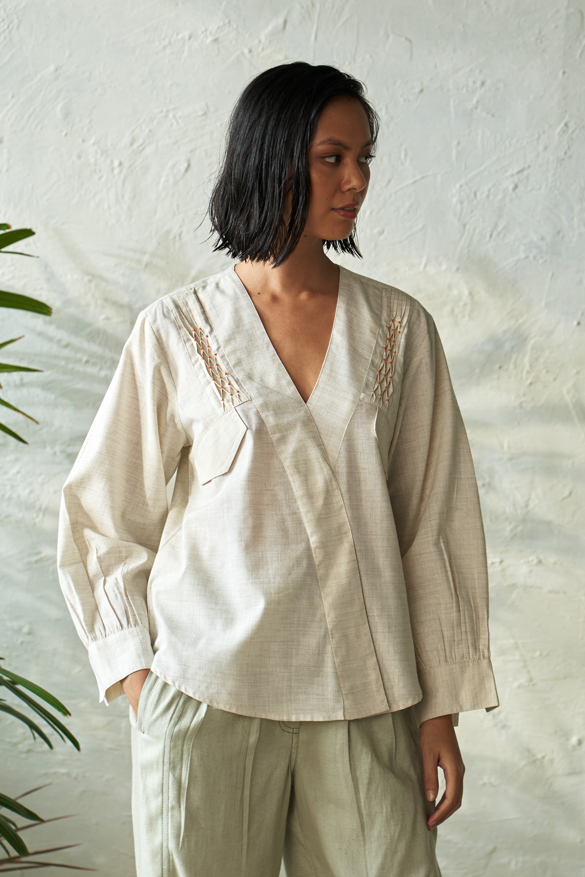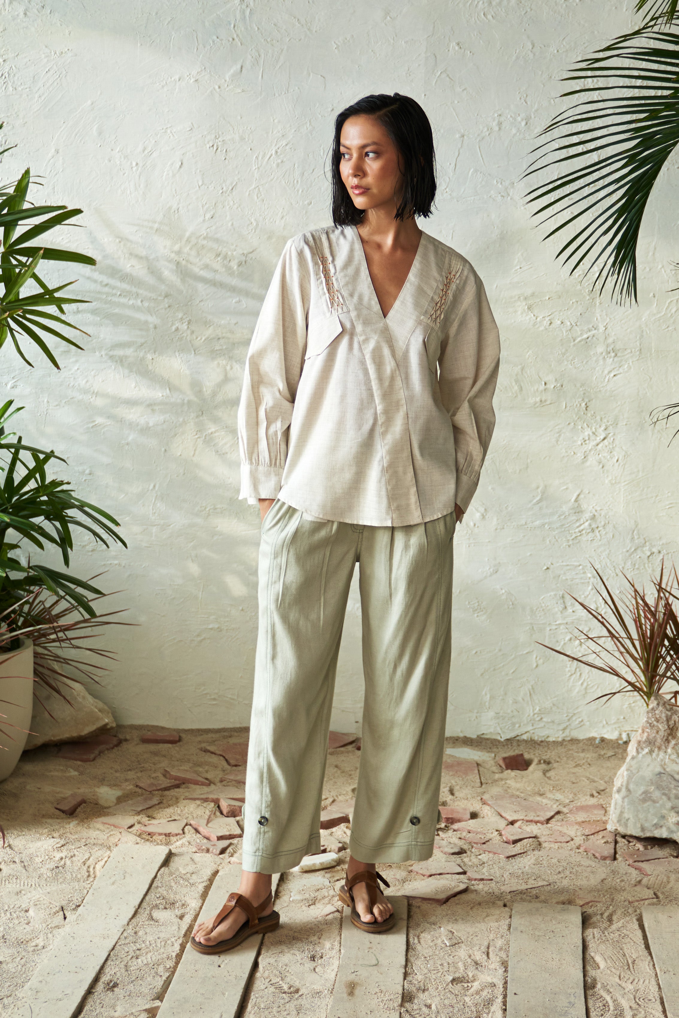 Cashew Pista Mix: The top is a chic kimono-style piece featuring delicate smocking details on the front and cuffed full-length sleeves with subtle gathers for added elegance. Paired with the Pistachio Side Pleat Pant, crafted from soft flex rayon, these pants