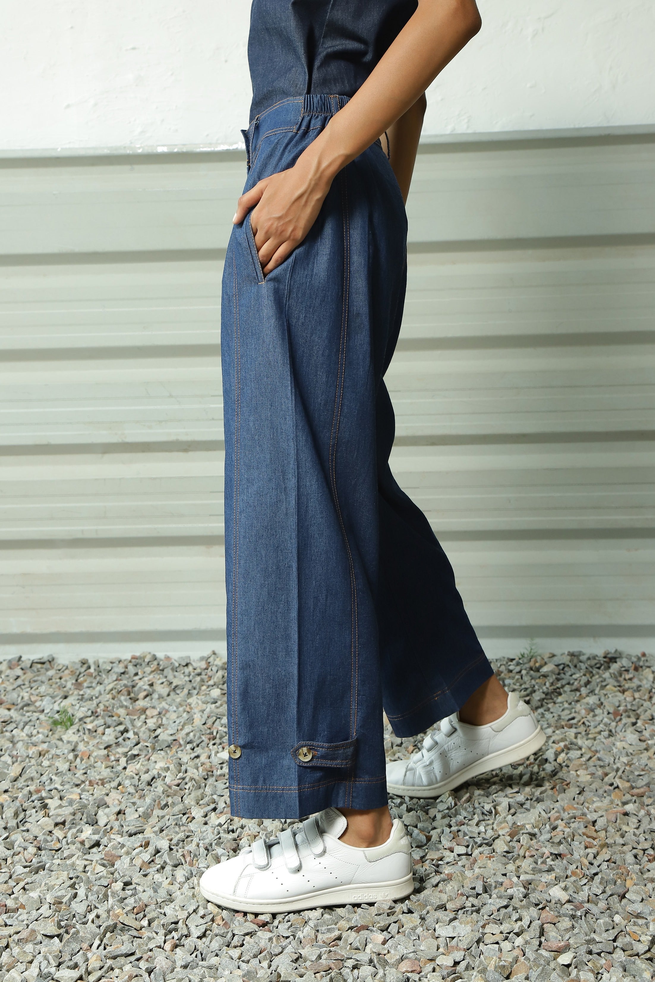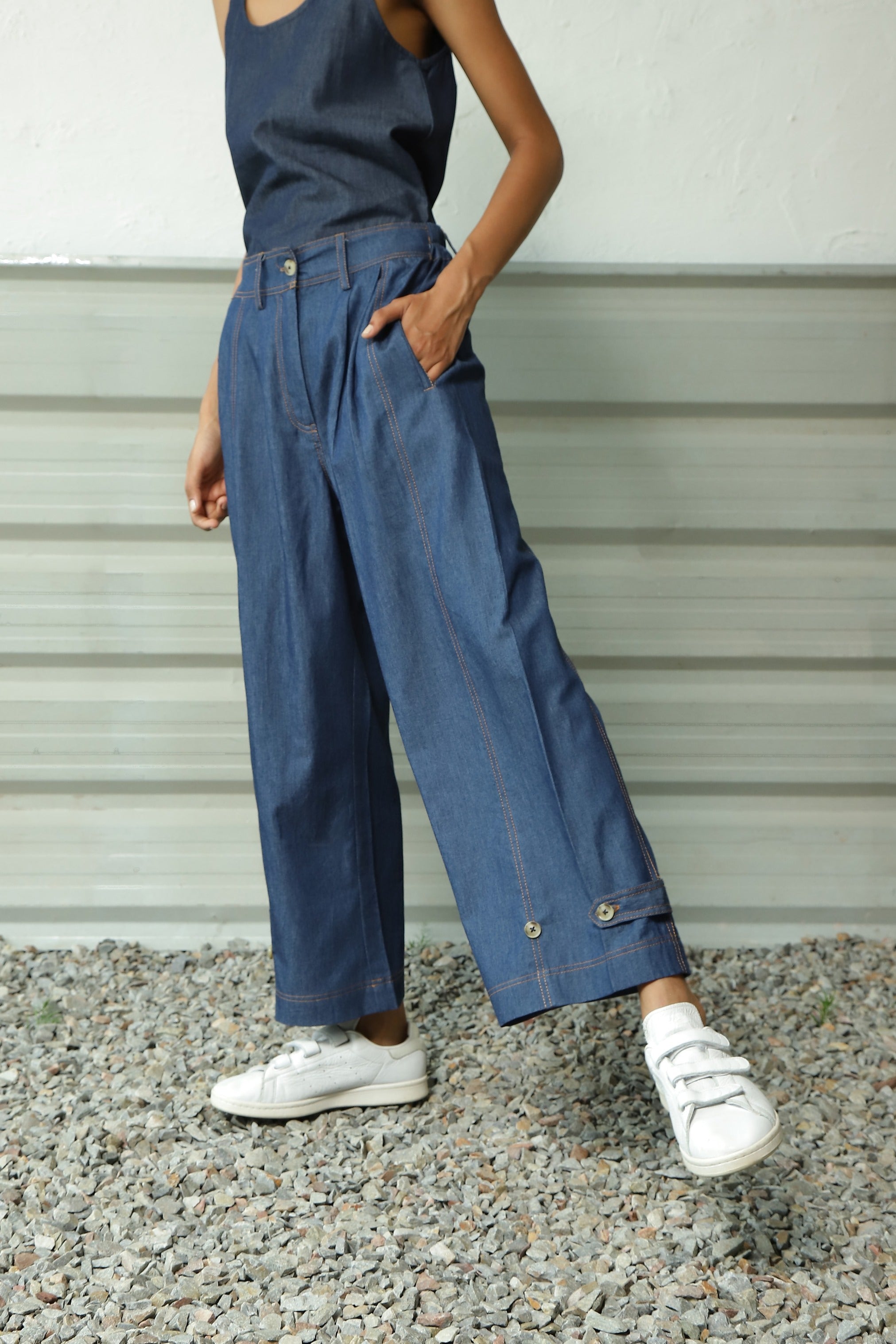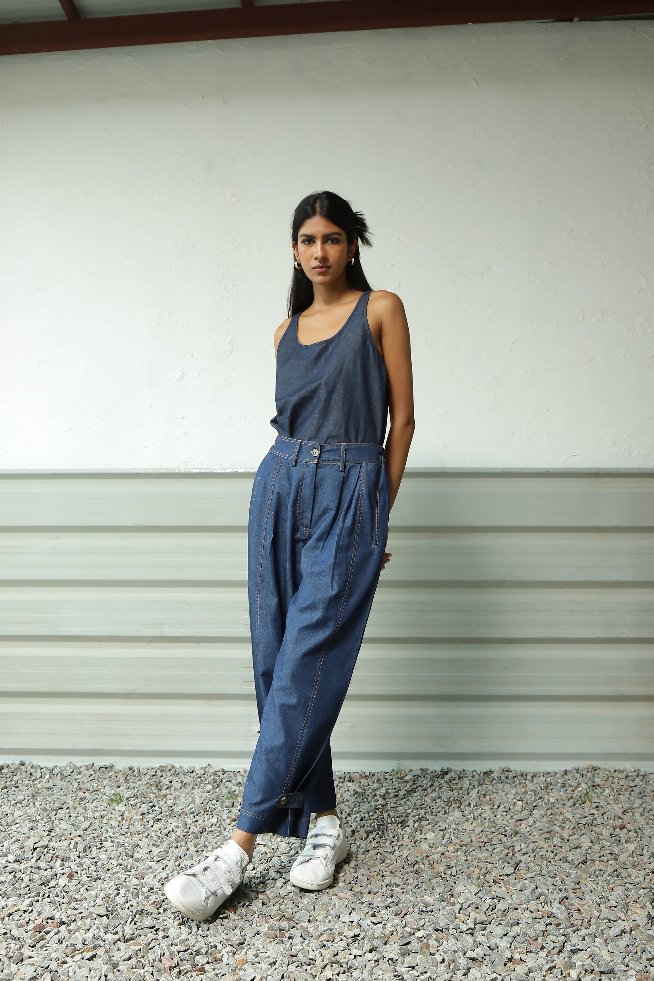 Combination features a Sleeveless Tank in a Breezy A-line silhouette, complete with a scoop eckline. Paired with versatile Pants that seamlessly adapt to your preferences. Style them as Flared Pants or cinch them for a straighter look. These pants showcase an intricate interplay of loops, double stitch embroidery, side pockets, and subtle pleats. This Go-To Co-ord Set is the ultimate choice for all your explorations and experiences.