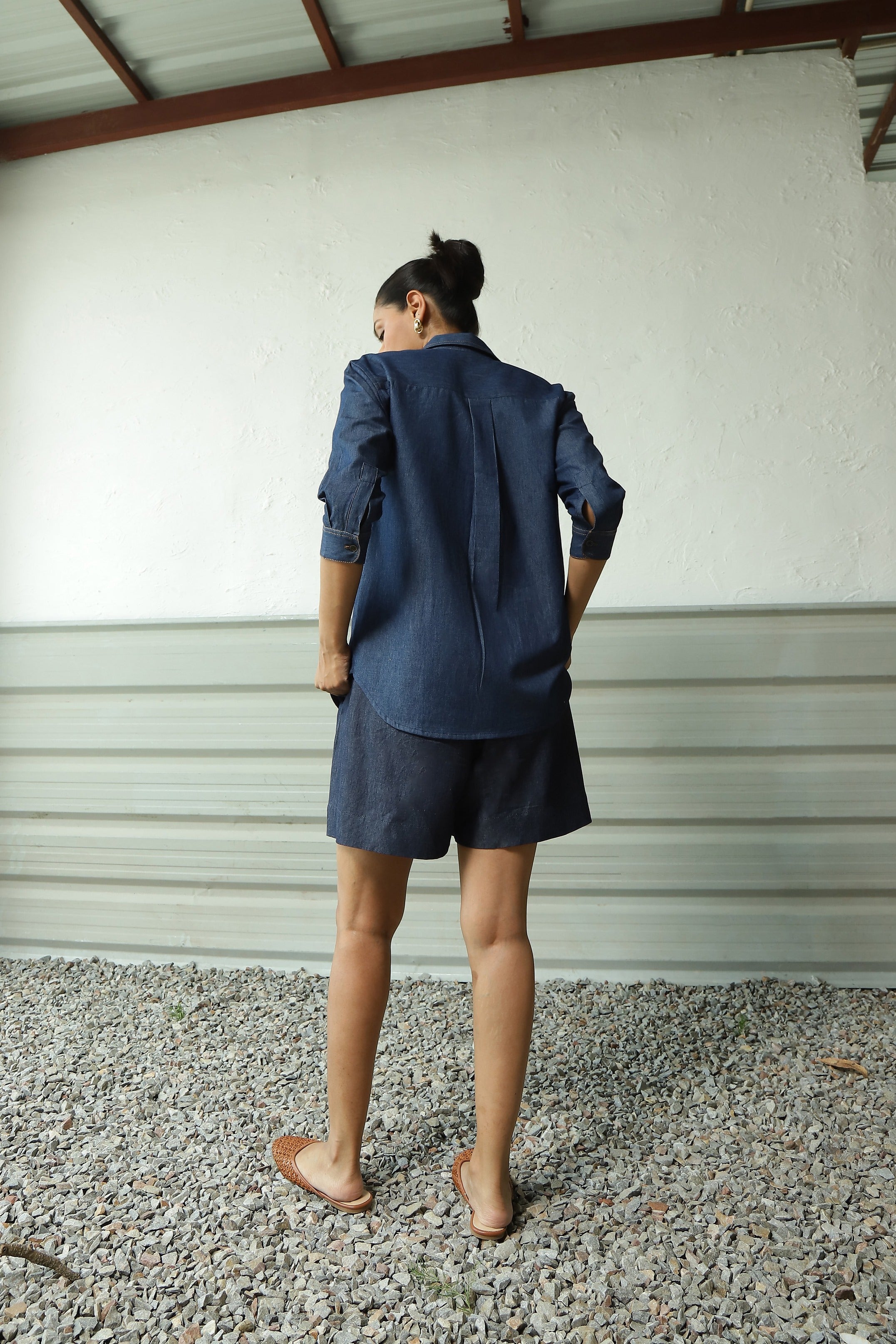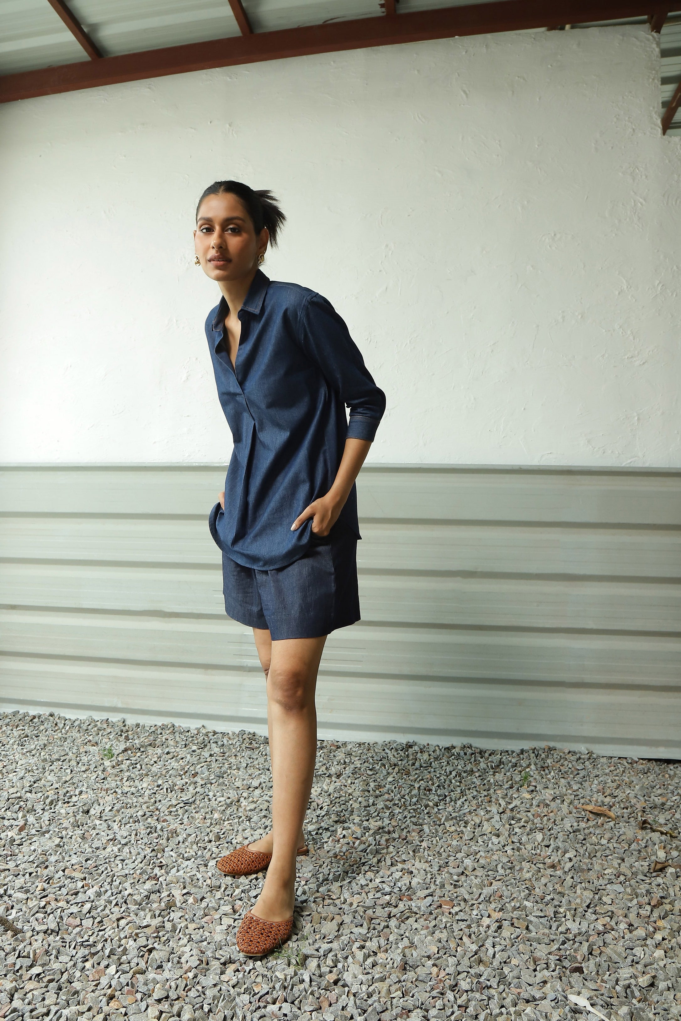A refreshing departure from the ordinary with our Denim Top and Short Co-ord Set. This distinctive combination features a denim front box pleat top. Paired perfectly, with relaxed fit elasticated shorts having a convenient side pockets.