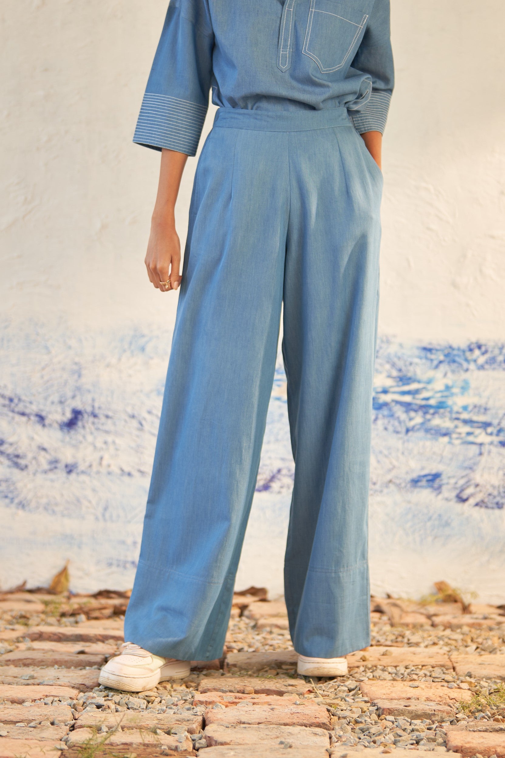 Paired with pants featuring wide, full-length legs adorned with stylish broad folds at the bottom, this set ensures a comfortable fit with its elasticated waistband.