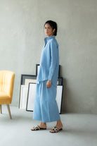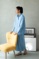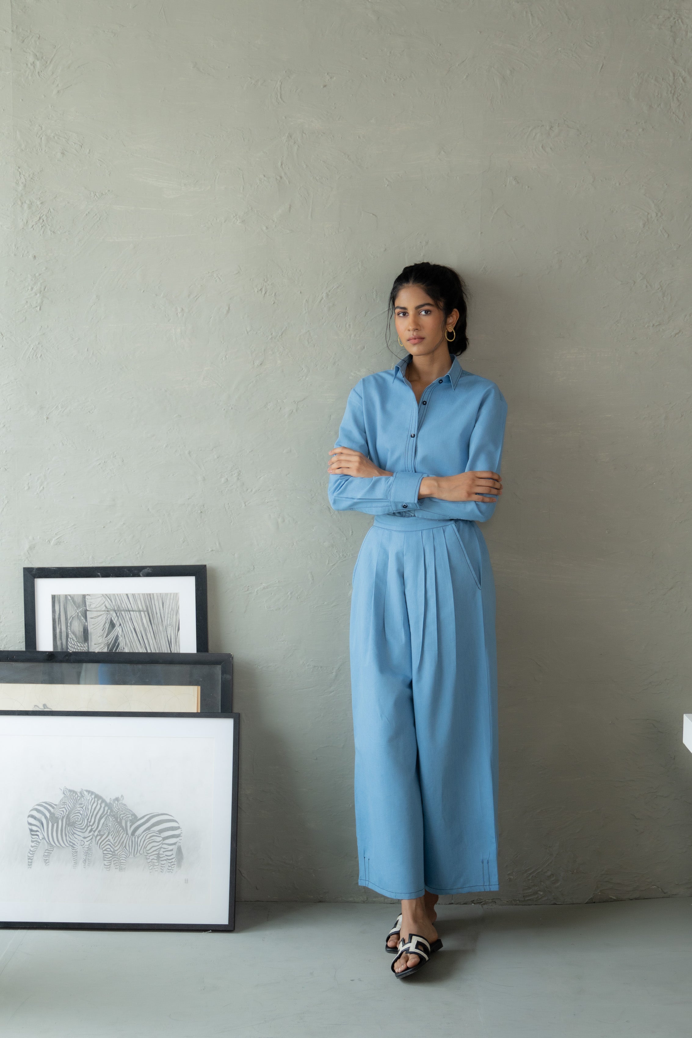 The Everyday Voyager Set redefines classics with a modern edge. The asymmetric shirt, crafted in soft cotton denim, is tailored in a relaxed shape and features a unique asymmetric placket that creates a pleated panel on the left side. Sharp black stitch detailing adds a touch of refinement to the look. Paired with elasticated box-pleat pants which feature a half-elasticated waist with a button for a customized fit, while the inverted box pleats add sophistication and structure. Perfect for versatile styling, from casual gatherings to elevated daywear.
