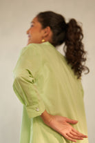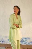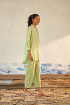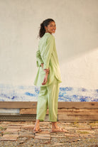 Cool and refreshing as you approach a breezy fountain. The top boasts a band collar with a V-cut, cross-placket lapel, and shell buttons, perfectly complemented by pleated elasticated waistband pants.