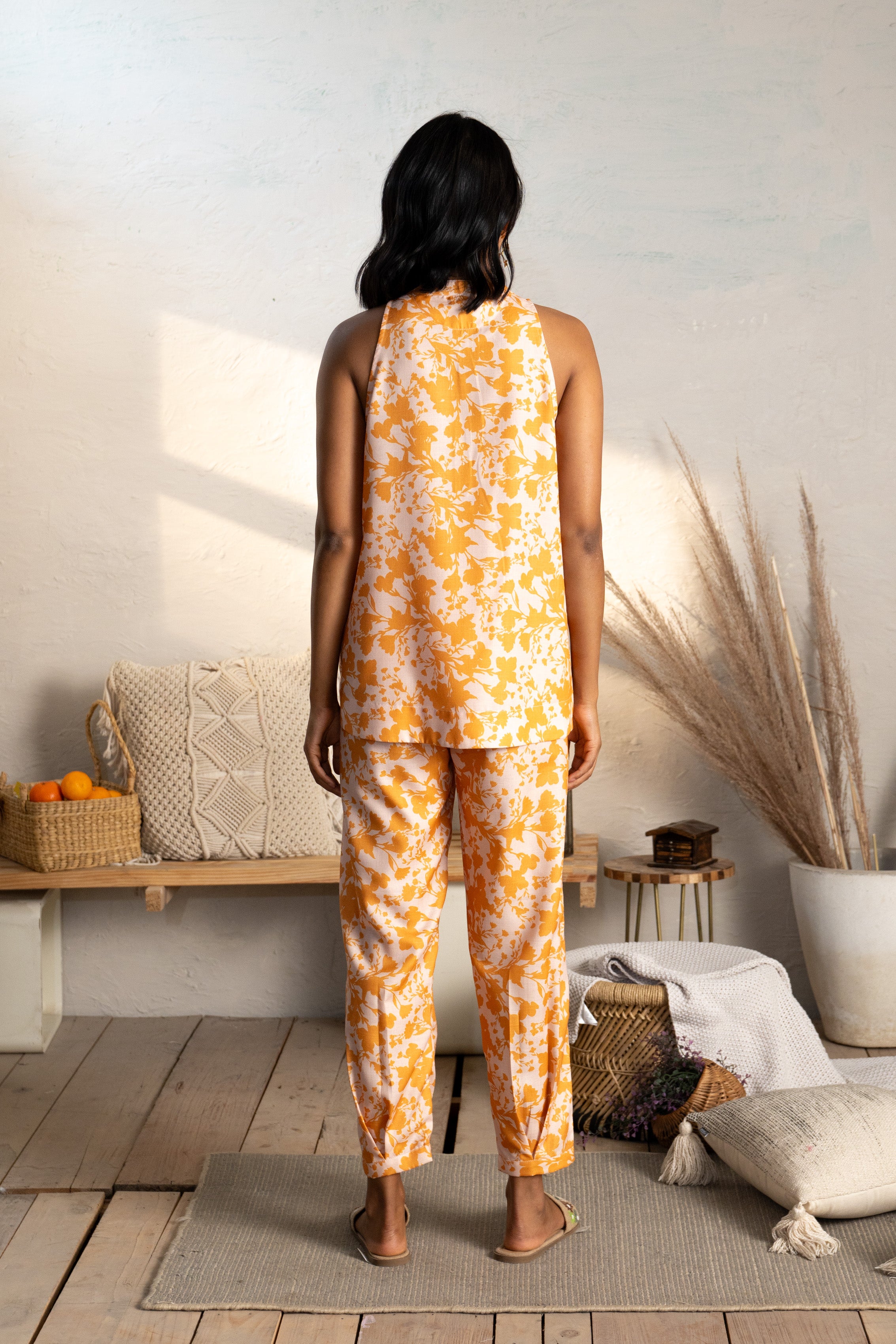 Celebrate the serene beauty of lush grasslands with the Grassland Patio Set, designed in a vibrant yellow hue that reflects the rich textures of nature. The halter-sleeve top, adorned with a sophisticated band collar, exudes effortless elegance. Paired with matching pants featuring a subtly gathered hem, elasticated waist, and functional side pockets, this set combines comfort and charm. Perfect for leisurely strolls or spontaneous outdoor adventures, it’s a versatile addition to your wardrobe.