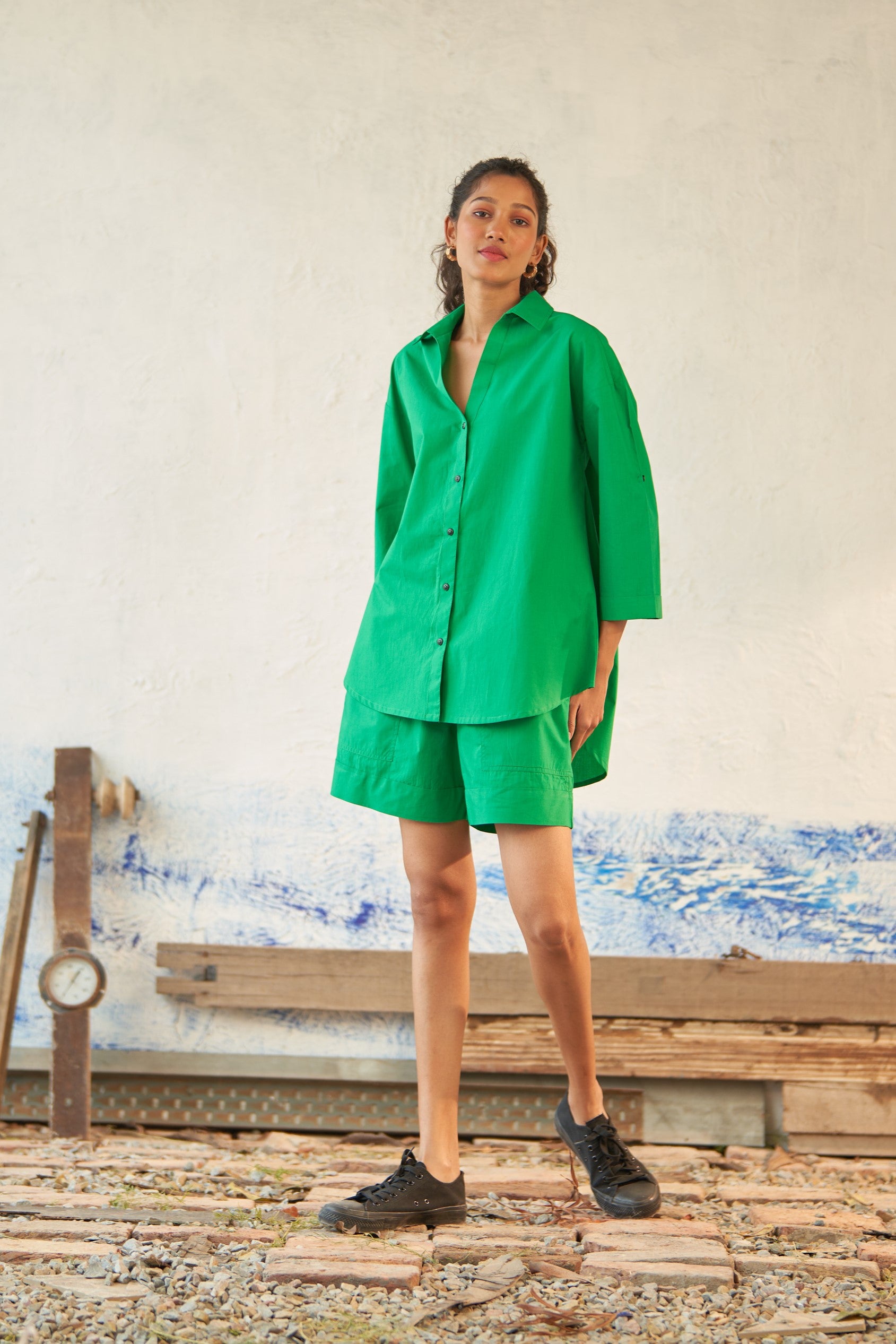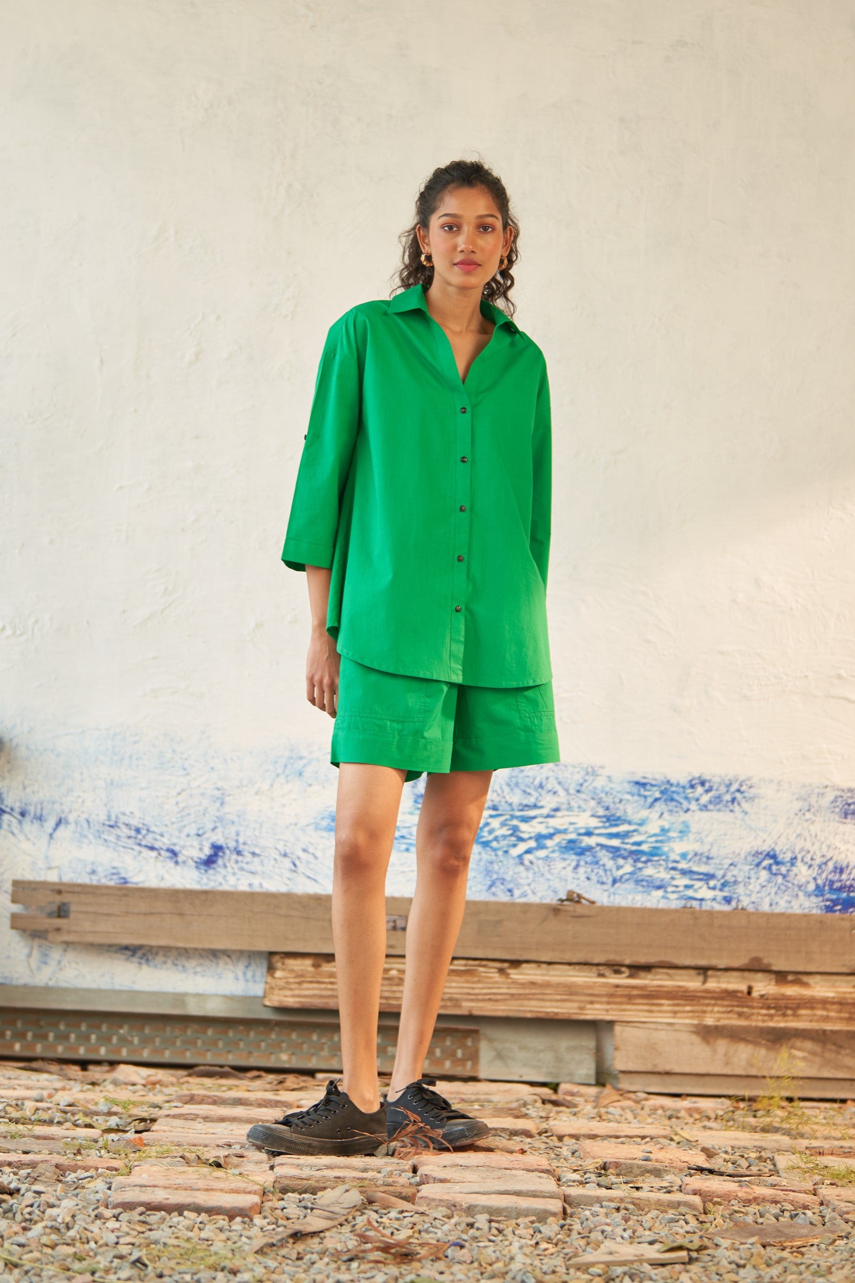 Embrace the zest in this vibrant green co-ord set, perfect for an adventure-filled day to evening. The oversized shirt features a flattering V-neck and elegant shell buttons, complemented by matching shorts with a convenient half elastic waistband and flap pockets. Hidden Code: ‘GOGREEN’ for 8% off