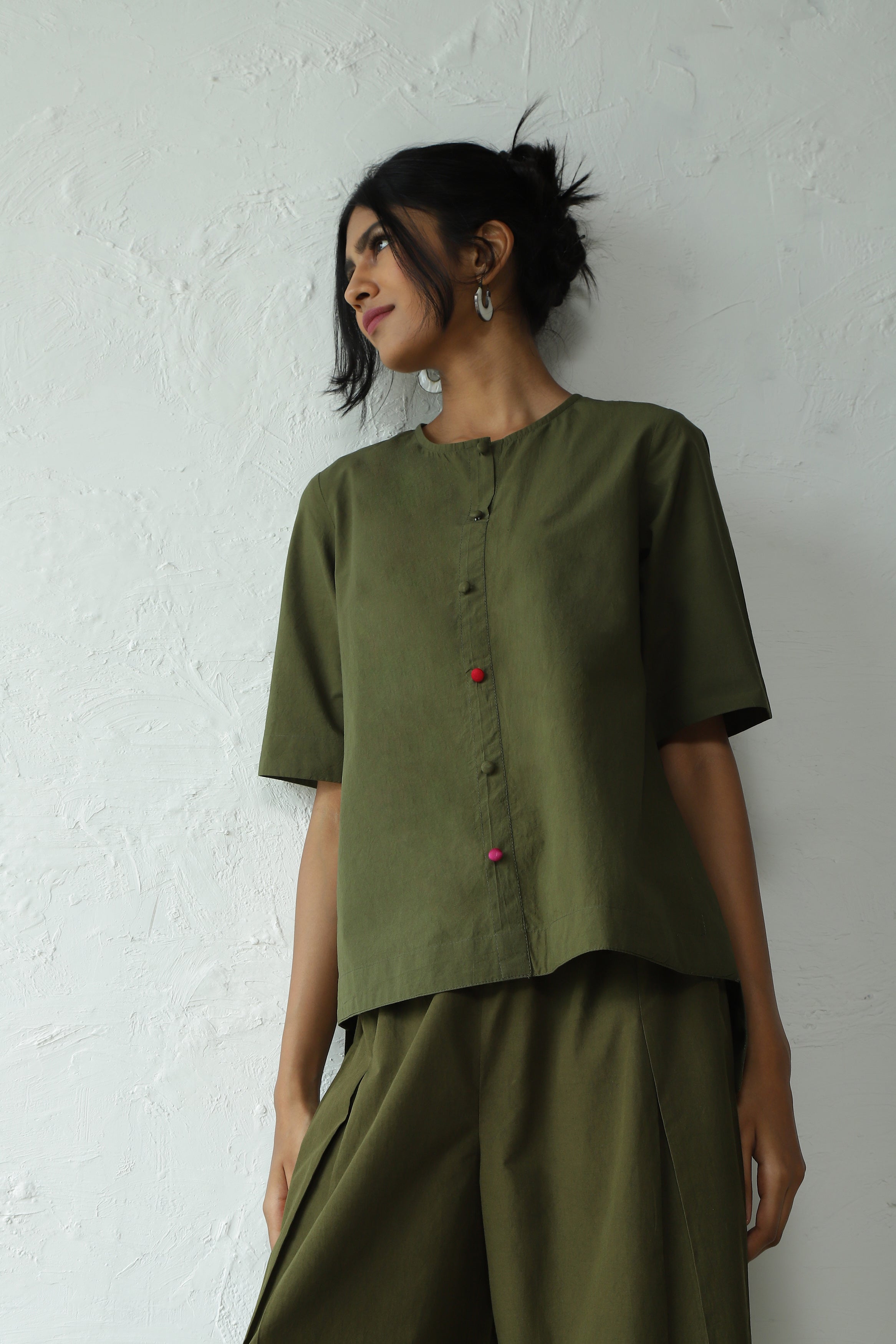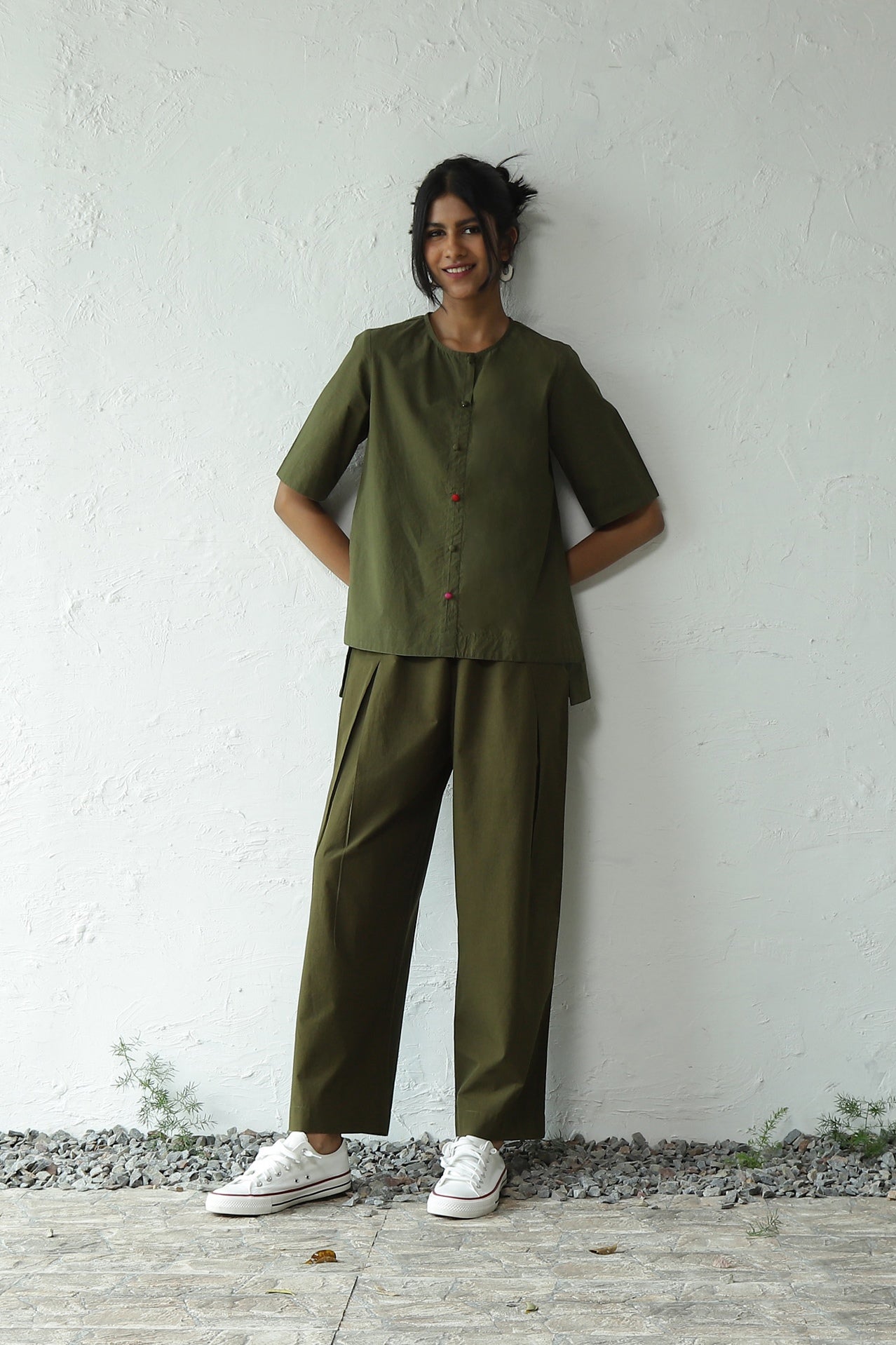 This green Hi-lo co-ord is one of our favourites from Canoopi. The tiered hem top is crafted from crisp cotton poplin with a round neckline and dome fabric buttons that add another dimension to the silhouette. The touch of contrast pink and red buttons add a hint of color pop. Paired with matching pants that are tailored with wide, full-length legs with front and back inward pleats for shape. Elevate your summer style with this co-ord set