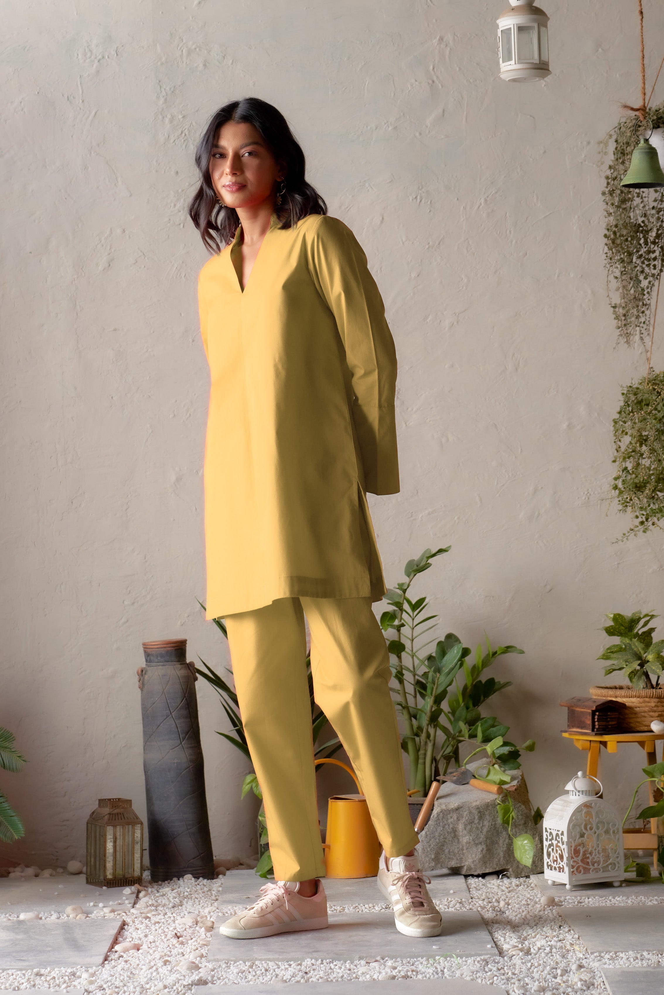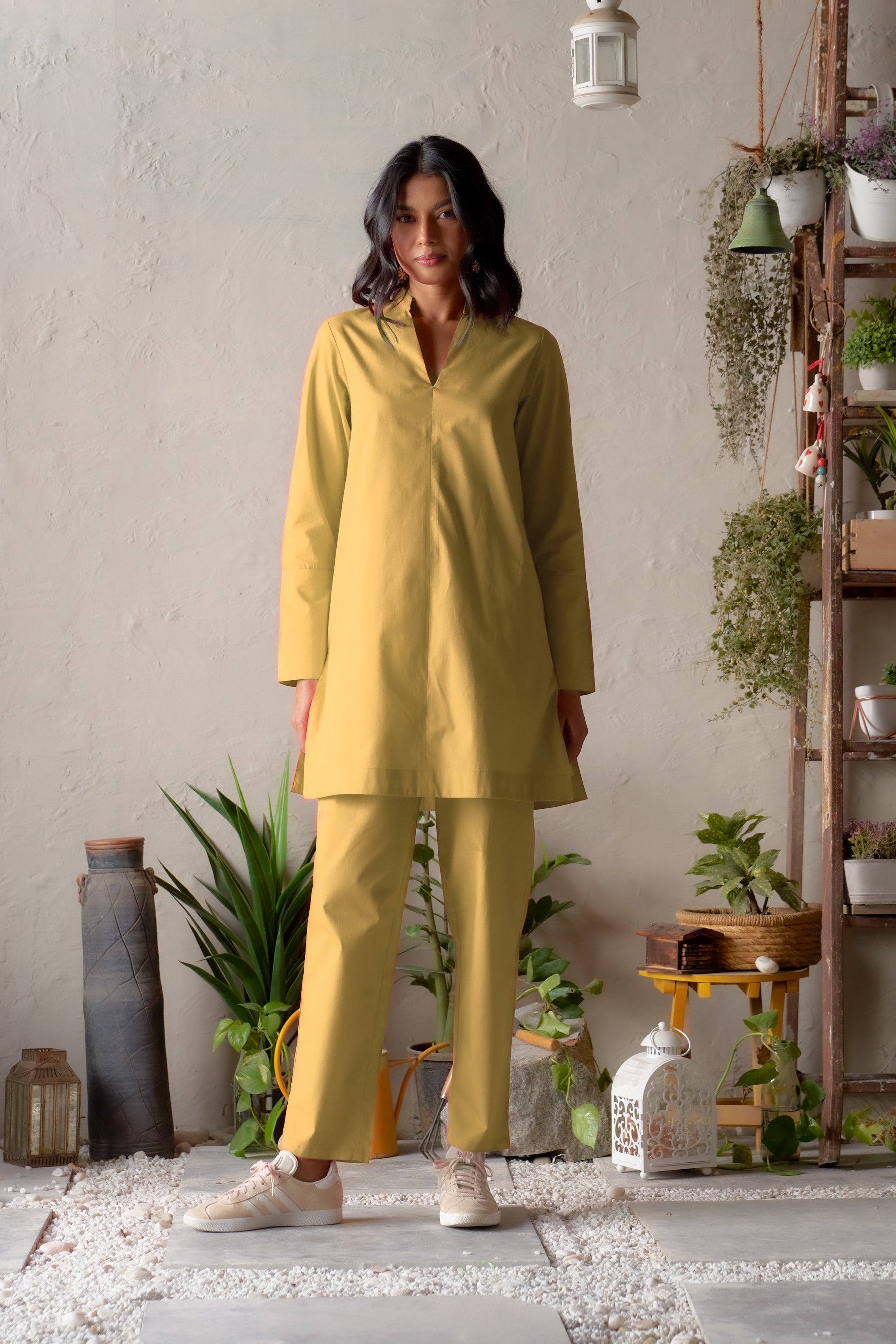 Portico Set captures the warmth and optimism of first light. Crafted in a serene soft yellow hue, it features a mid-length straight kurta with a refined V-neck band collar and elevated side slits for graceful movement. Full-length sleeves lend structure, while the straight pants provide effortless comfort and ease. Fresh, understated, and quietly elegant — this set is perfect for moments when you want to feel both polished and softly radiant.
