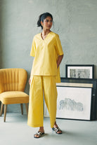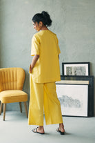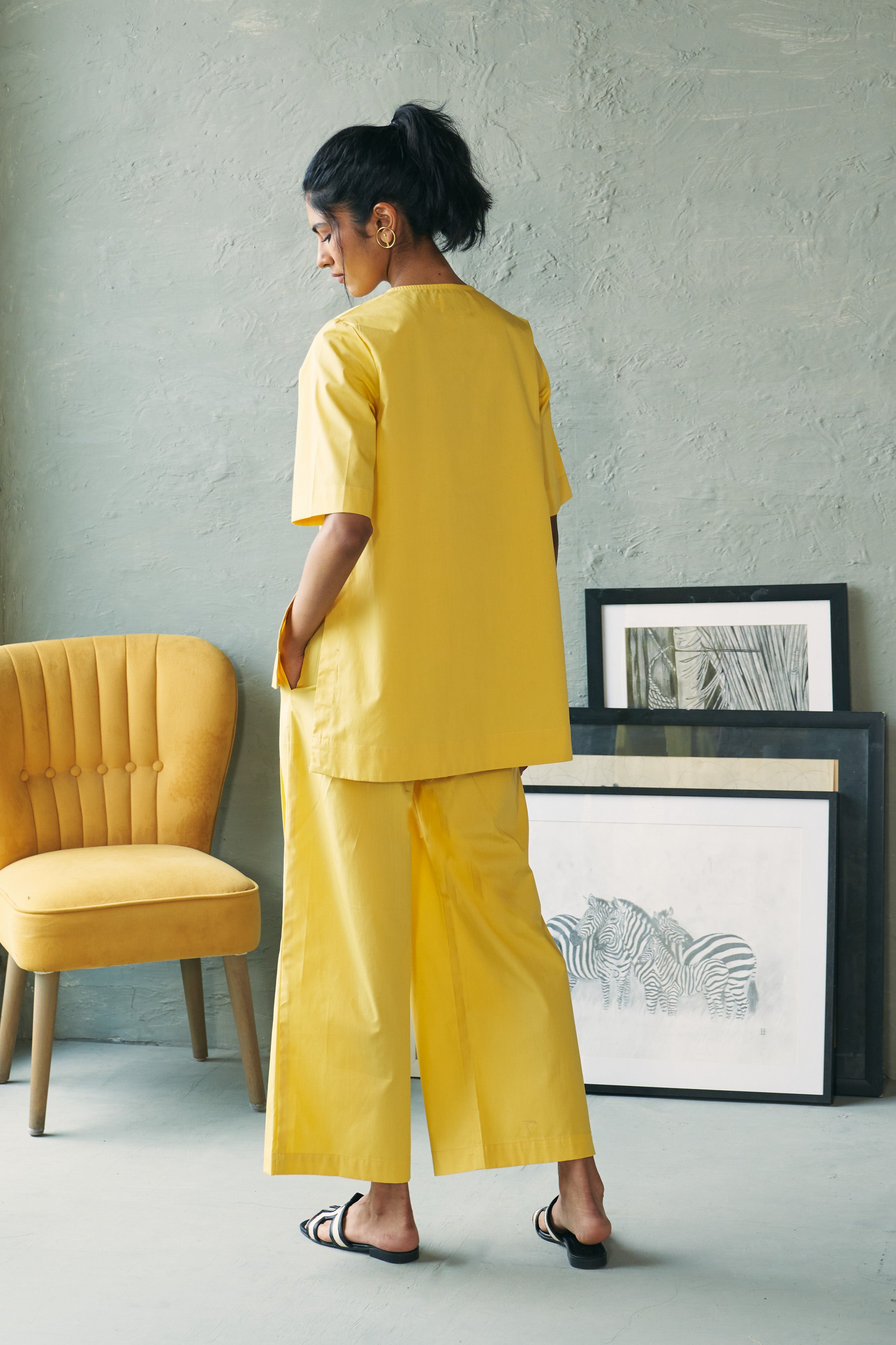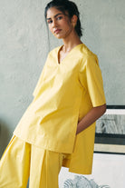 Bright and breezy in soft yellow, the Mahira Hi-Lo Coord Set is crafted from crisp cotton poplin for lightweight comfort. The V-neck tiered hem top lends gentle volume and movement, while the matching wide-leg pants are tailored with front and back inward pleats for a flattering, relaxed silhouette. A sunshine-ready co-ord designed for easy days and polished moments alike.