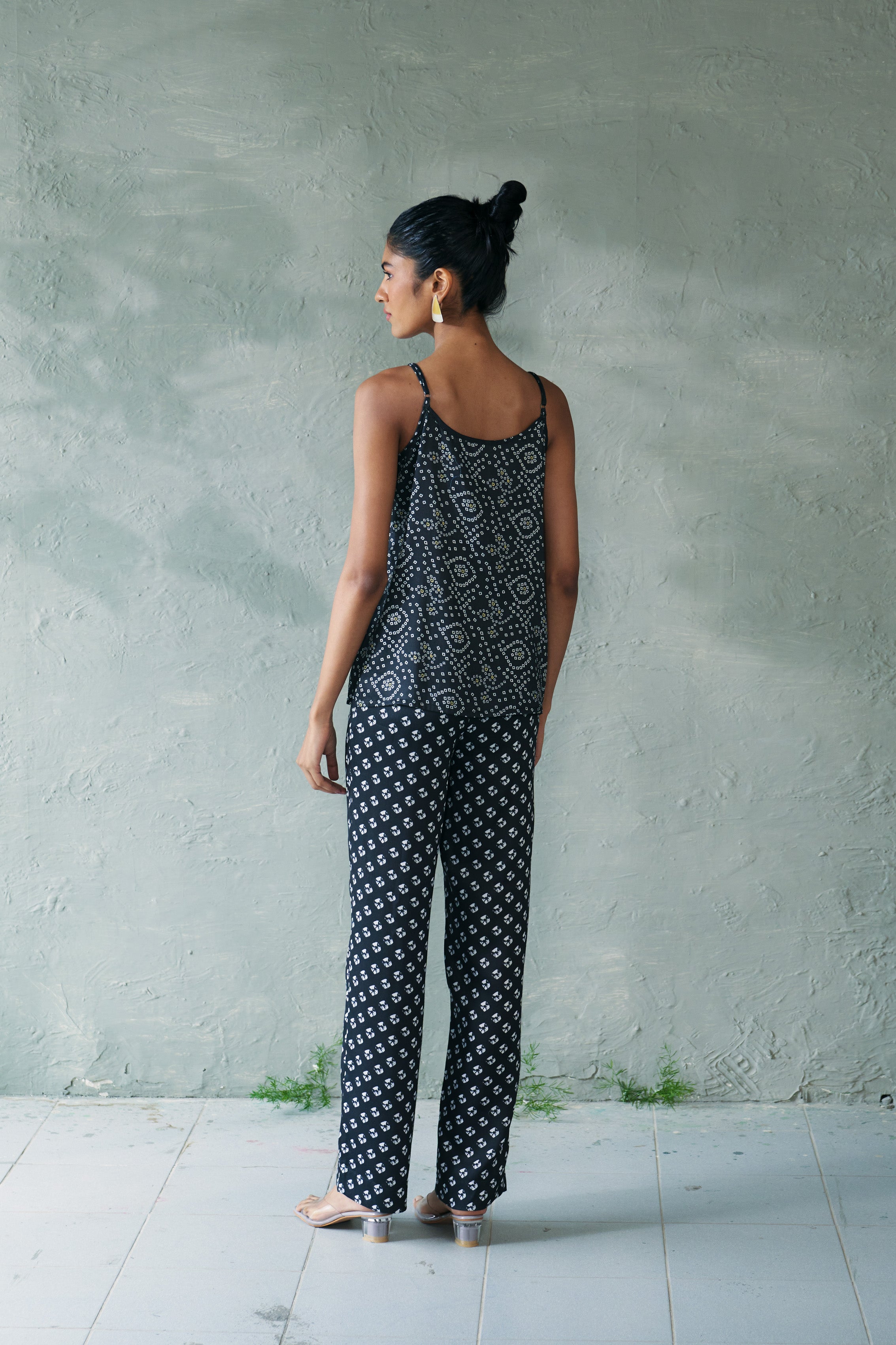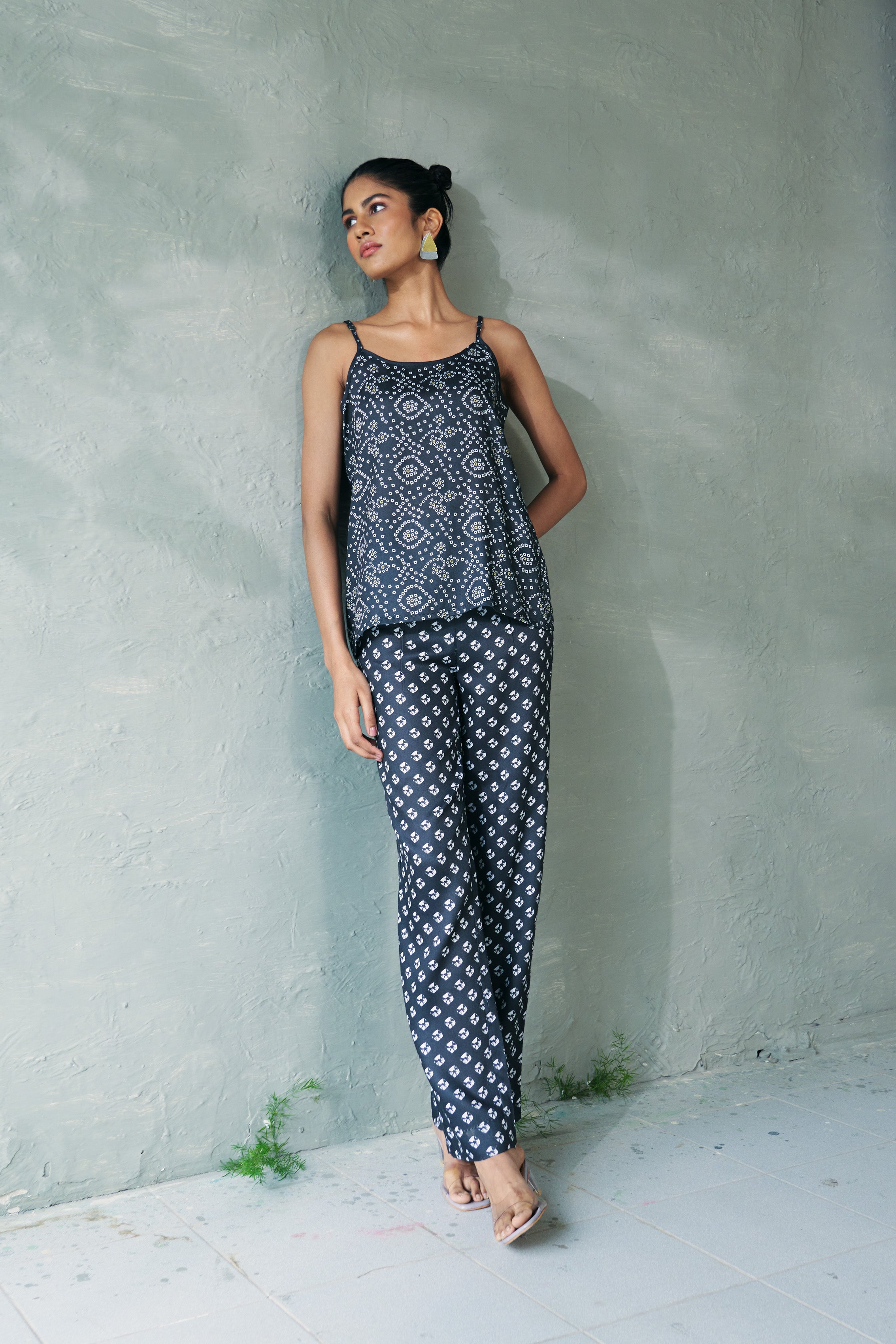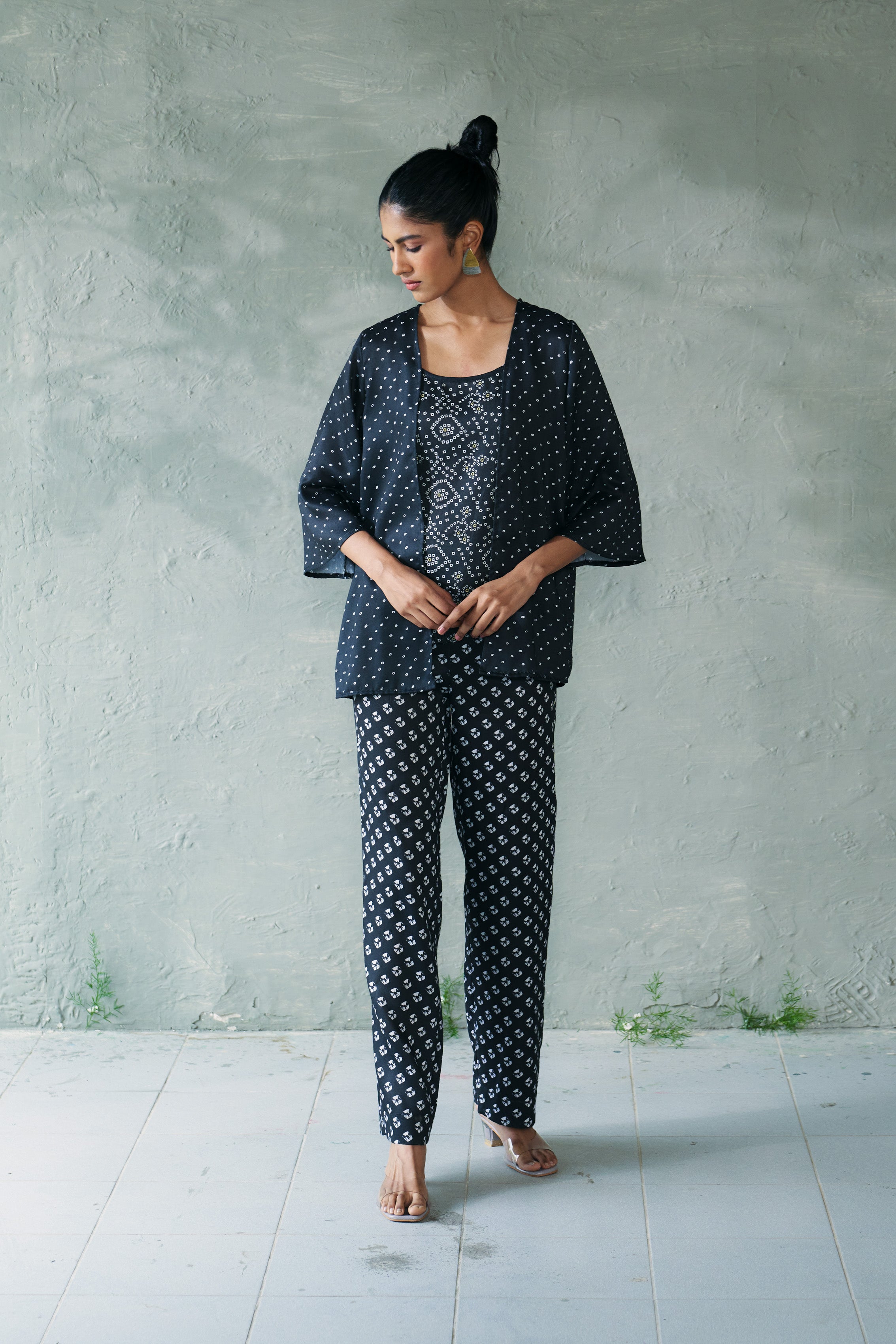 The Midnight Bandhani Set brings together fluid comfort and subtle drama. Crafted in a midnight-hued mix of bandhani print, this 3-piece set includes a delicate spaghetti top and straight pleated pants with side zipper—perfect for easygoing evenings or slow weekend moments. Complete the look with an optional lightweight overlay (optional) that adds effortless layering and comfort when needed. A versatile wardrobe companion for semi-casual outings and everyday discoveries.