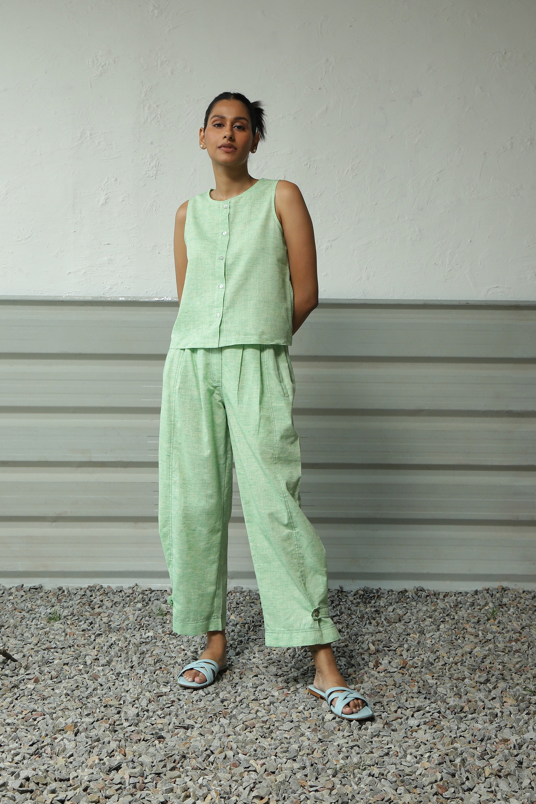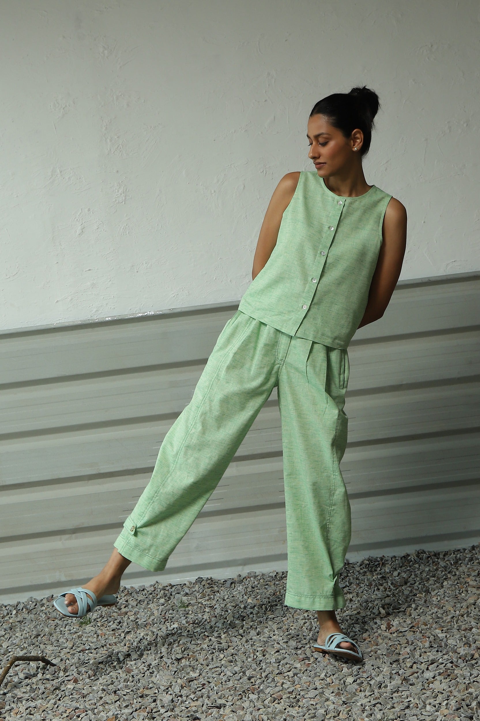 The crop top boasts a relaxed fit and a neat buttoned placket. Paired with our adaptable pants, which effortlessly switch from flared to sleek with a side button loop, these textured cotton green pants feature loops, intricate double-stitch, side pockets, and delicate pleats, this co-ord set is your ultimate travel essential.