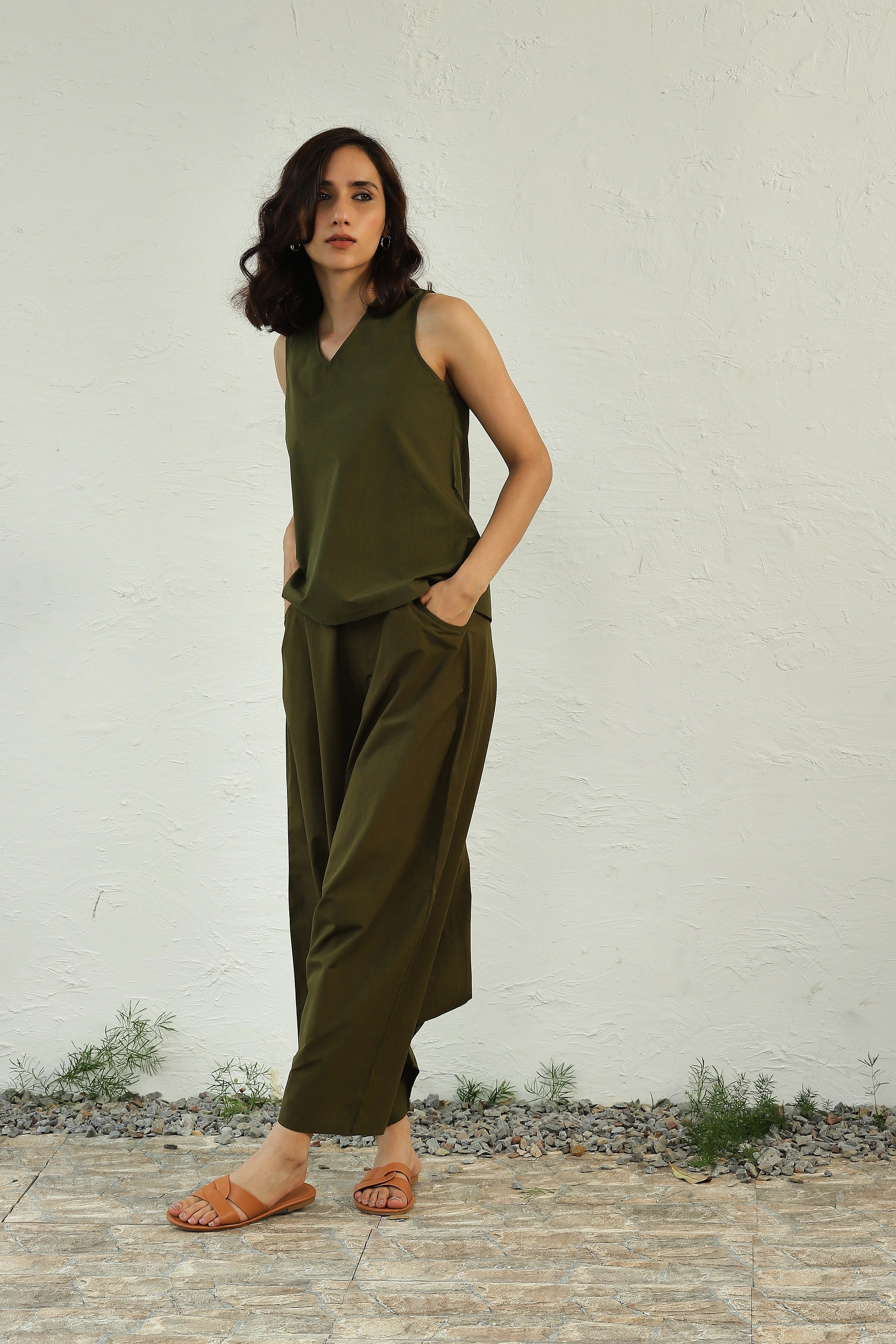Olive Co-ord Set, Ready to Set the Streets on Fire! This captivating combination includes a sleeveless top and harem pants. Revel in luxury through premium poplin cotton craftsmanship. The top boasts a versatile neckline and an airy silhouette, while the pants feature a dramatic flare at the center. This stylish co-ord ensemble is a look that will undoubtedly capture your heart.
