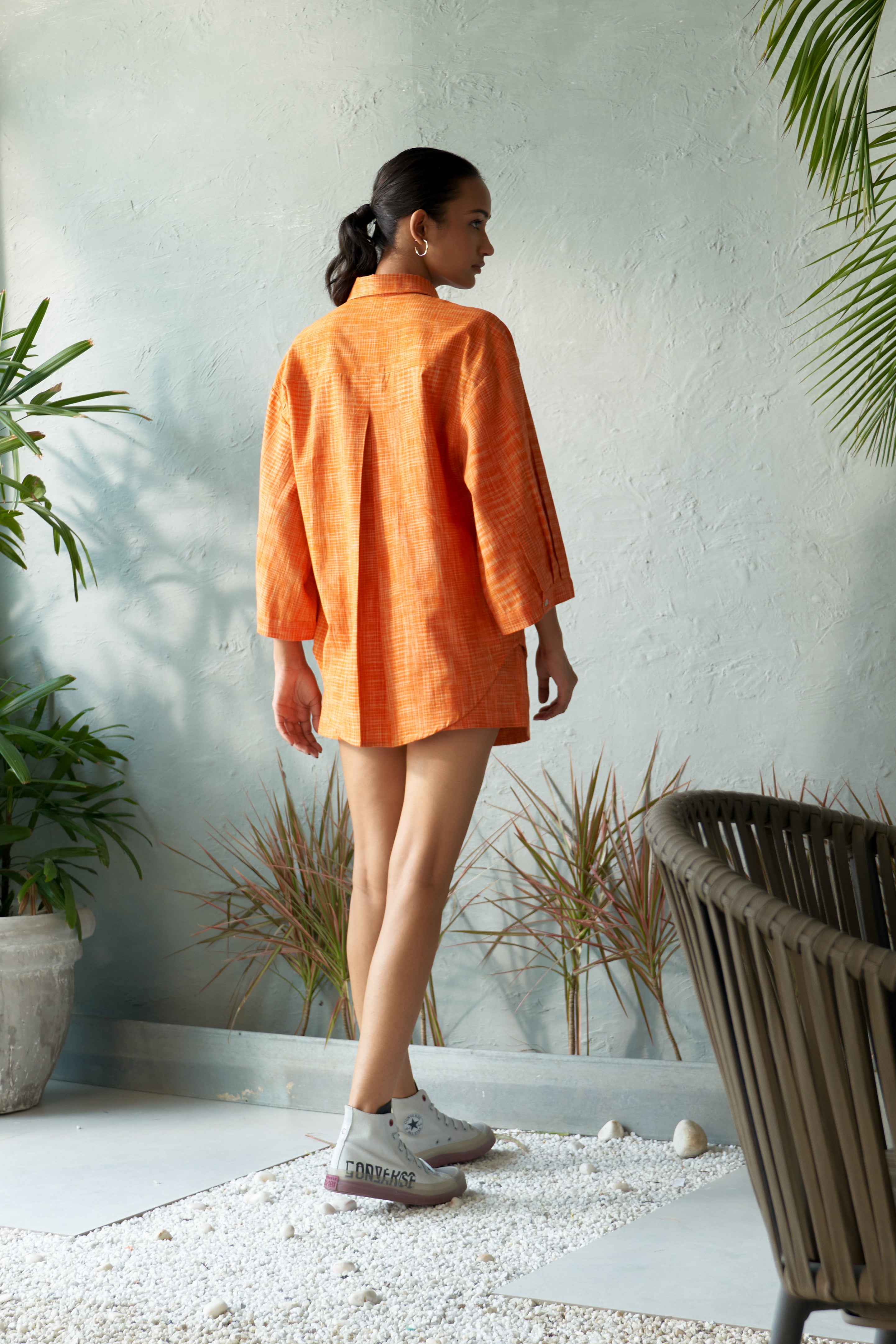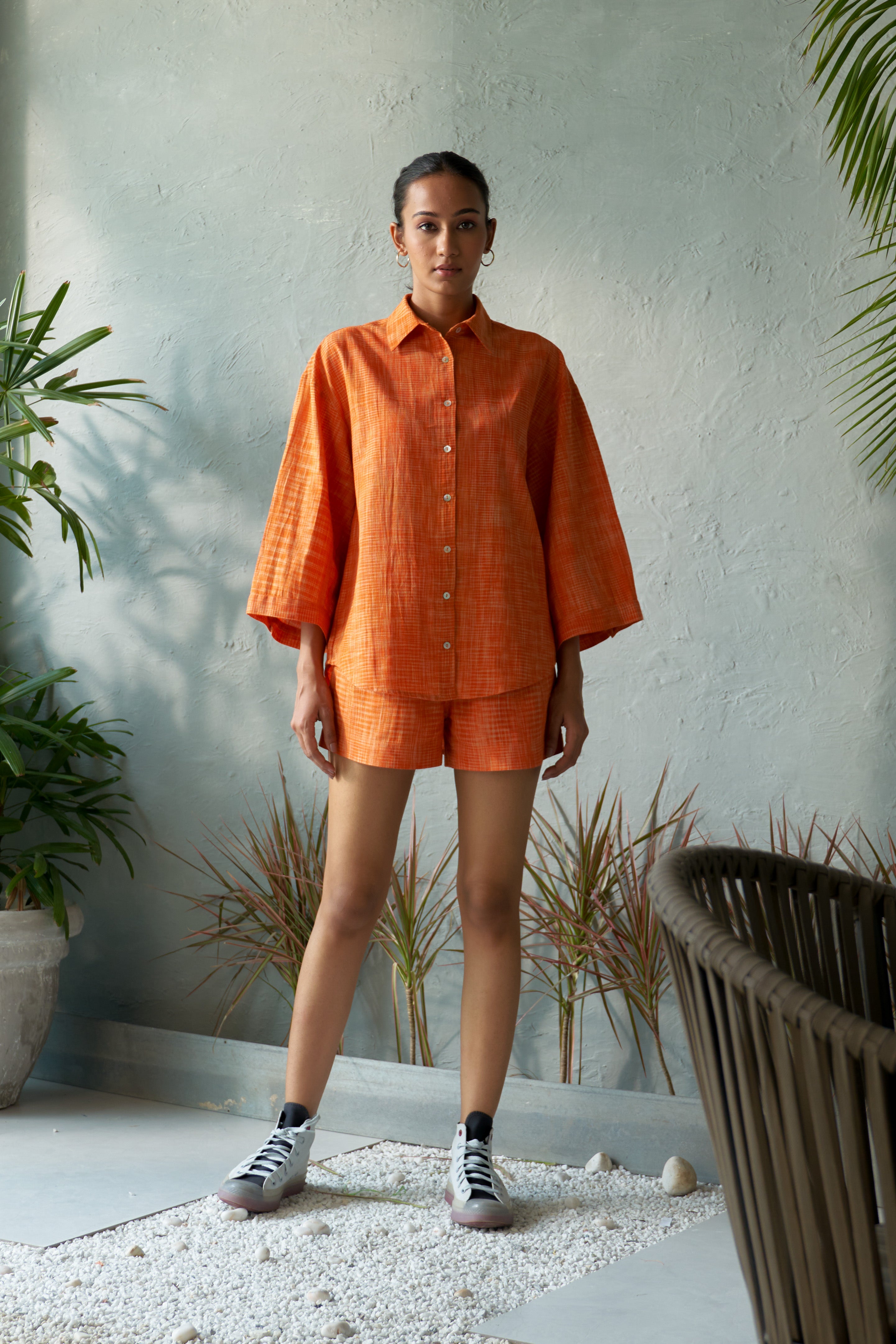 The "Orangeade Coord" is a lively and stylish set crafted from breathable textured premium cotton. The hi-lo silhouette top features loose 3/4th sleeves with elegant pleat detailing on the cuffs, offering a blend of elegance and ease. Paired with tailored shorts featuring a fixed waist and chic front pleats, this coord radiates a cheerful pop of bright orange, making it a standout choice for casual outings and vibrant summer days.