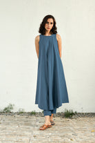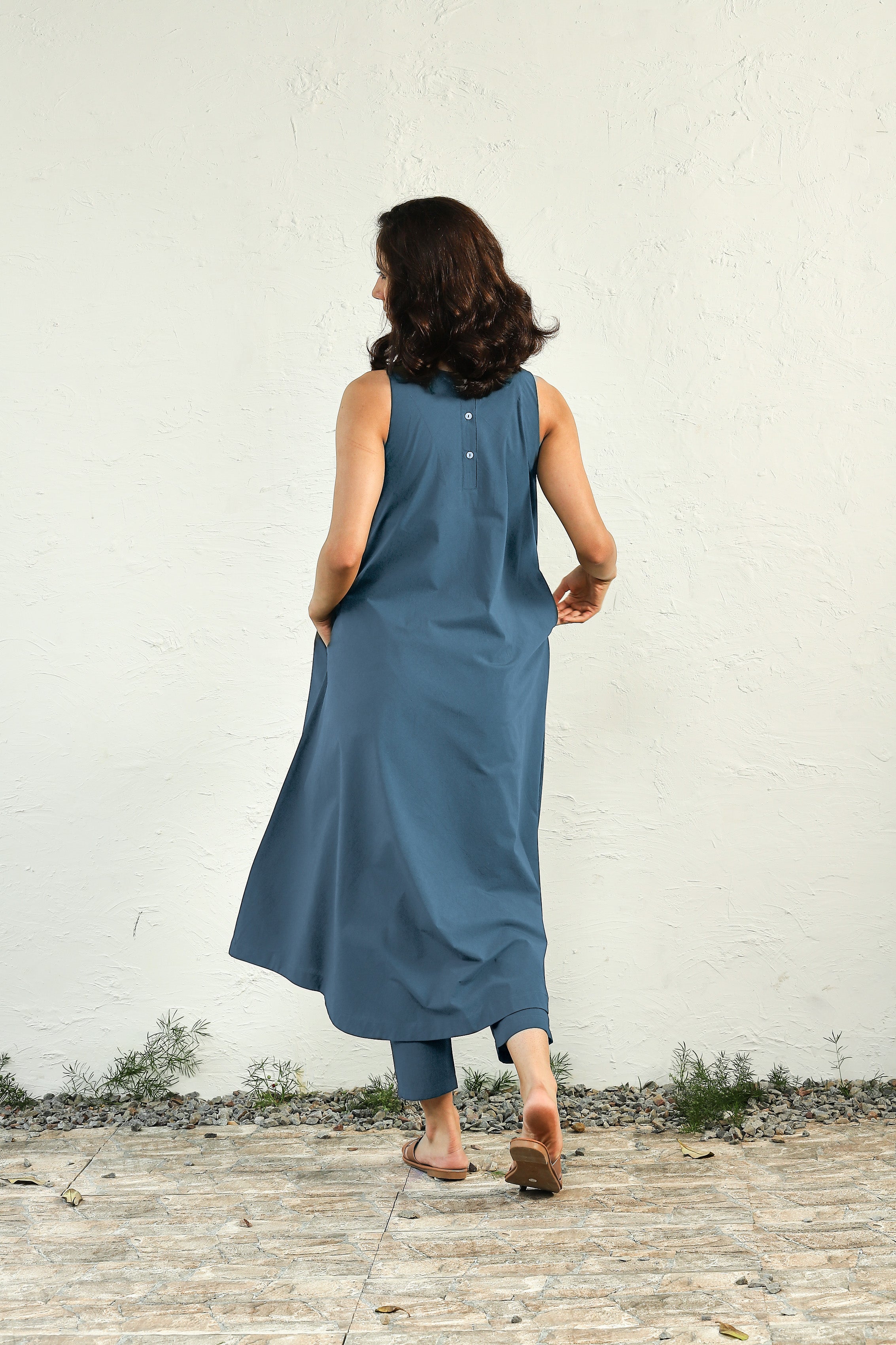 Crafted from premium cotton poplin fabric, it boasts a round neckline, deep shoulder cuts, and a u-shaped hemline that brings movement to every step. Paired with straight narrow pants featuring an elasticated waist and drawstring. The upper can double down as a dress allowing you to wear as per the new exploration.