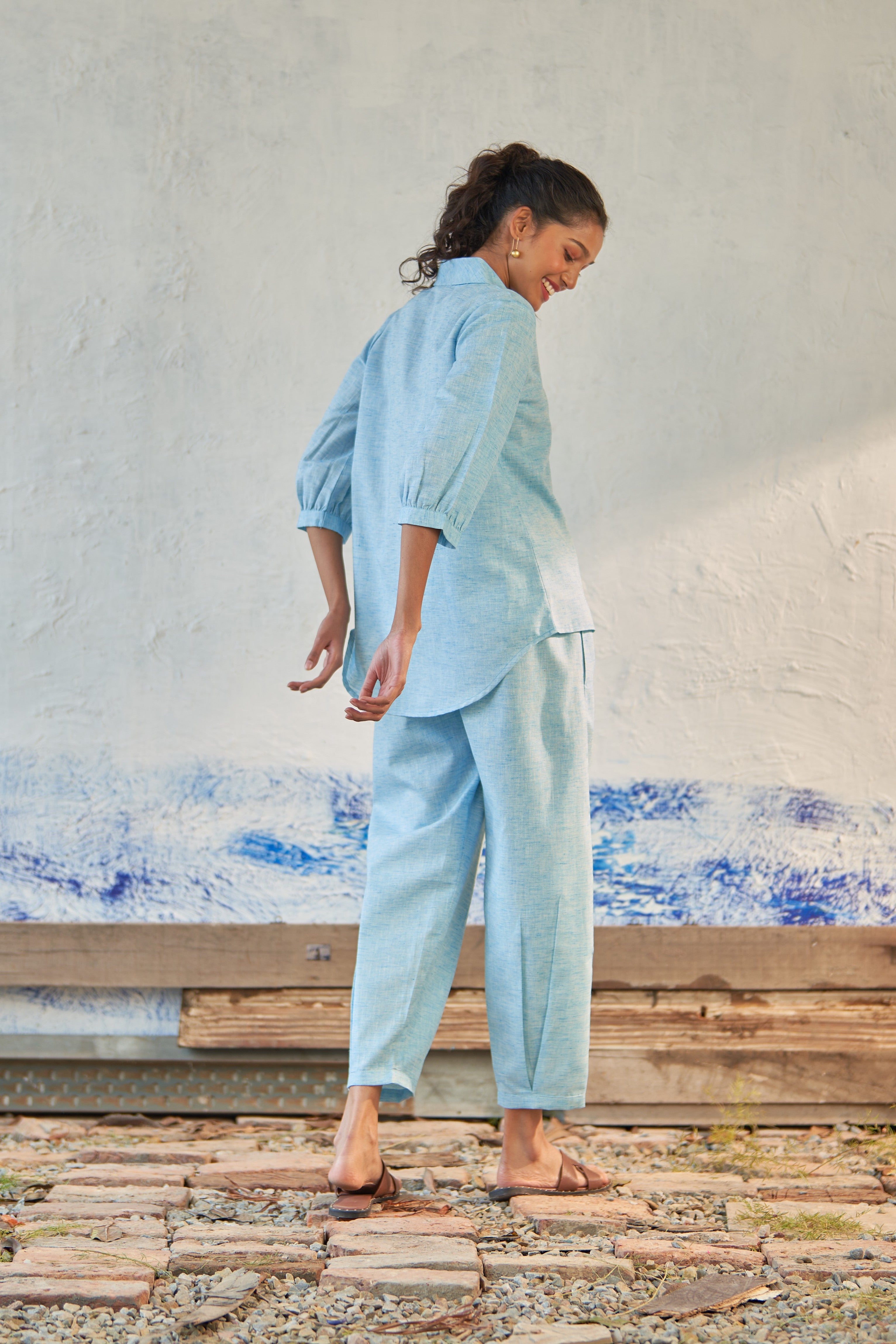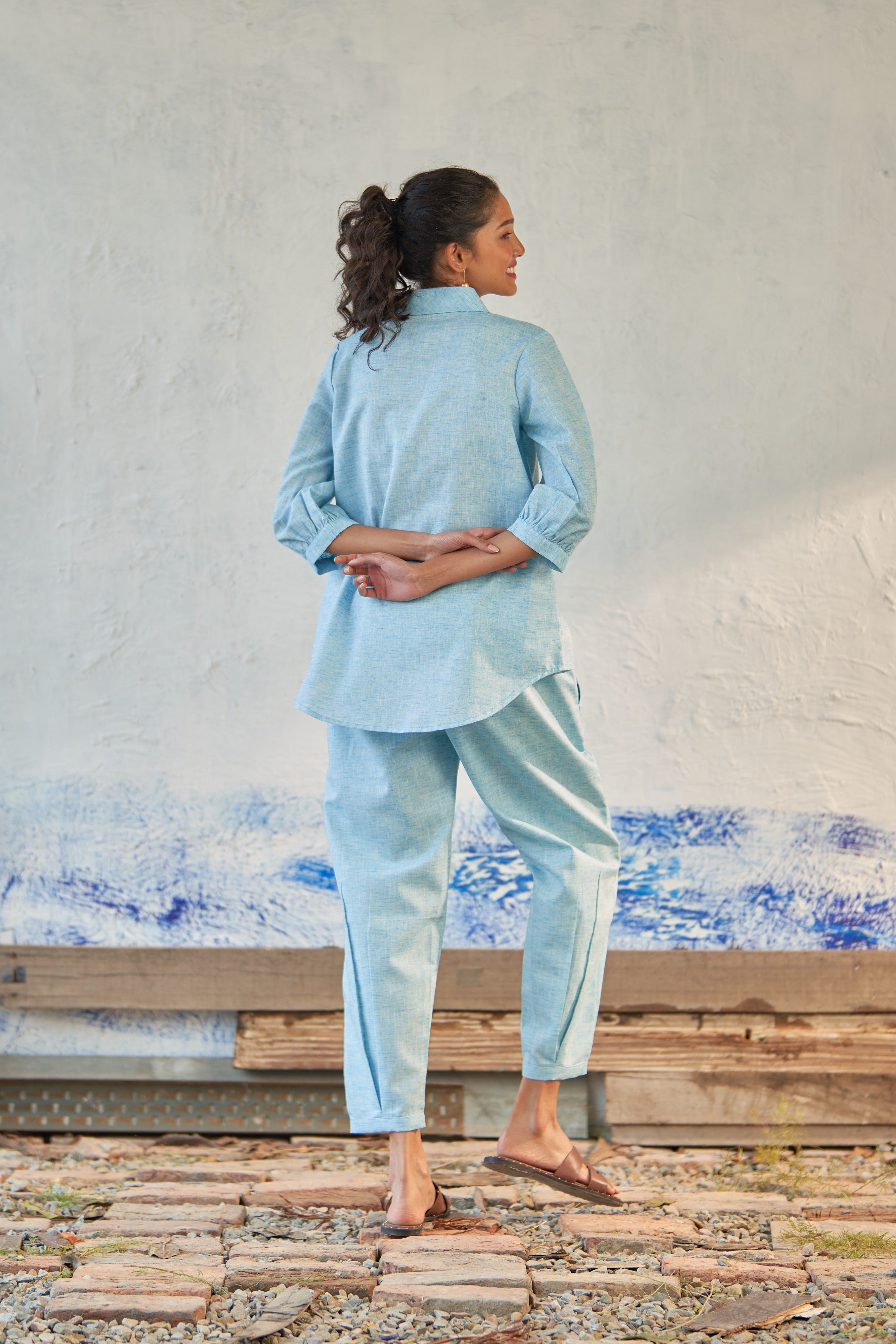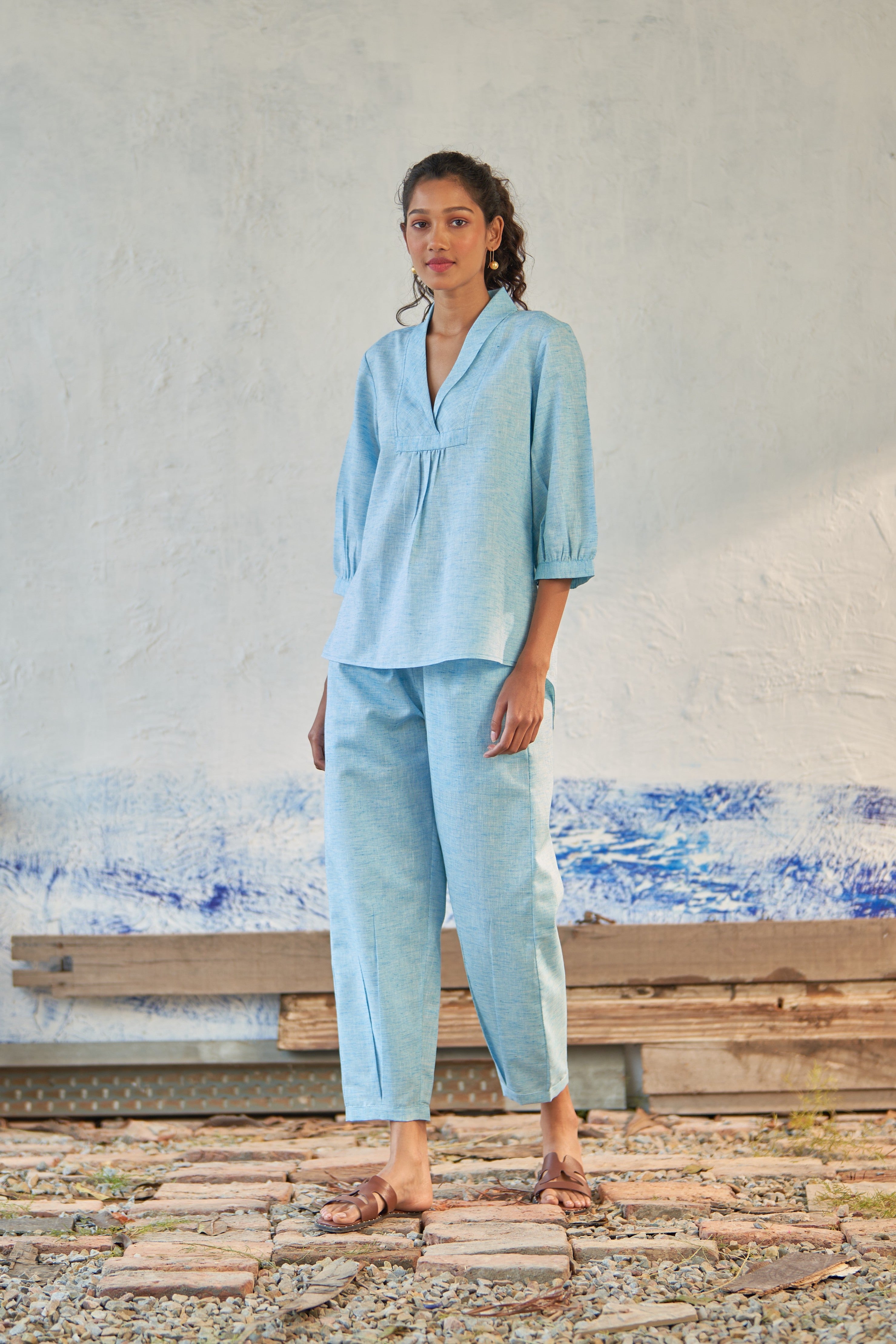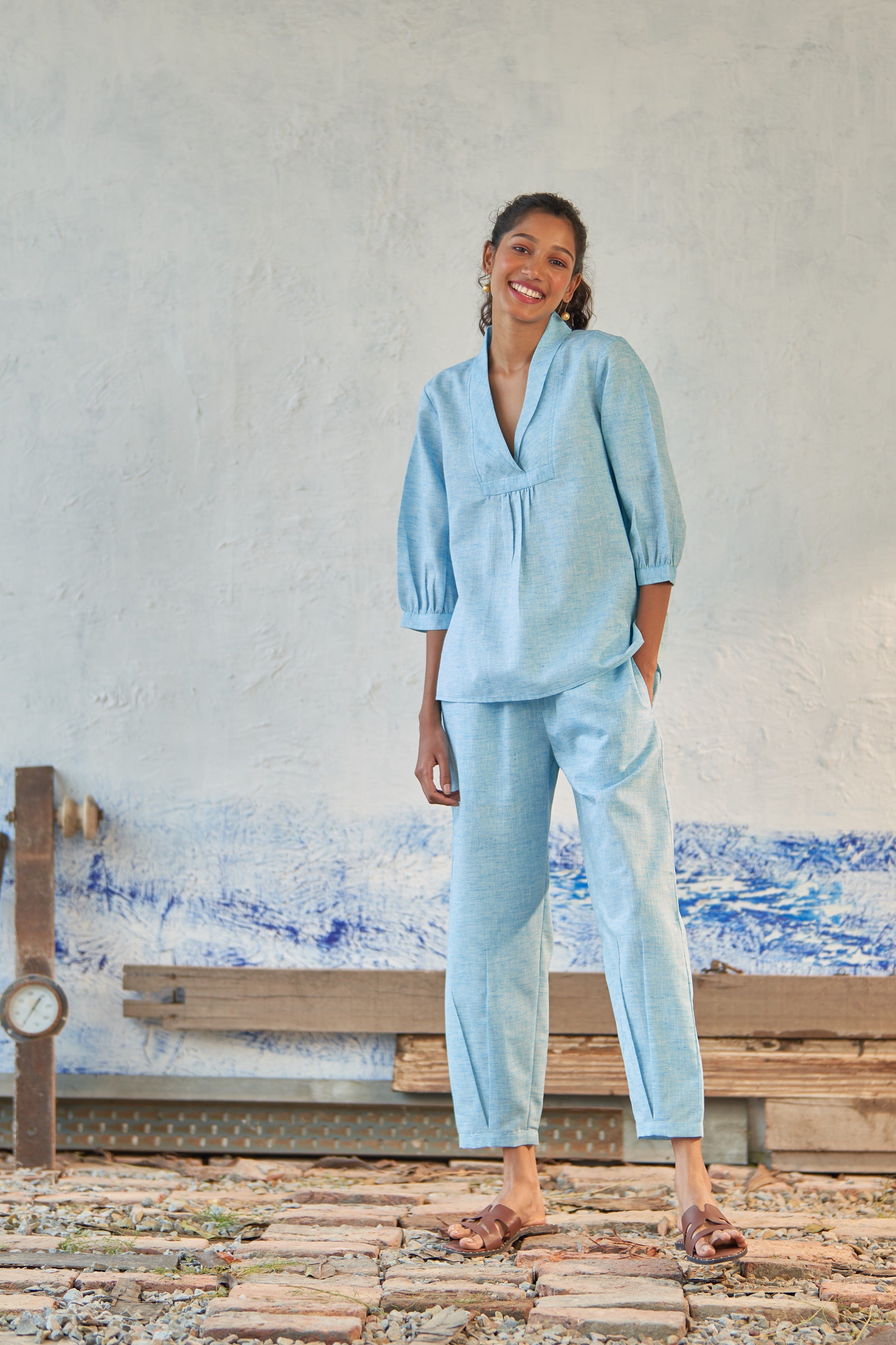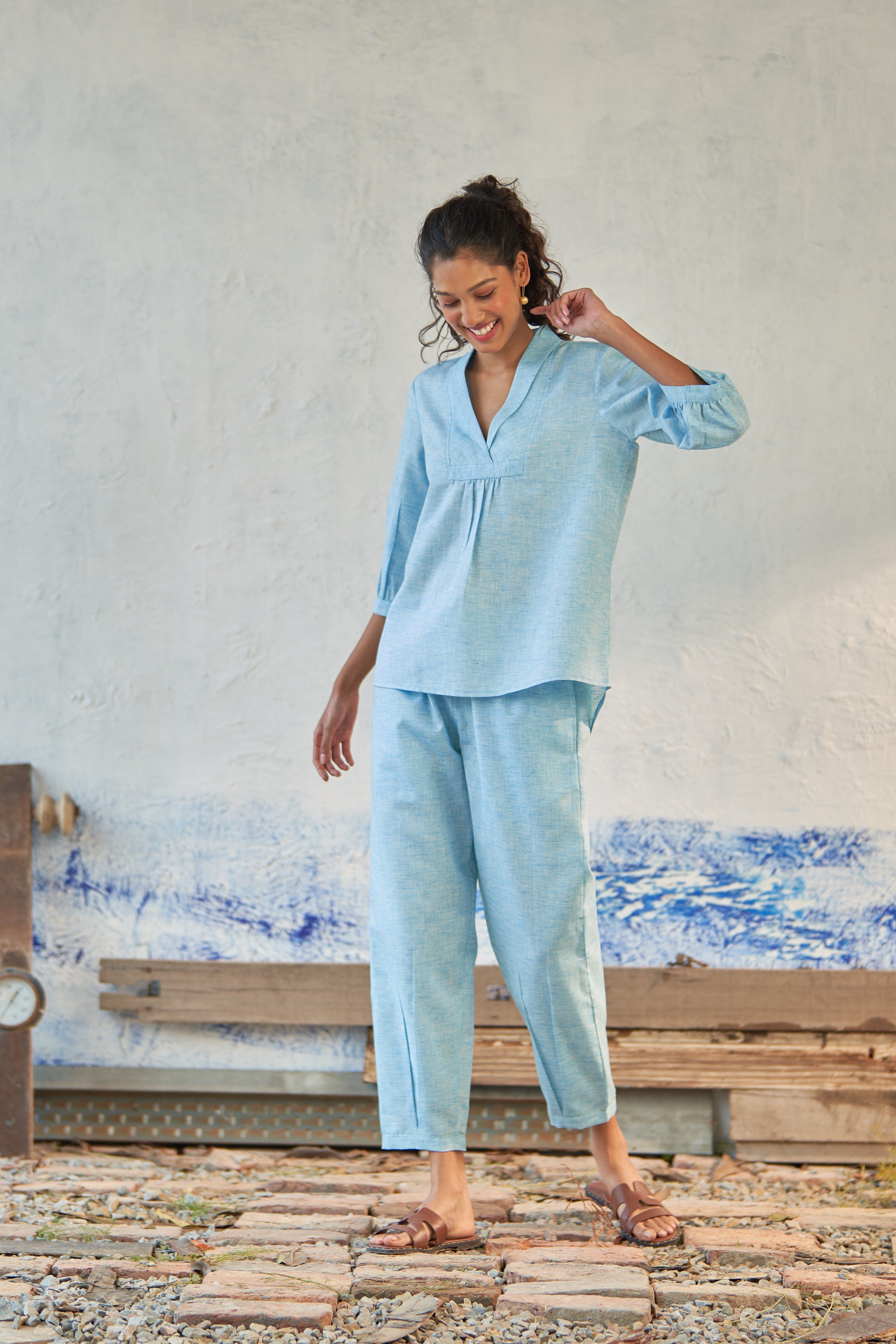 Indulge in the calming allure of a serene blue hue paired with the refreshing essence of summer frost in this delightful cotton top and bottom duo. With gentle gathers at the V-neckline enhancing its soft A-line silhouette, along with the U-cut hemline and lightly gathered cuff sleeves, elegance meets comfort effortlessly.