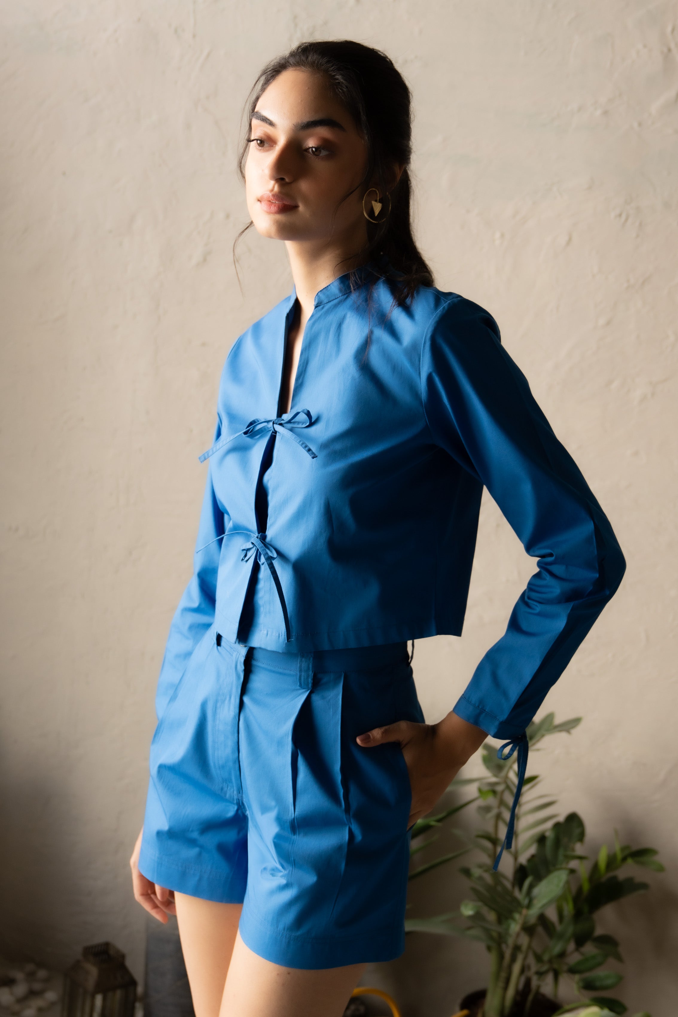 Zanshin, this coord set encourages mindful, effortless living. The cobalt blue 100% cotton poplin top features refined details, including tie-up strings on the front placket and sleeves, a mandarin collar, and a flattering V-neckline. Full sleeves lend an air of sophistication, making it suitable for any season. Paired with high-waisted shorts, designed with elegant pleats and functional side pockets, this set effortlessly combines style and practicality for everyday discoveries.