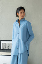 The Everyday Voyager Shirt is a modern twist on a classic. Crafted in soft cotton denim, it features an asymmetric placket that creates a pleated panel on the left side, lending visual intrigue. Sharp black stitch detailing highlights its contemporary tailoring, while the relaxed fit ensures effortless ease. A versatile piece that can be styled for workdays, casual outings, or layered for travel-ready comfort.