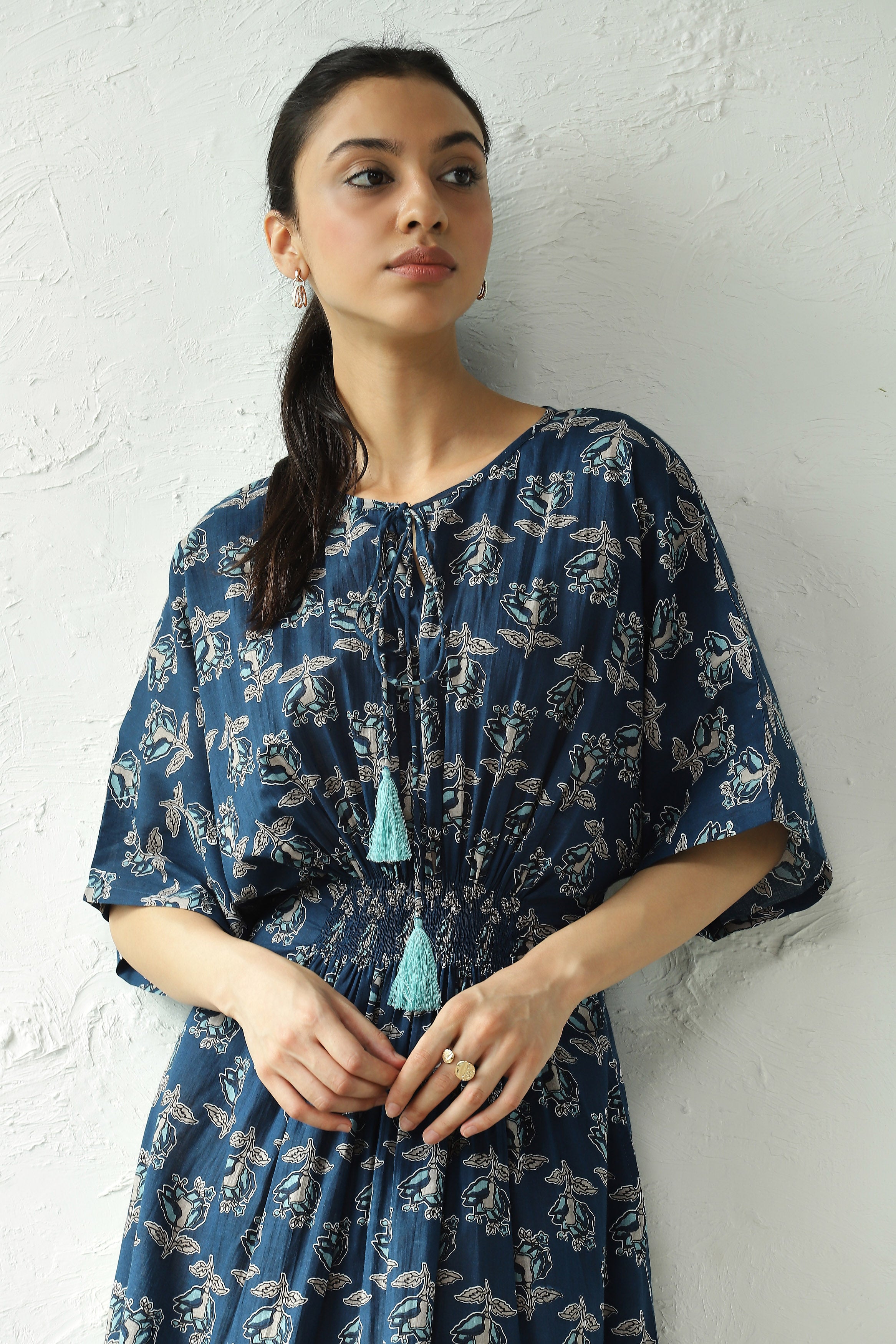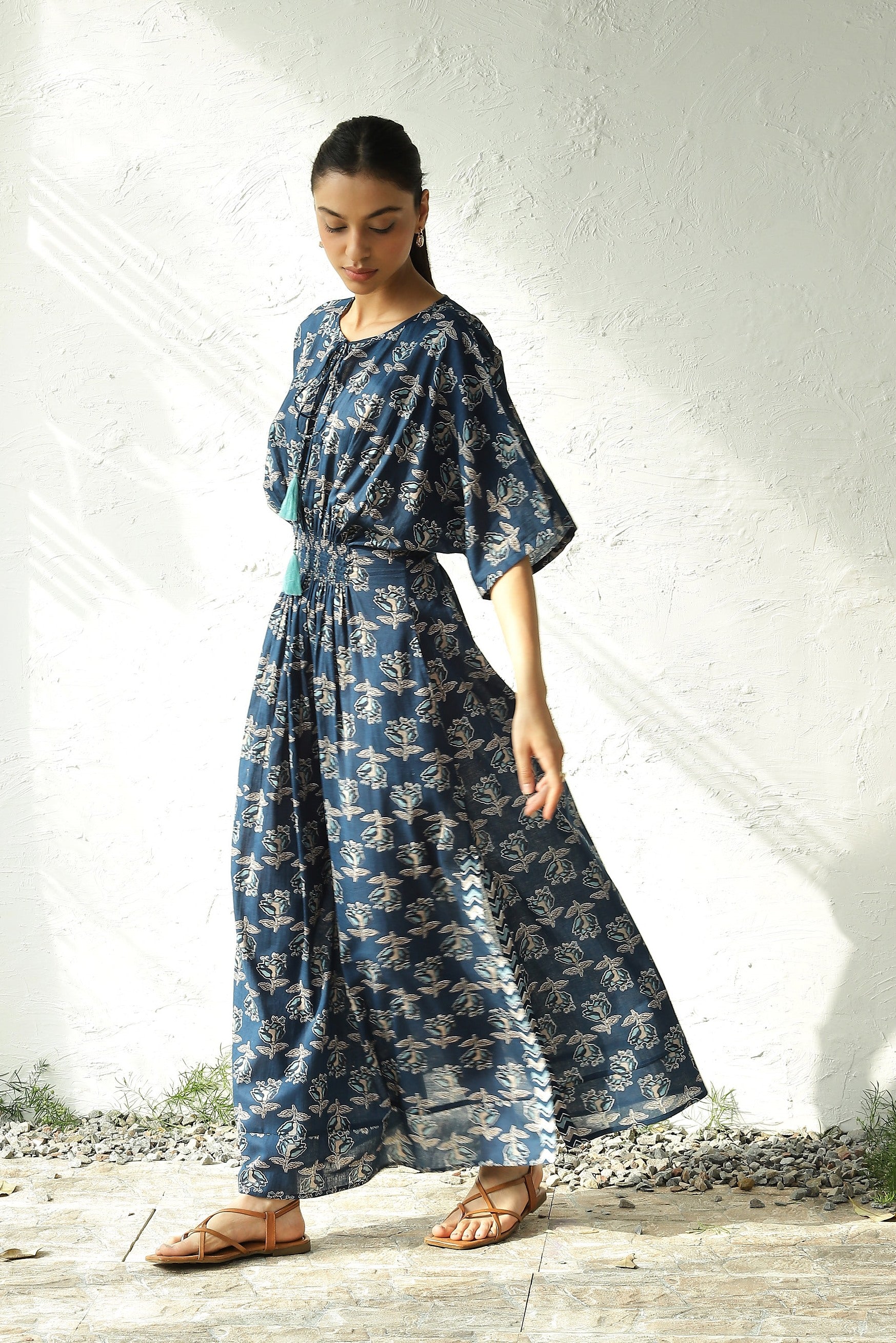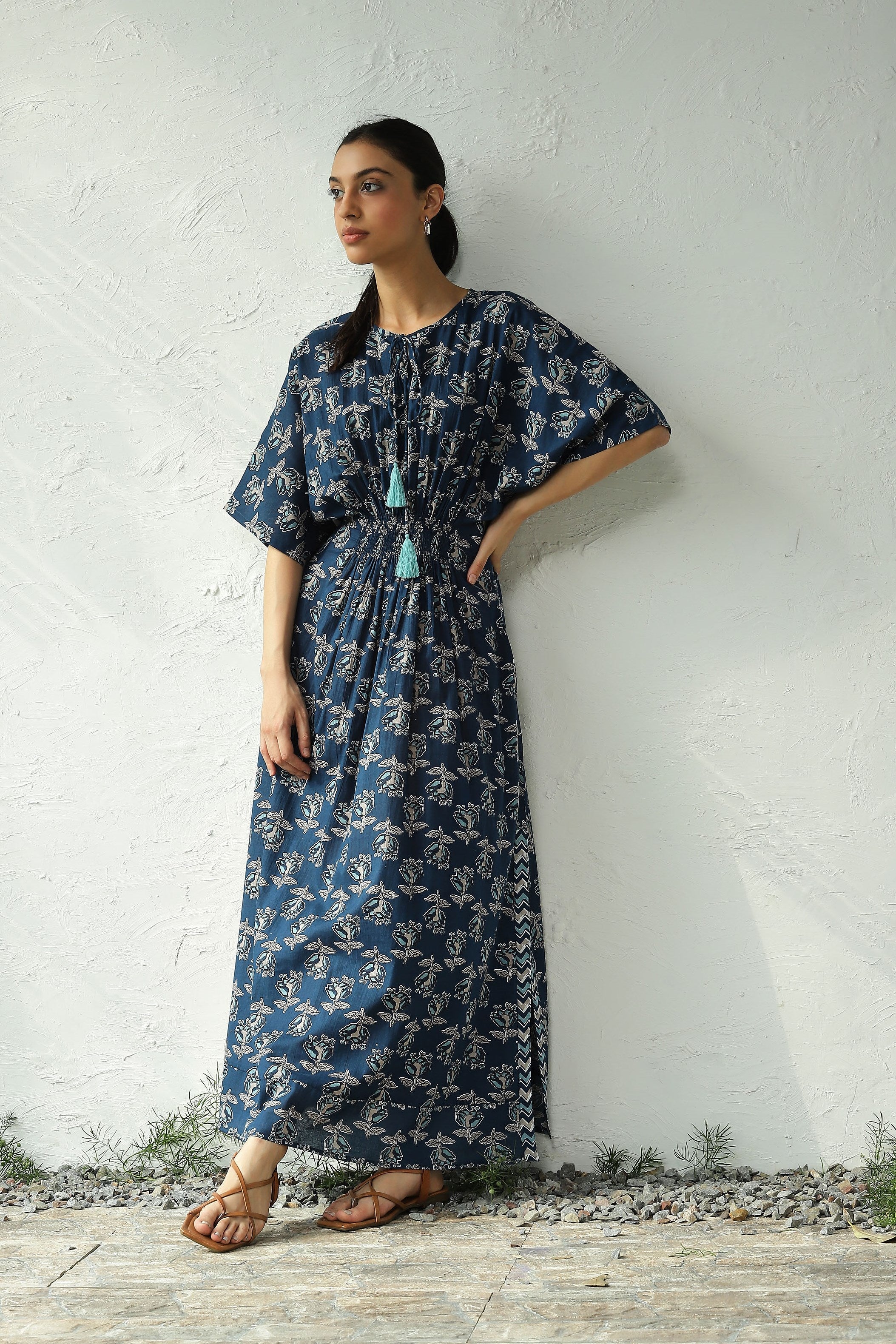 Discover endless charm with our print midi dress, set to become your wardrobe favorite. Crafted from lightweight cotton fabric adorned with enchanting paisley block print that evokes the essence of spring. This dress features flared kaftan sleeves, a silhouette-defining smocked waistband, and side slits that lend movement as you walk. Elevate its elegance for evening affairs with thong sandals and statement jewelry.