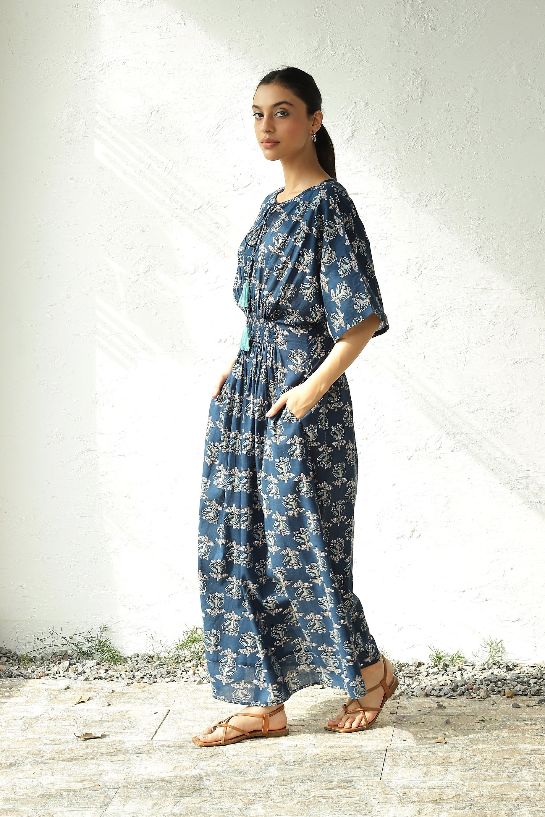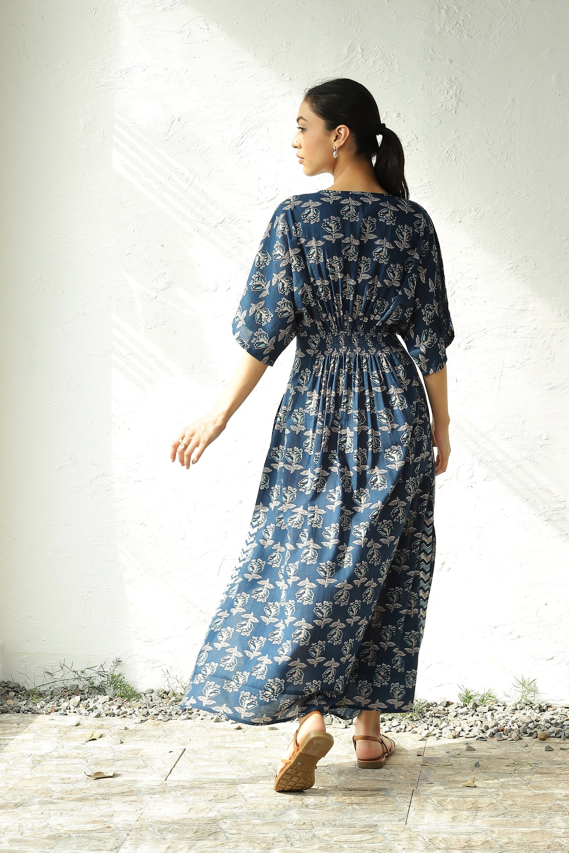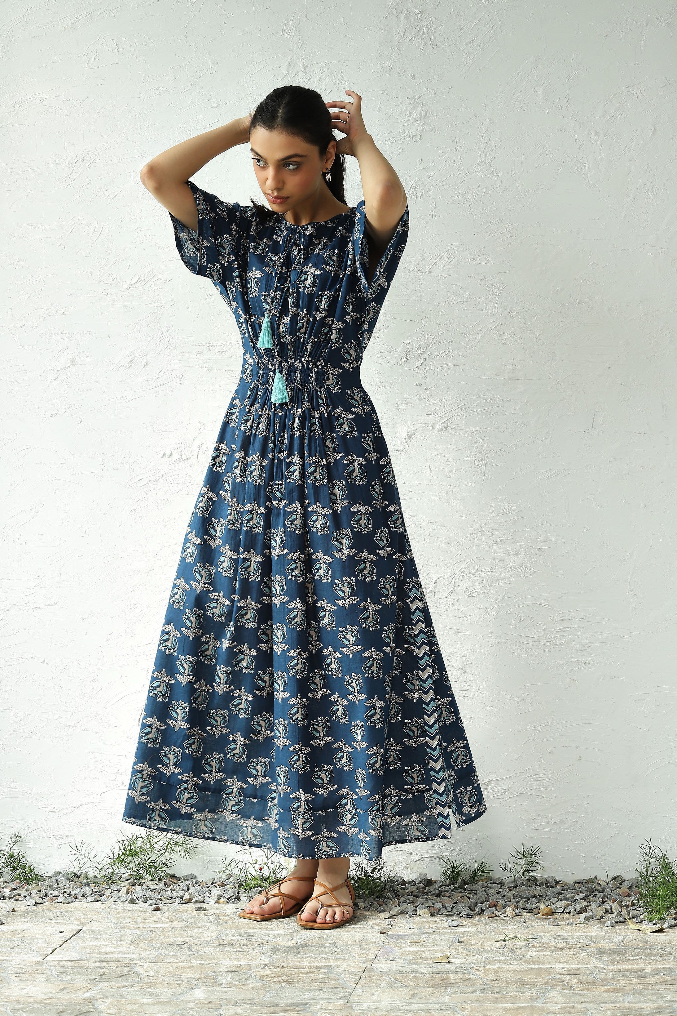 Discover endless charm with our print midi dress, set to become your wardrobe favorite. Crafted from lightweight cotton fabric adorned with enchanting paisley block print that evokes the essence of spring. This dress features flared kaftan sleeves, a silhouette-defining smocked waistband, and side slits that lend movement as you walk. Elevate its elegance for evening affairs with thong sandals and statement jewelry.
