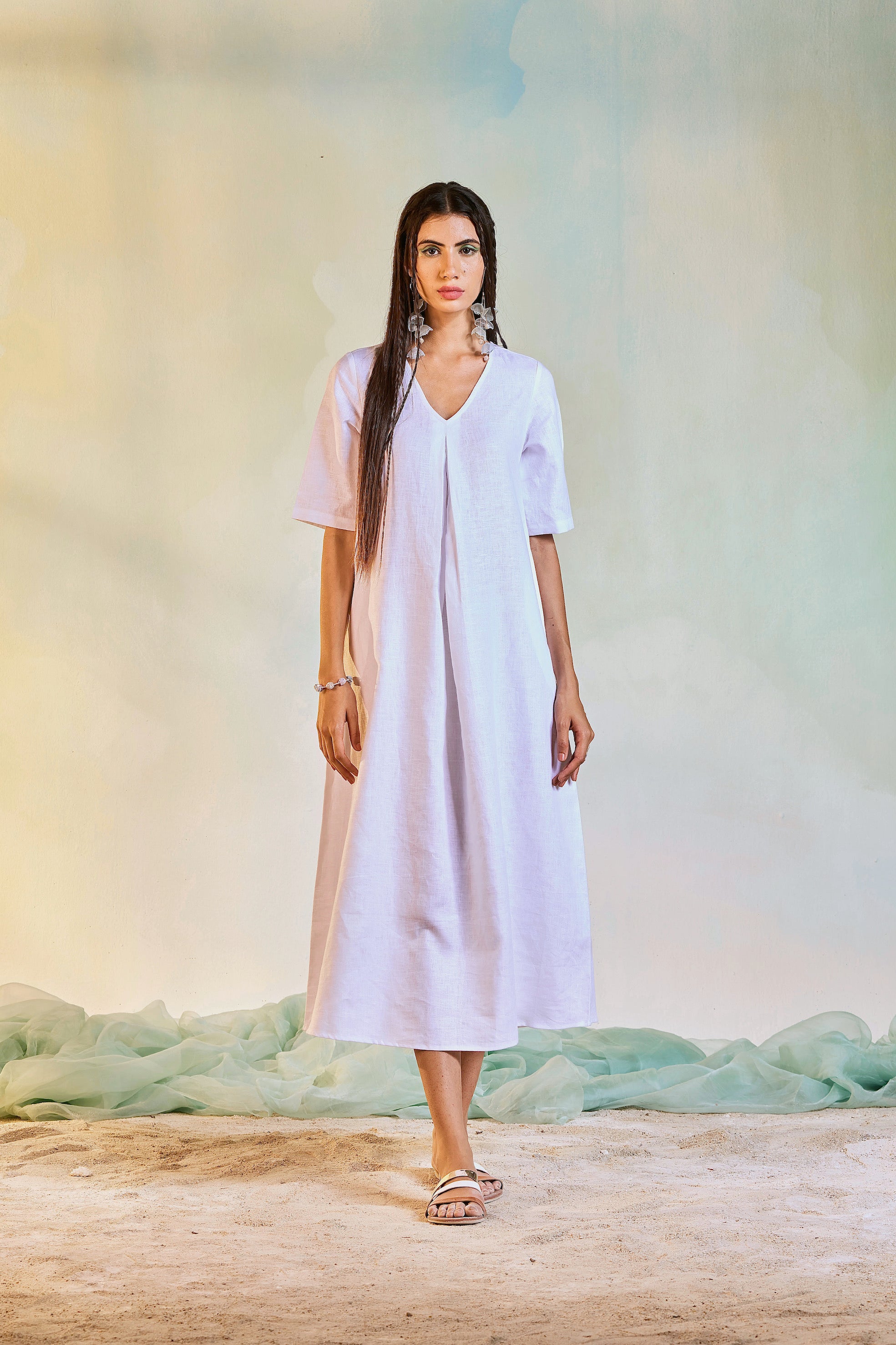 Experience the perfect blend of style and ease with this snowwhite linen dress, ideal for warm weather days. The flattering V-neckline and inverted centre pleat create a sophisticated silhouette, while practical side pockets add everyday functionality. Crafted from breathable linen, this versatile piece delivers comfort without compromise.