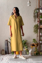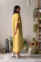 Bright, airy, and effortlessly refined — the Soft Yellow Sirocco Dress brings a sense of sunshine to your everyday style. The straight silhouette is enhanced with delicate front pleats that add graceful movement, while side slits ensure easy comfort through the day. Finished with practical side pockets, it blends function with understated elegance. Light, breezy, and beautifully versatile, this dress is perfect for daytime outings, relaxed brunches, or warm holiday evenings when you want to look polished without trying too hard.
