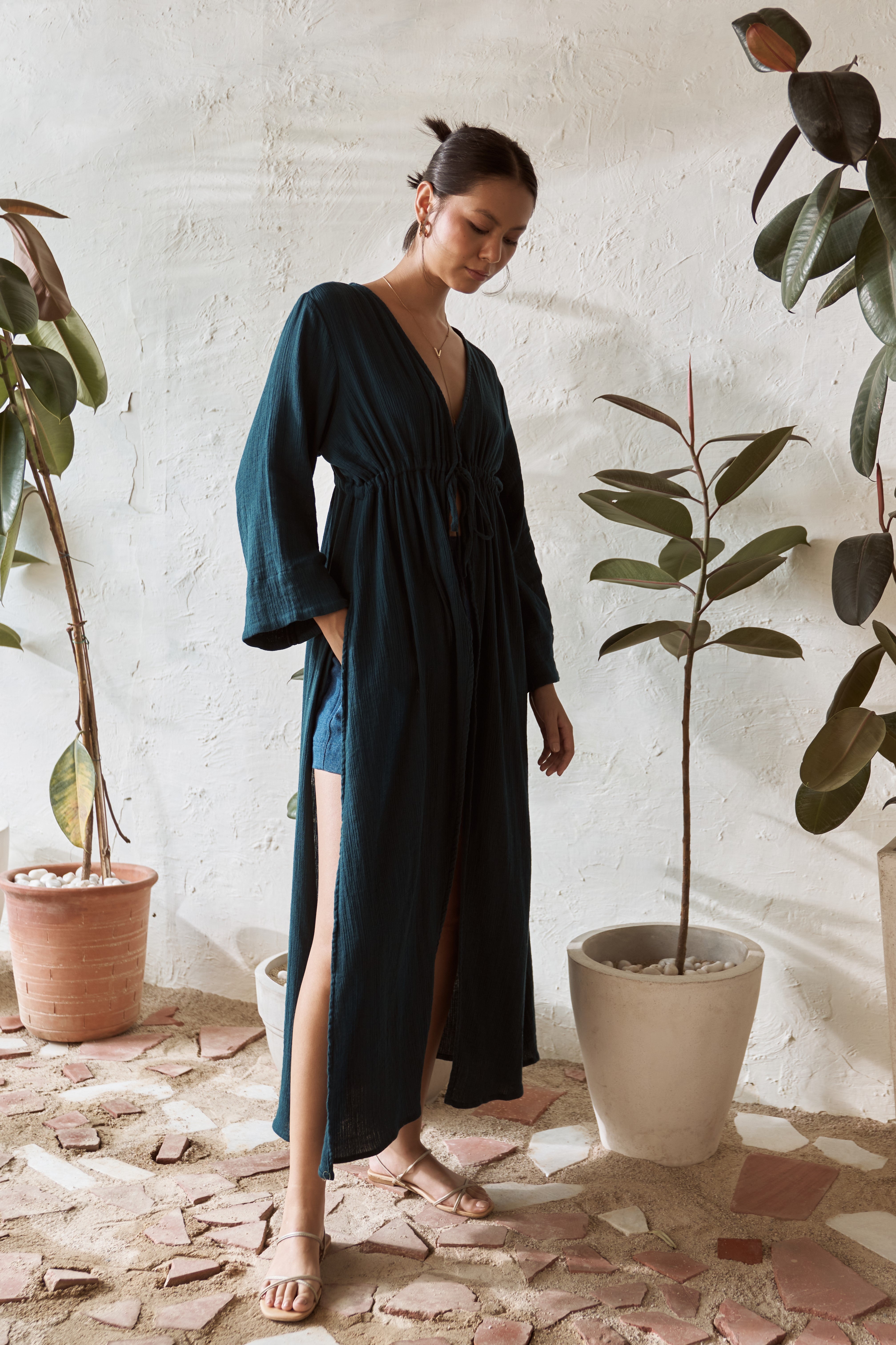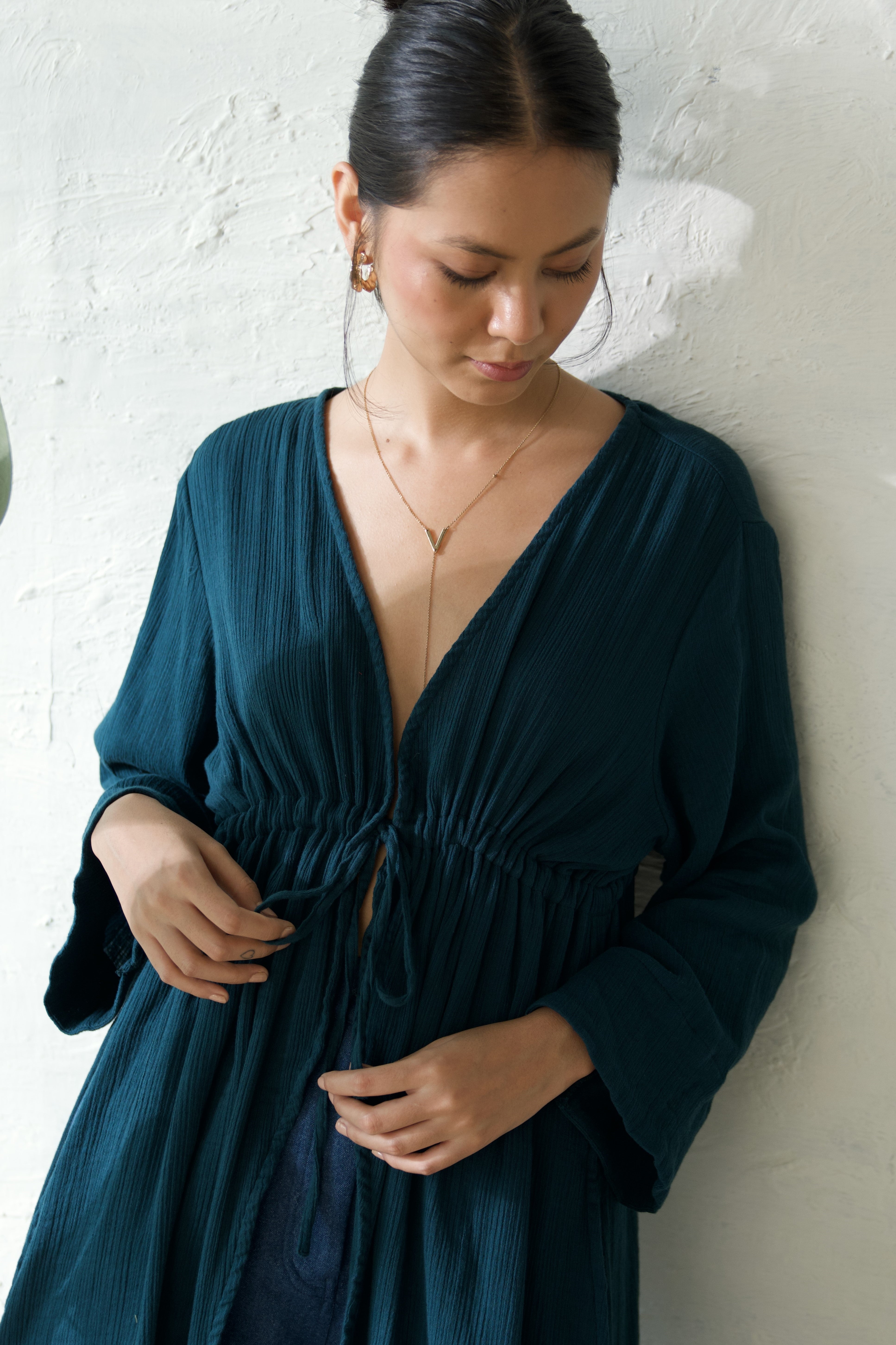 Visualize this elegant long overlay featuring a drawstring under the bust for a lengthening effect on your figure, complemented by stylish fringed sleeves. This versatile piece effortlessly pairs with any shorts or short dress. The drawstring detail not only adds a fashionable flair but also enhances your body's proportions, while the playful fringed sleeves bring a trendy touch to your ensemble. Whether you opt for a casual or more upscale look, this long overlay is the ideal choice to elevate your style effortlessly. Prepare to dazzle at any event with this chic and flattering long overlay as the centerpiece of your outfit.