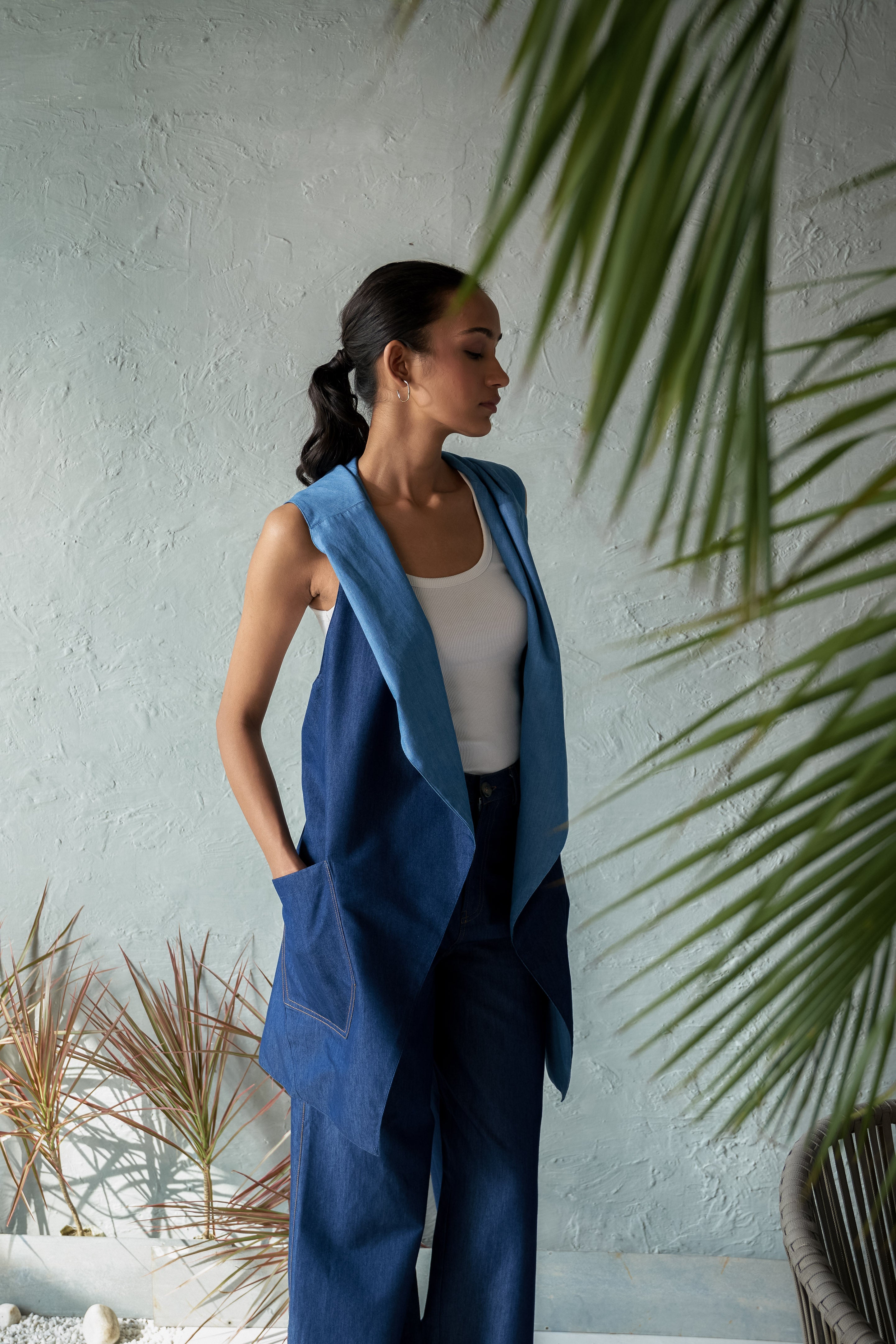 Canoopi Must Have: Get creative and add flair to your wardrobe with our Reversible Sleeveless Overlay in denim Fabric! This trendy piece offers two color choices - one on each side - so you can switch up your style in a snap. Made of lightweight denim, it provides all-day comfort, and its sleeveless design allows for easy layering with any outfit. From casual to chic, this reversible overlay is the ultimate fashion and comfort combo!