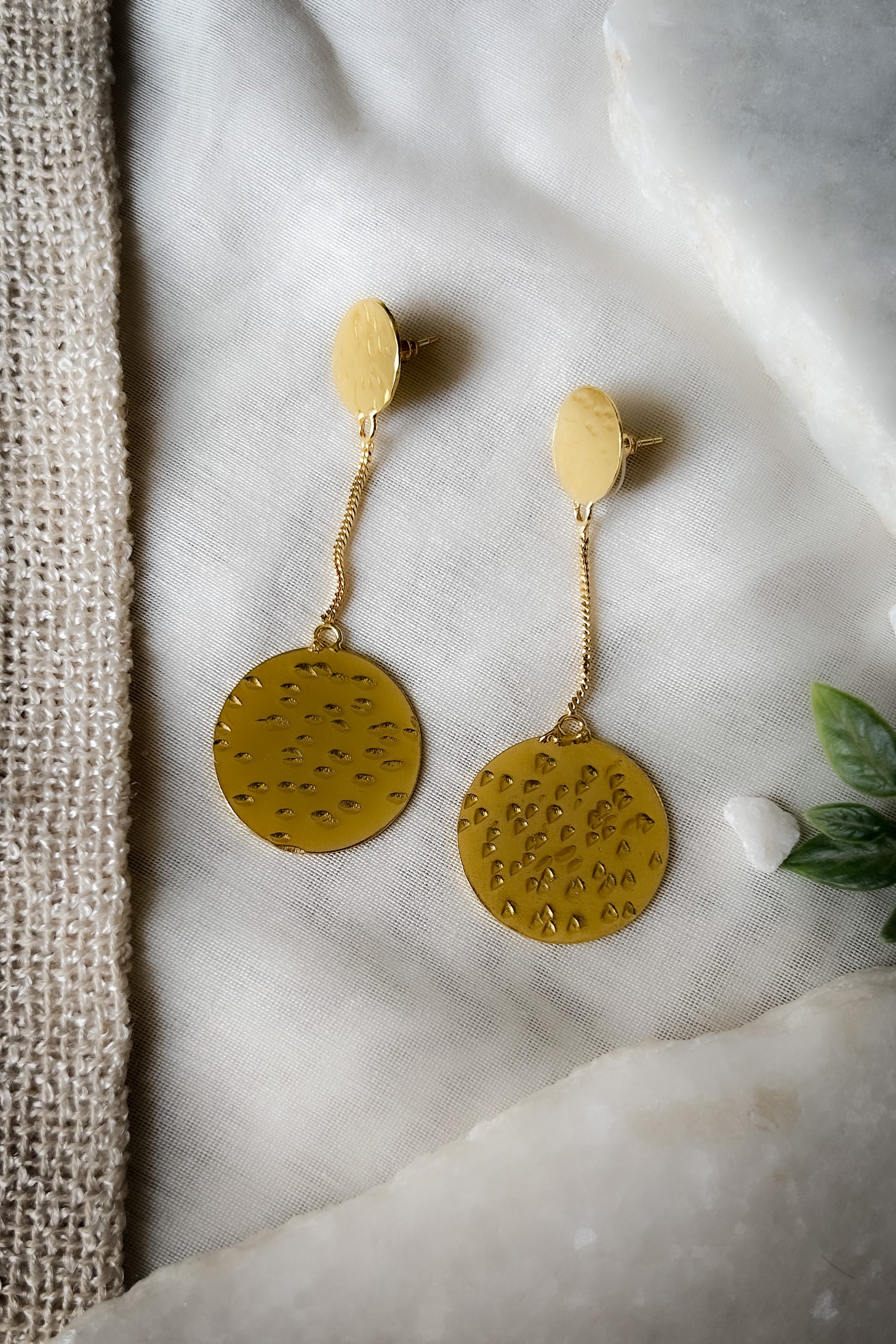A pair of celestial earrings, with a small moon strung together with the earth, handcrafted in brass.