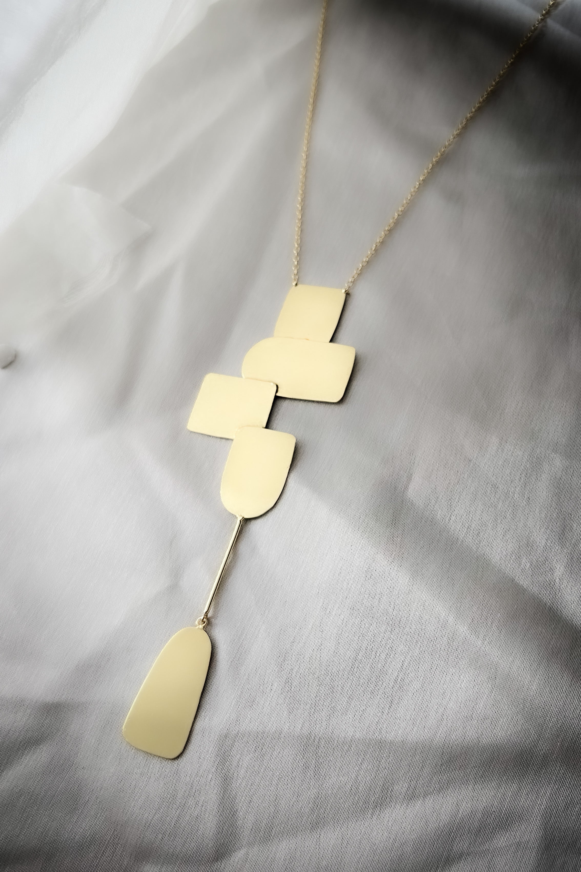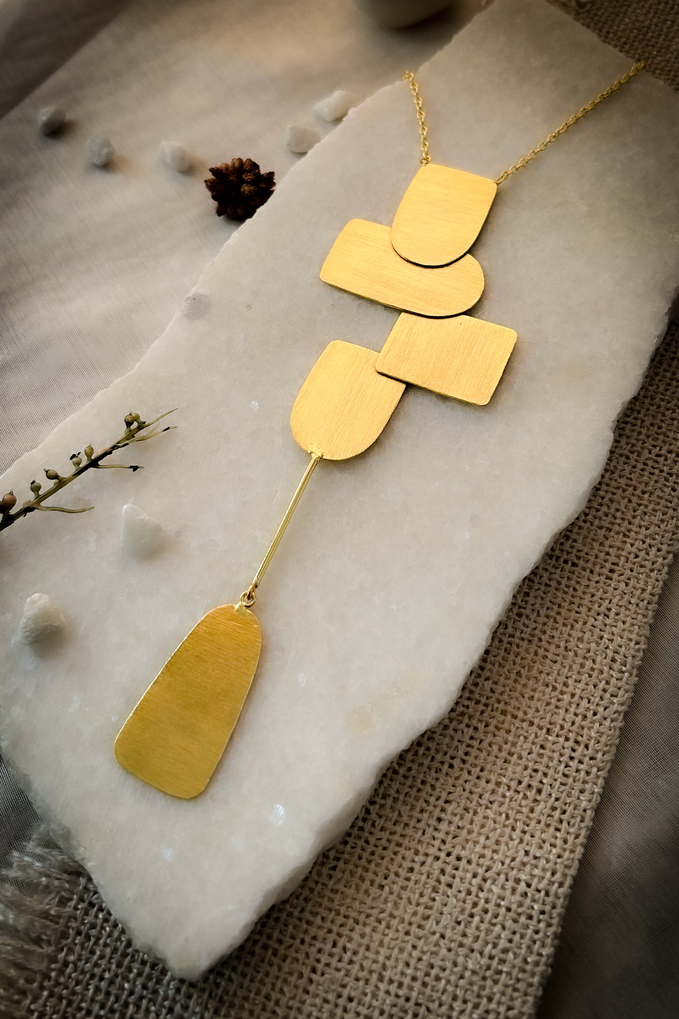 A statement piece of long chain with a cluster setting and a singlet extending downward. Handcrafted in brass with 18K gold plating.