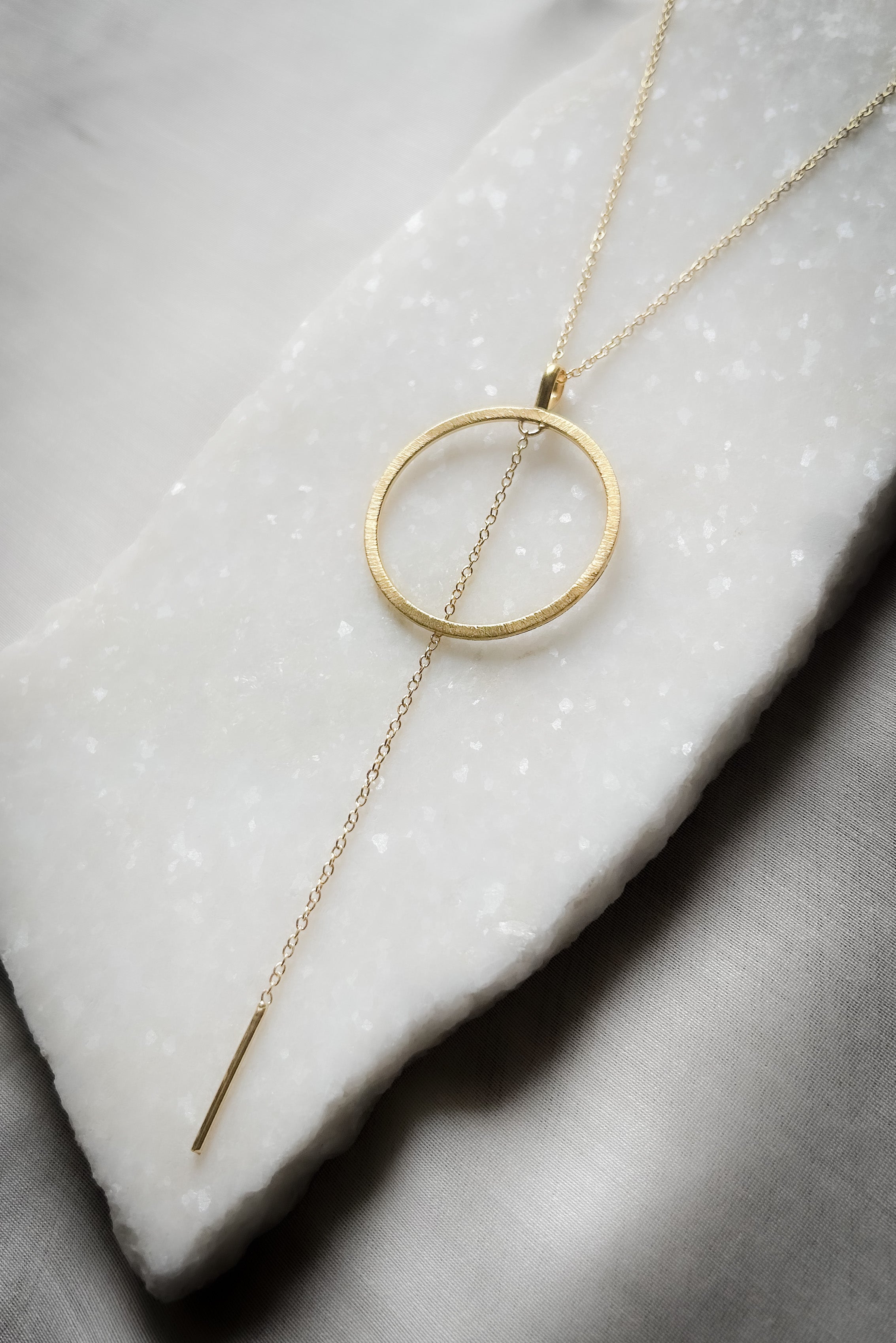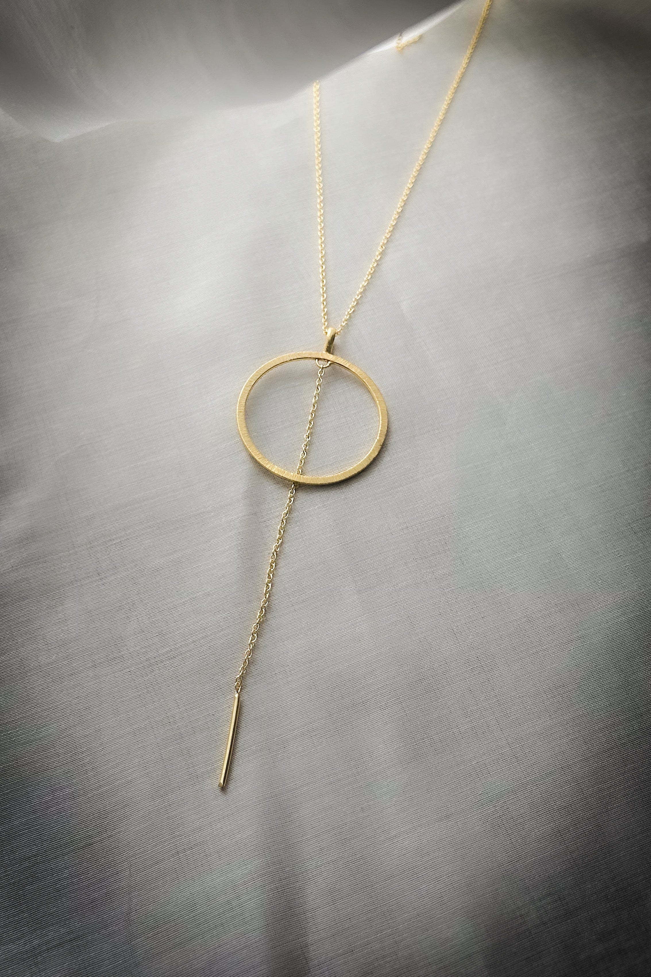 An elegant and delicate neck chain, a design symbolic of circle as the sun, needle as its ray in gold finish.