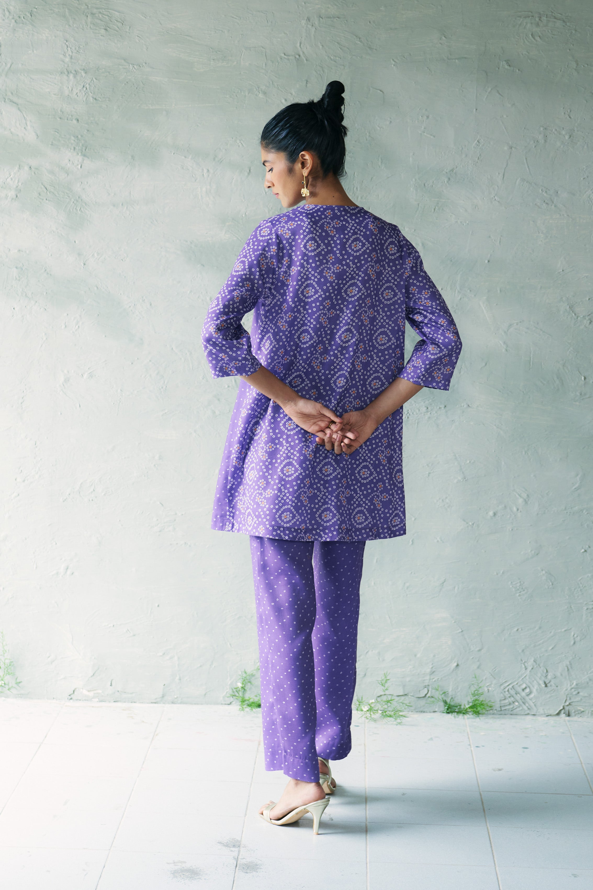 The Bindu Amethyst Kurta Set offers an elevated take on Bandhani tradition in a rich purple hue. With a short, front-buttoned kurta designed in a panelled structure and accented by contrast print detailing, the set is complete with straight pleated pants featuring a side zip. A stylish ensemble ideal for semi-formal occasions and festive evenings.