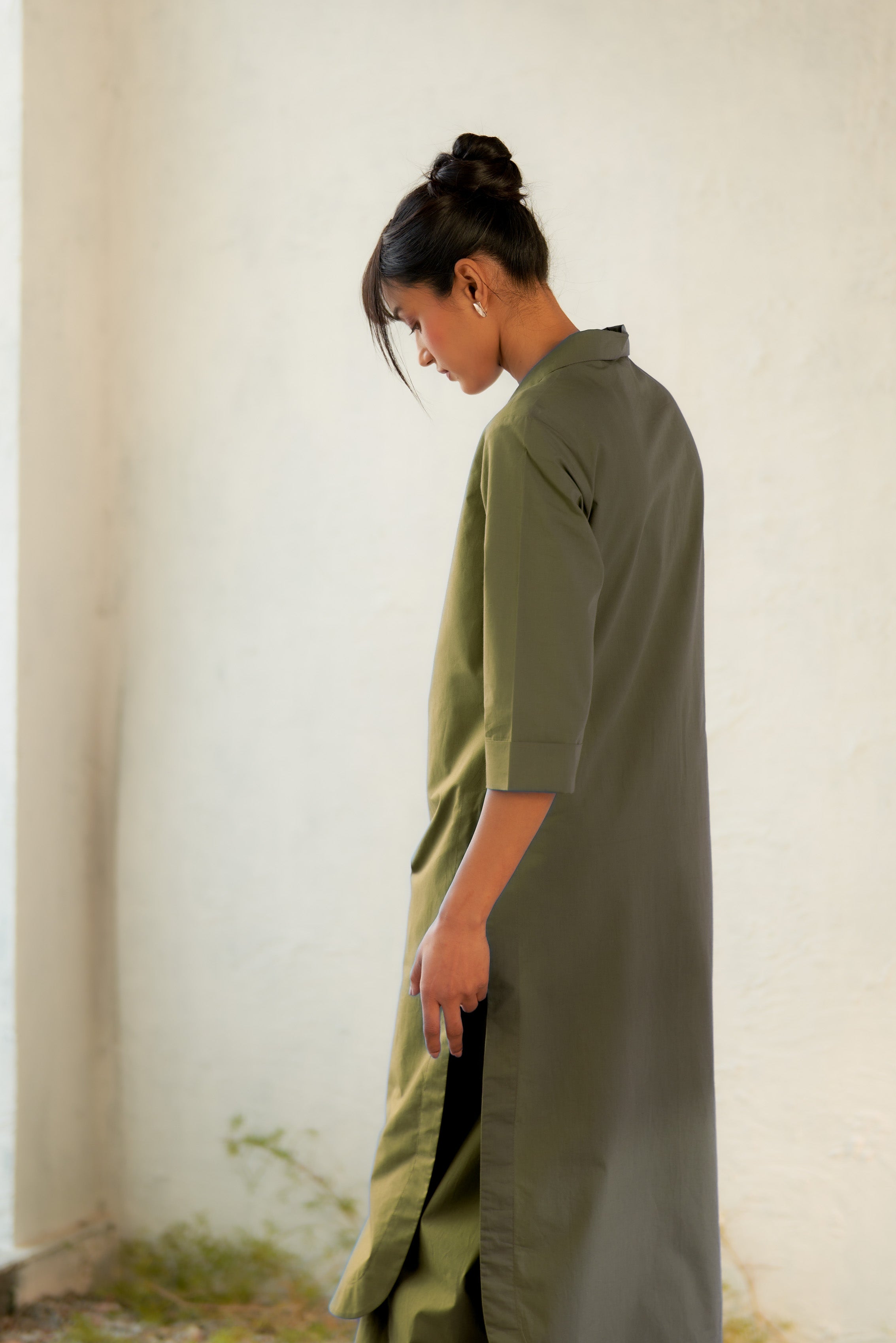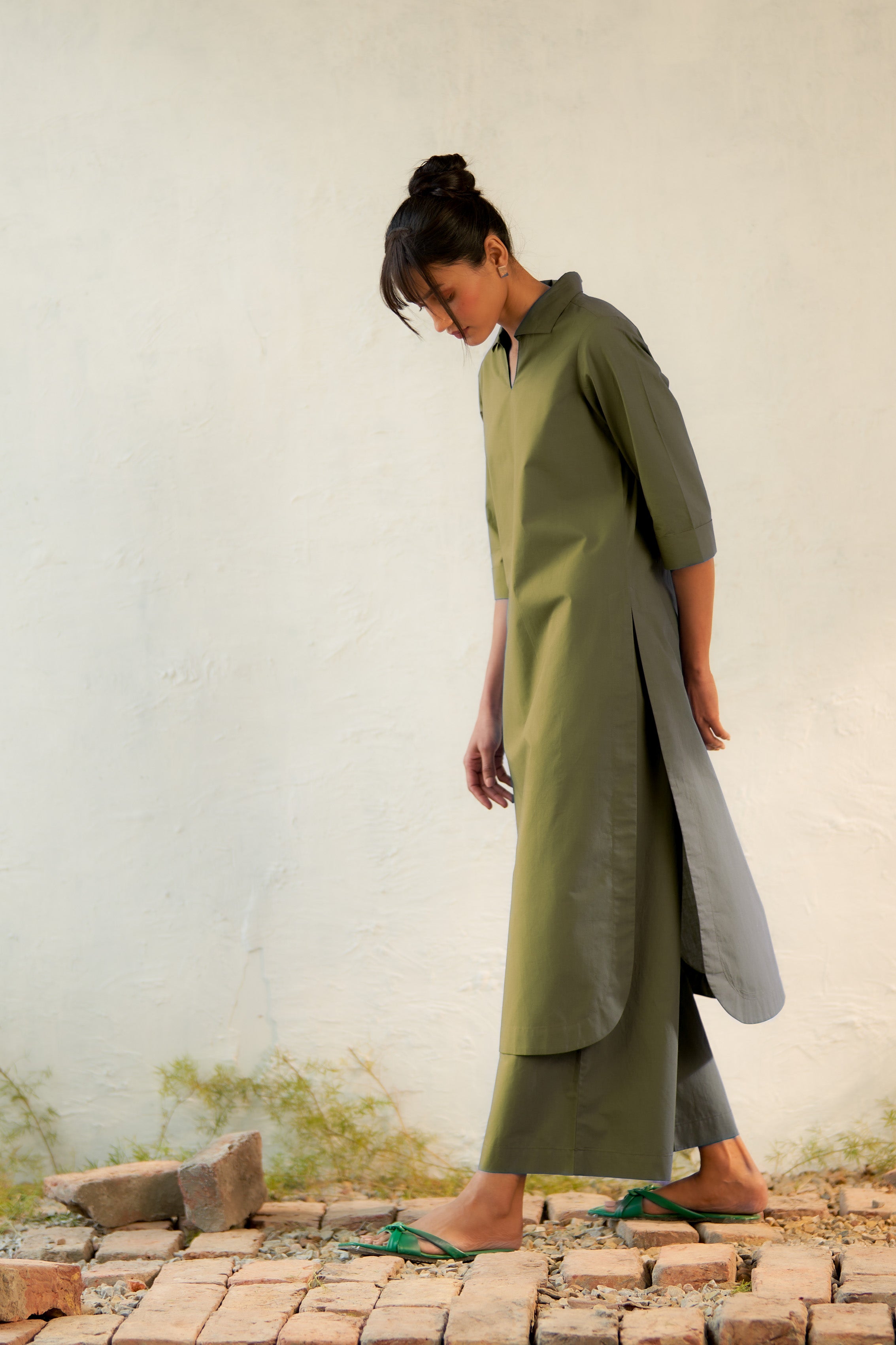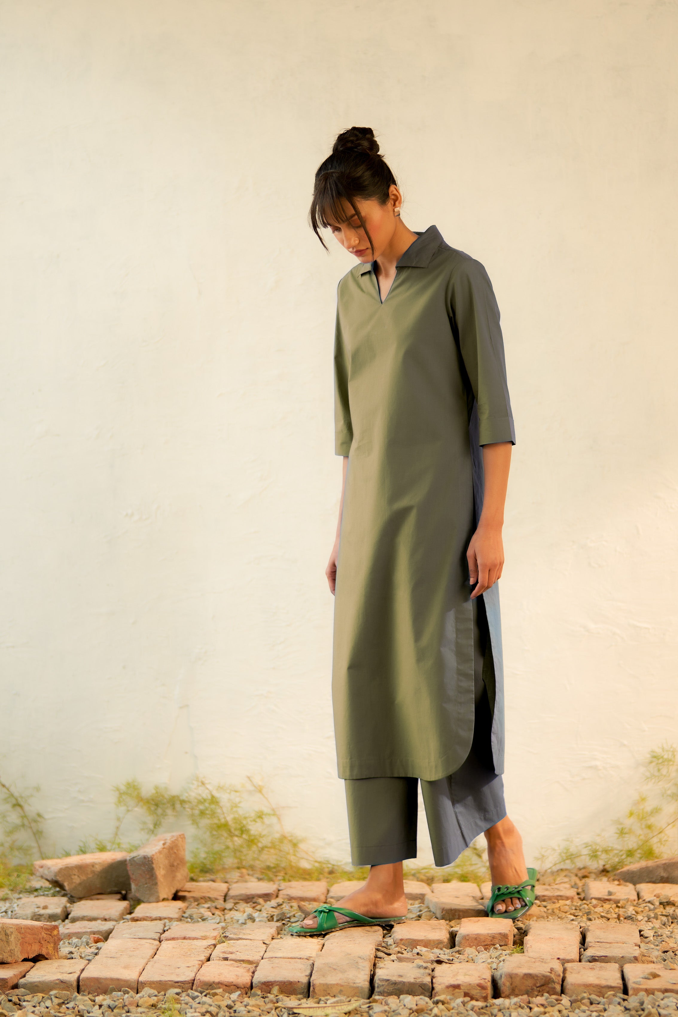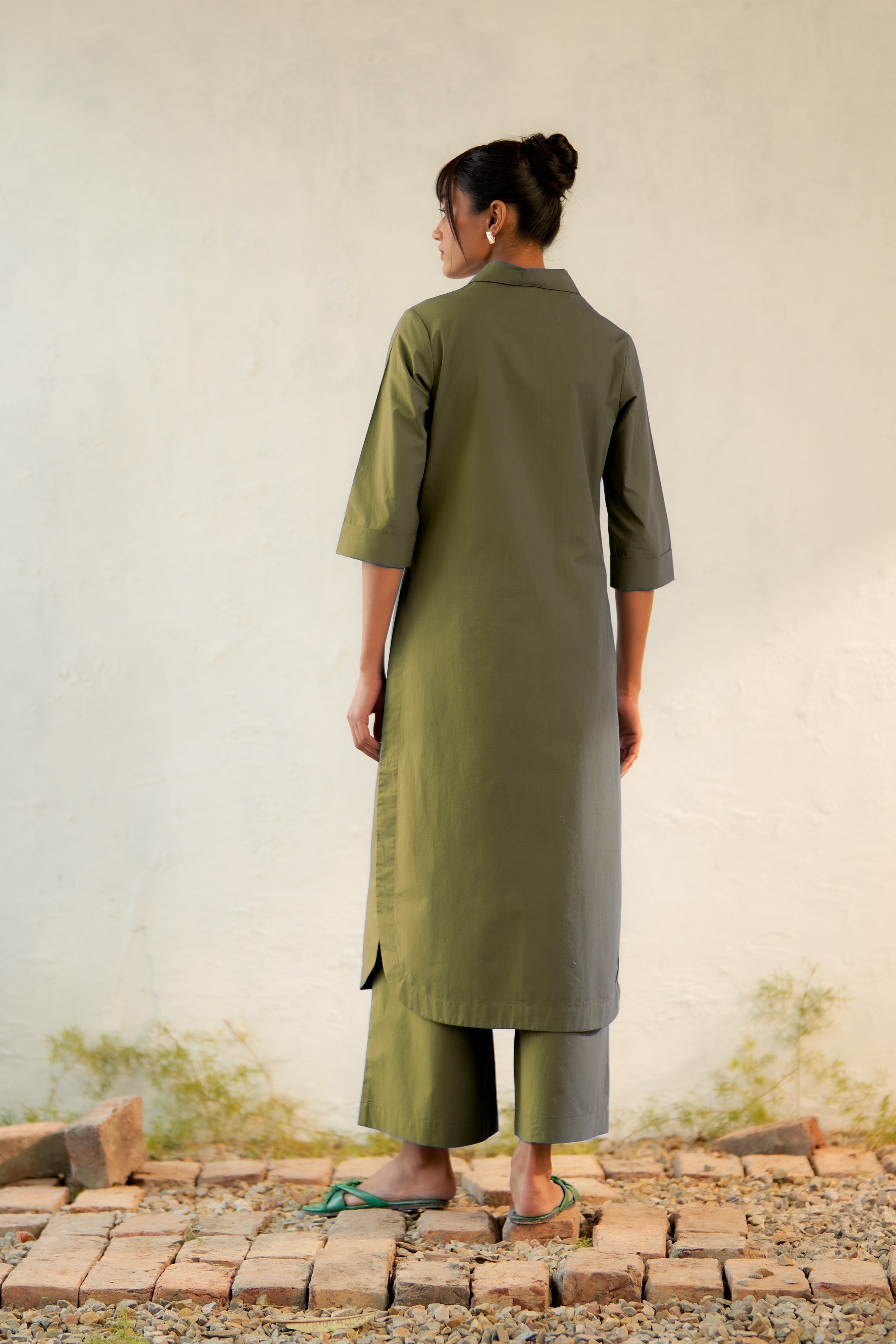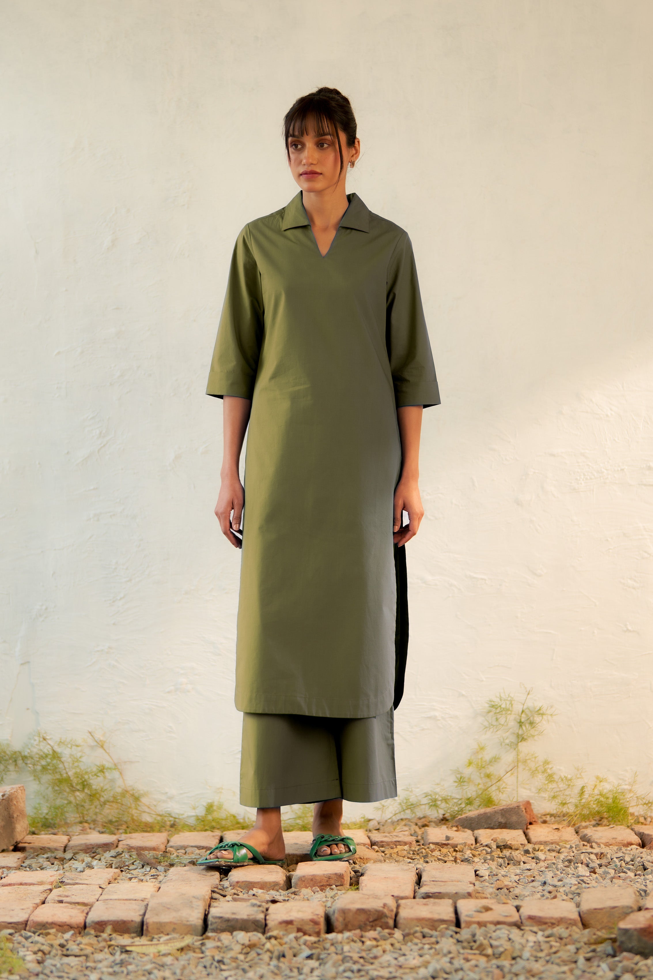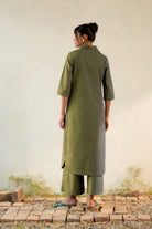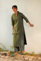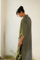 Inspired by open landscapes and calm trails, the military-green kurta brings structure and softness together. Its clean V-neck collared detail and fluid drape create a balanced, contemporary look. Paired with flared pants (elasticated and drawstring both) in a coordinated tone, the set captures understated elegance—perfect for everyday moments that feel a little special.