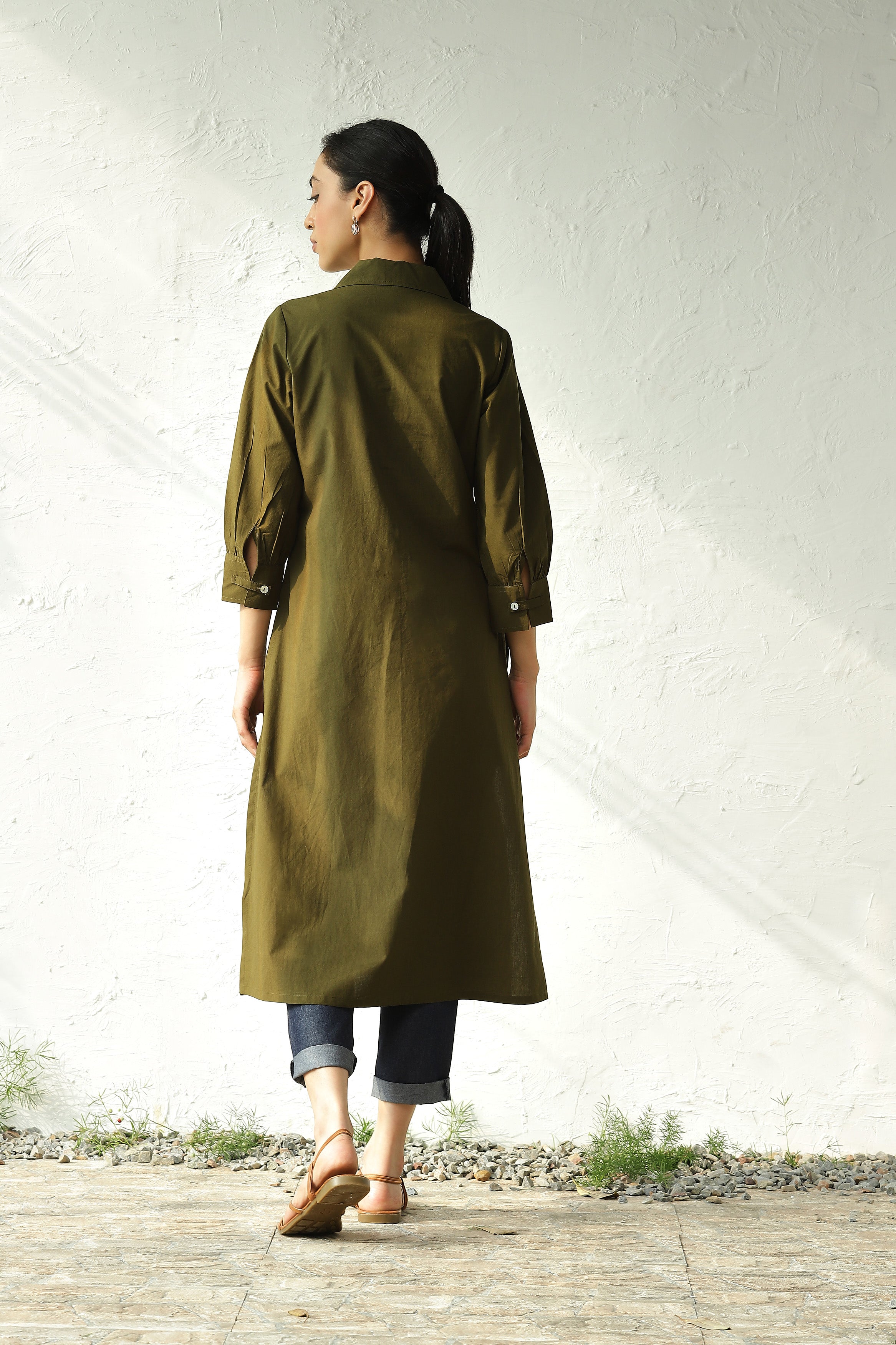 Embark on adventurous journeys with our forest green front-buttoned tunic. Crafted from premium cotton poplin fabric in a breathable green finish, this relaxed-fit shirt dress showcases a collared neckline and high side slits for a laid-back silhouette. The shell buttons and side seam pockets elevate this style, ensuring both practicality and elegance.