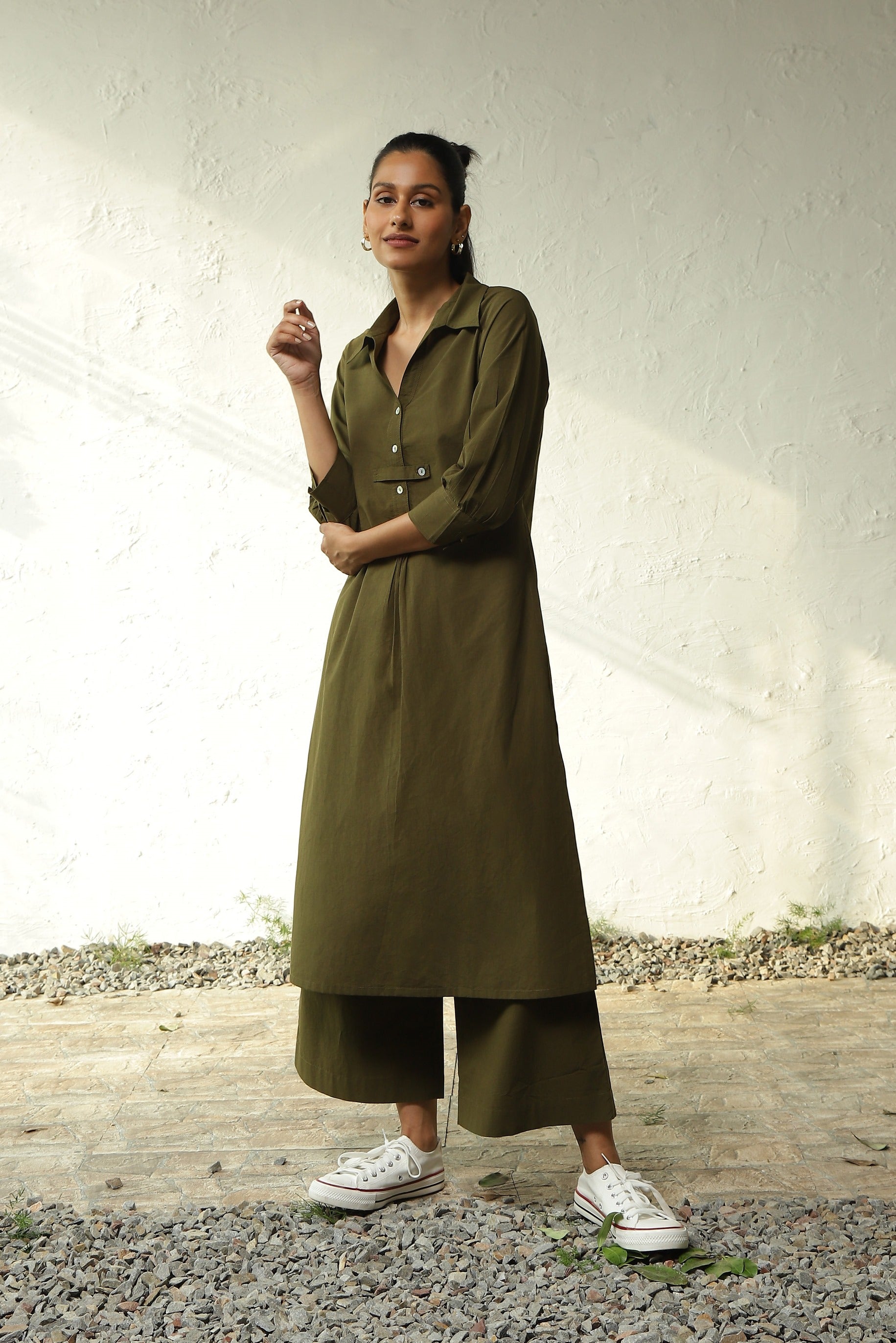 Prepare for a jungle exploration with our forest green front-buttoned co-ord set. Crafted from premium cotton poplin fabric, the kurta boasts a collared neckline and high side slits, forming a relaxed silhouette. The shell buttons and side seam pockets add a touch of elevated style. Paired perfectly with canoopi's drawstring pleated pants, featuring a comfortable elasticated waistband and inward box pleats that lead to wide legs, creating a breezy silhouette. Enjoy exploration in comfort and style.