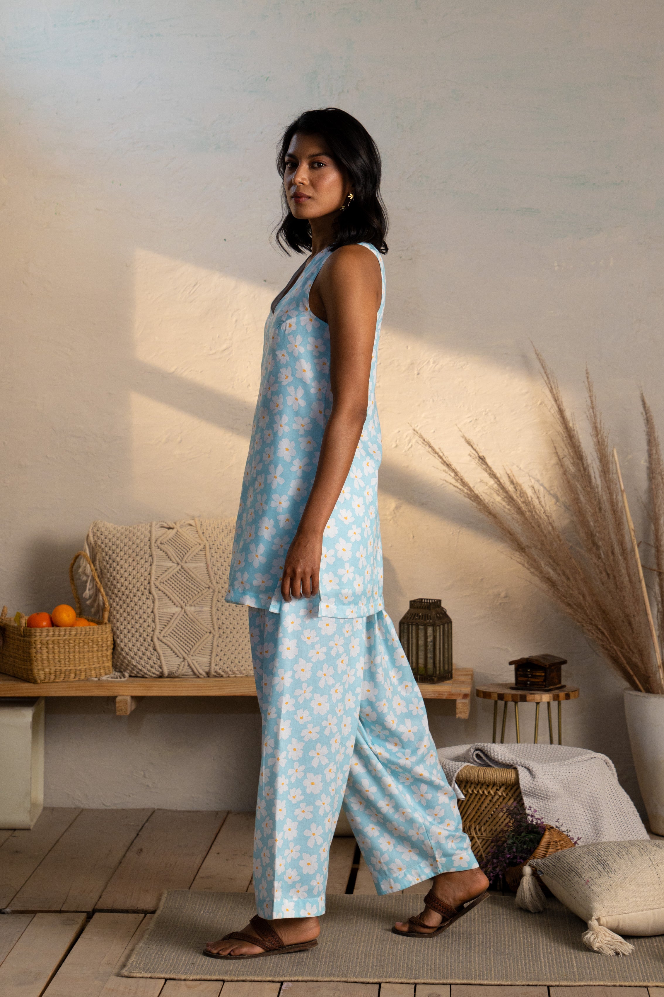Elevate your style with the Freesia White Kurti Set, a modern take on timeless elegance. The crisp, sleeveless short kurti in a serene freesia print and light blue hue balances sophistication with a relaxed vibe. Complementing this is a contemporary-styled salwar, crafted for ultimate comfort with an elasticated waistband and adjustable drawstring. This versatile set seamlessly blends modern aesthetics with traditional charm, making it a wardrobe essential for a chic, Indian-inspired outlook.