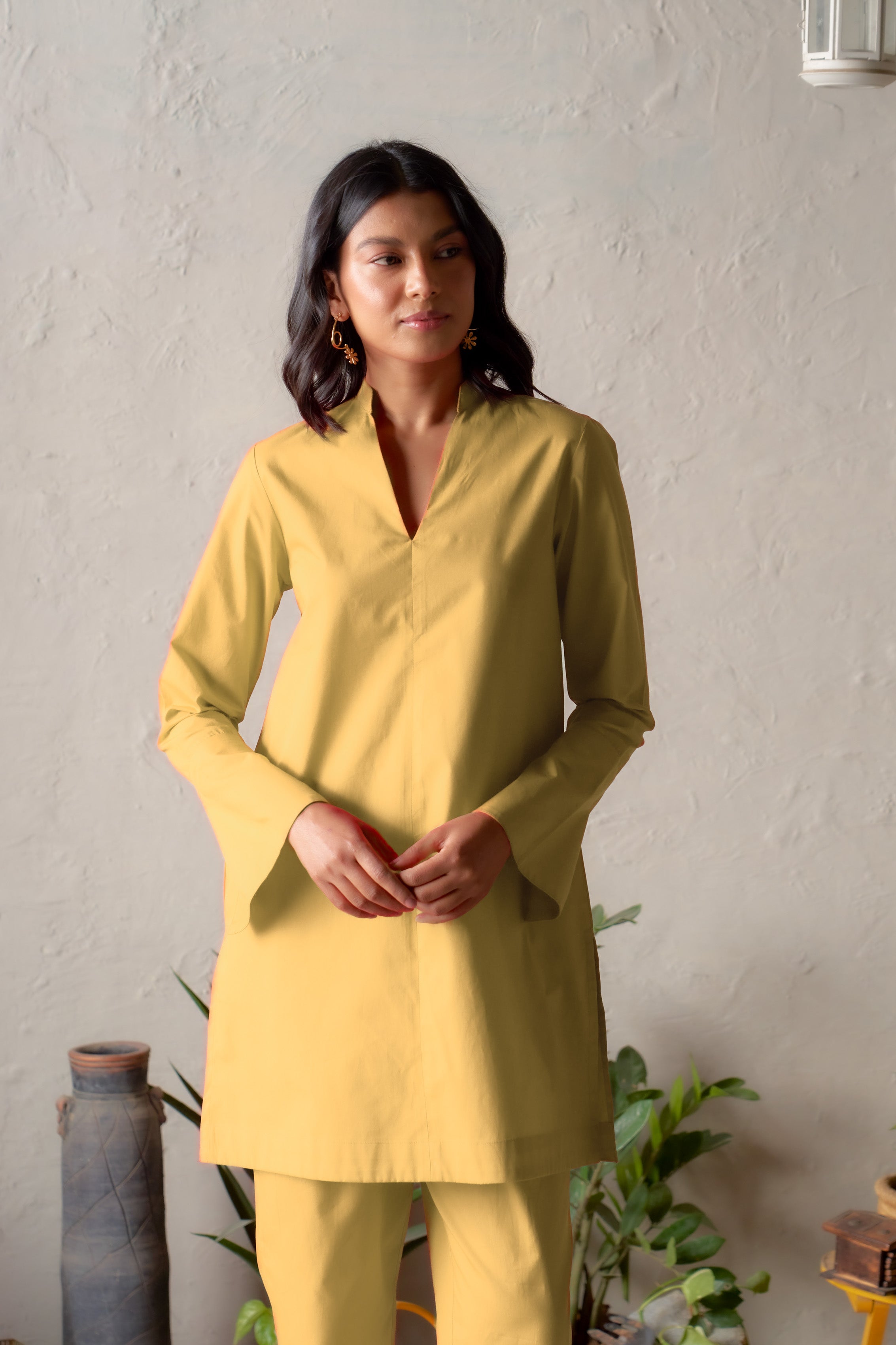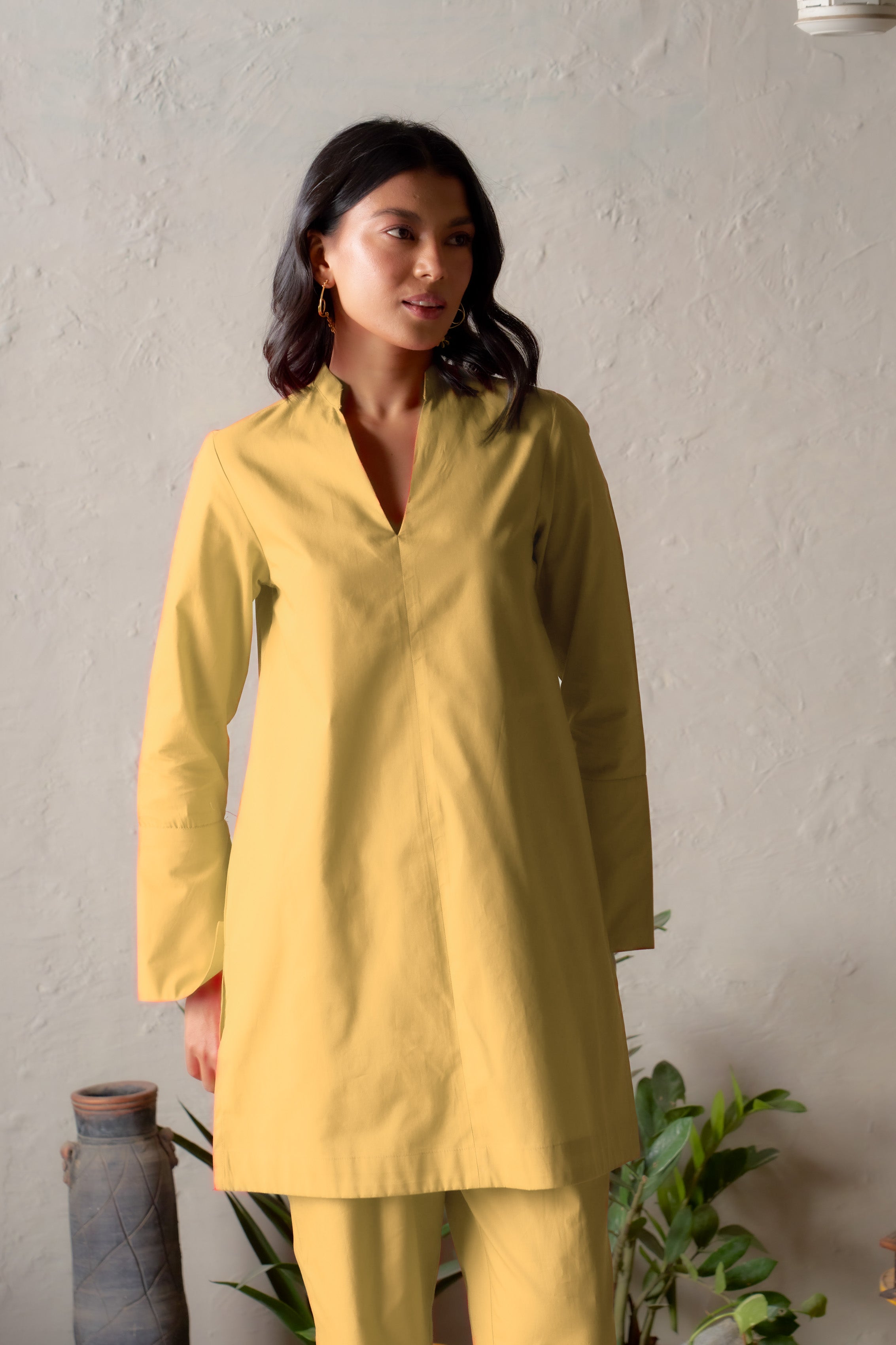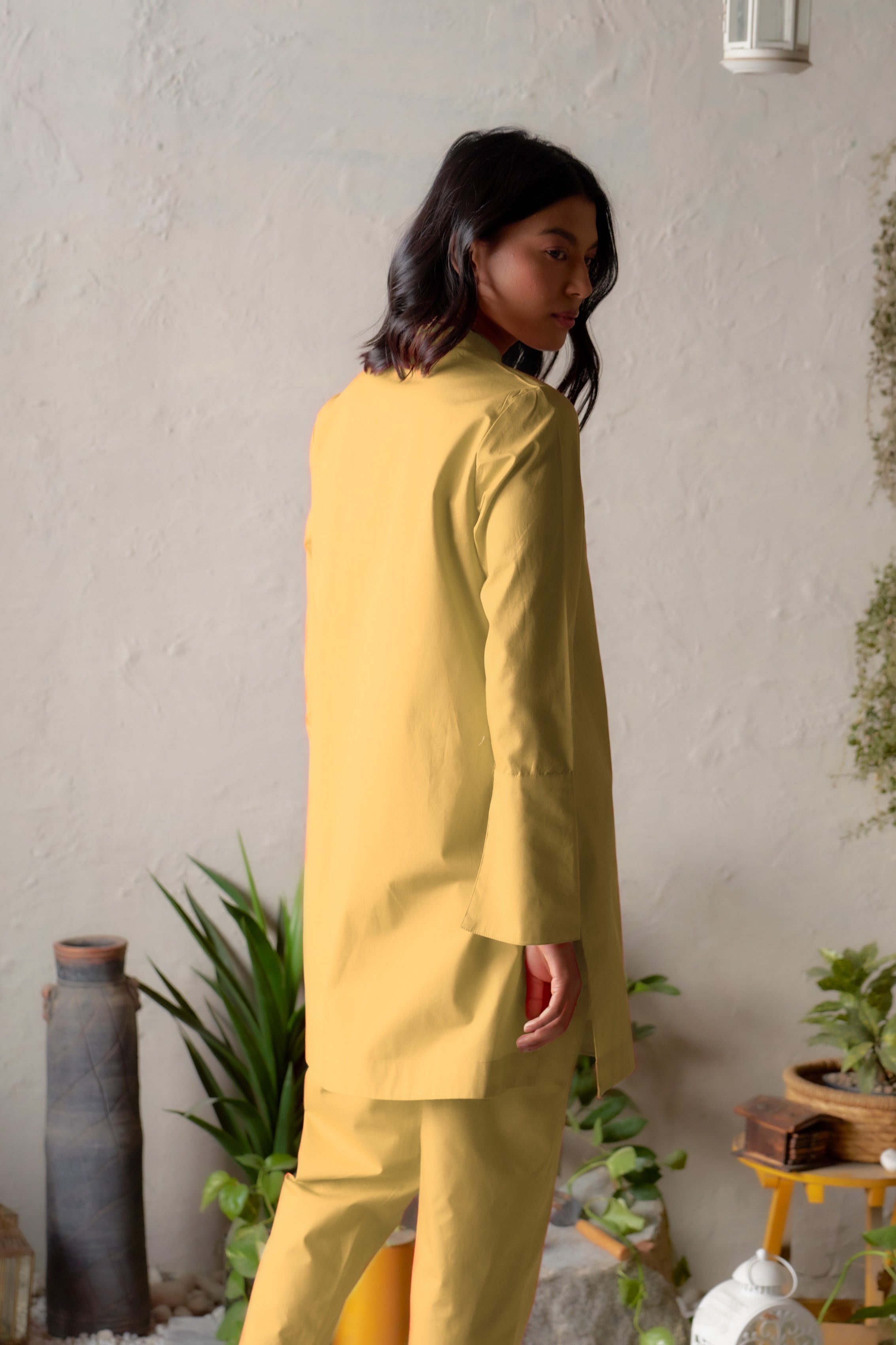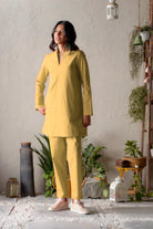 Portico Set captures the warmth and optimism of first light. Crafted in a serene soft yellow hue, it features a mid-length straight kurta with a refined V-neck band collar and elevated side slits for graceful movement. Full-length sleeves lend structure, while the straight pants provide effortless comfort and ease. Fresh, understated, and quietly elegant — this set is perfect for moments when you want to feel both polished and softly radiant.