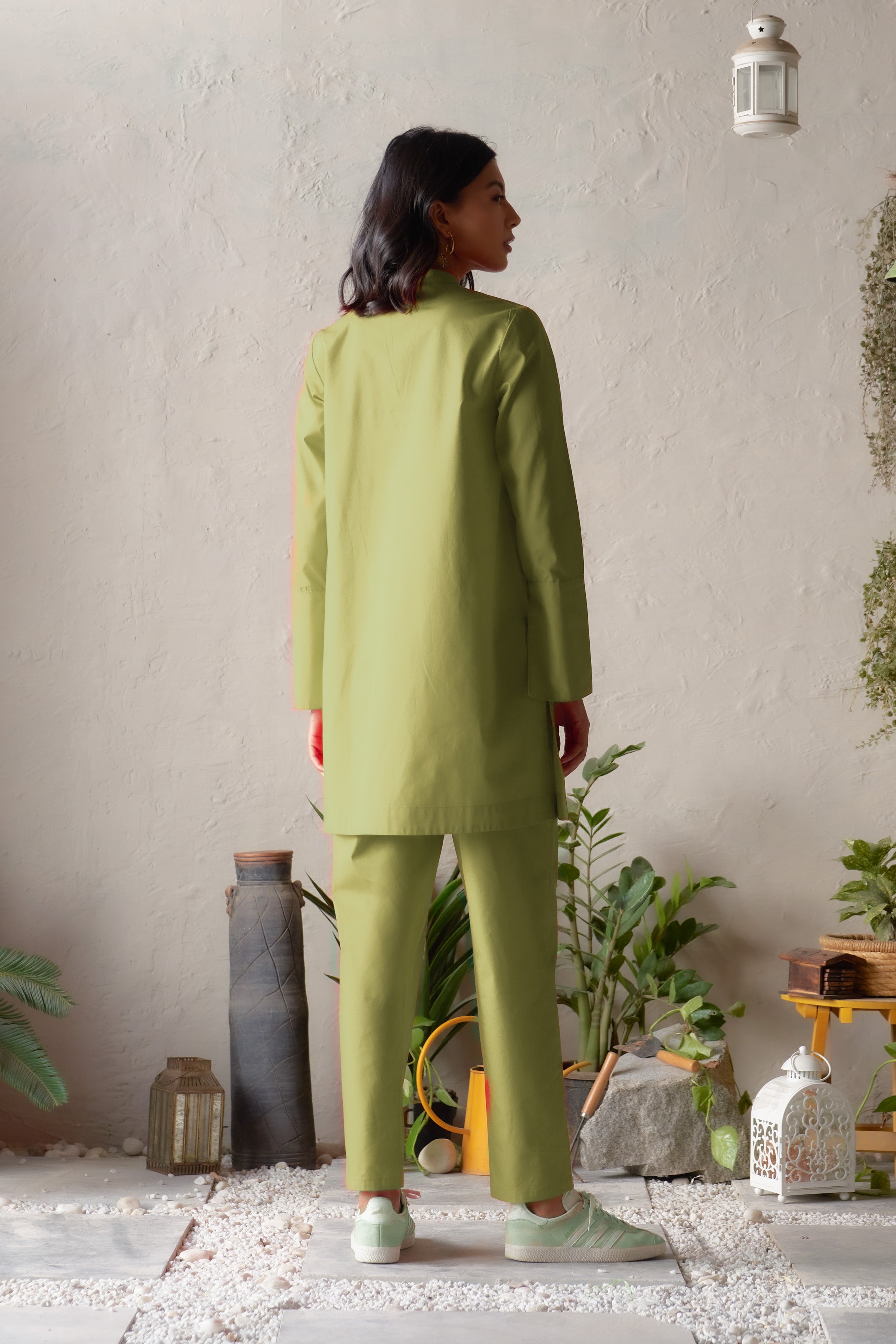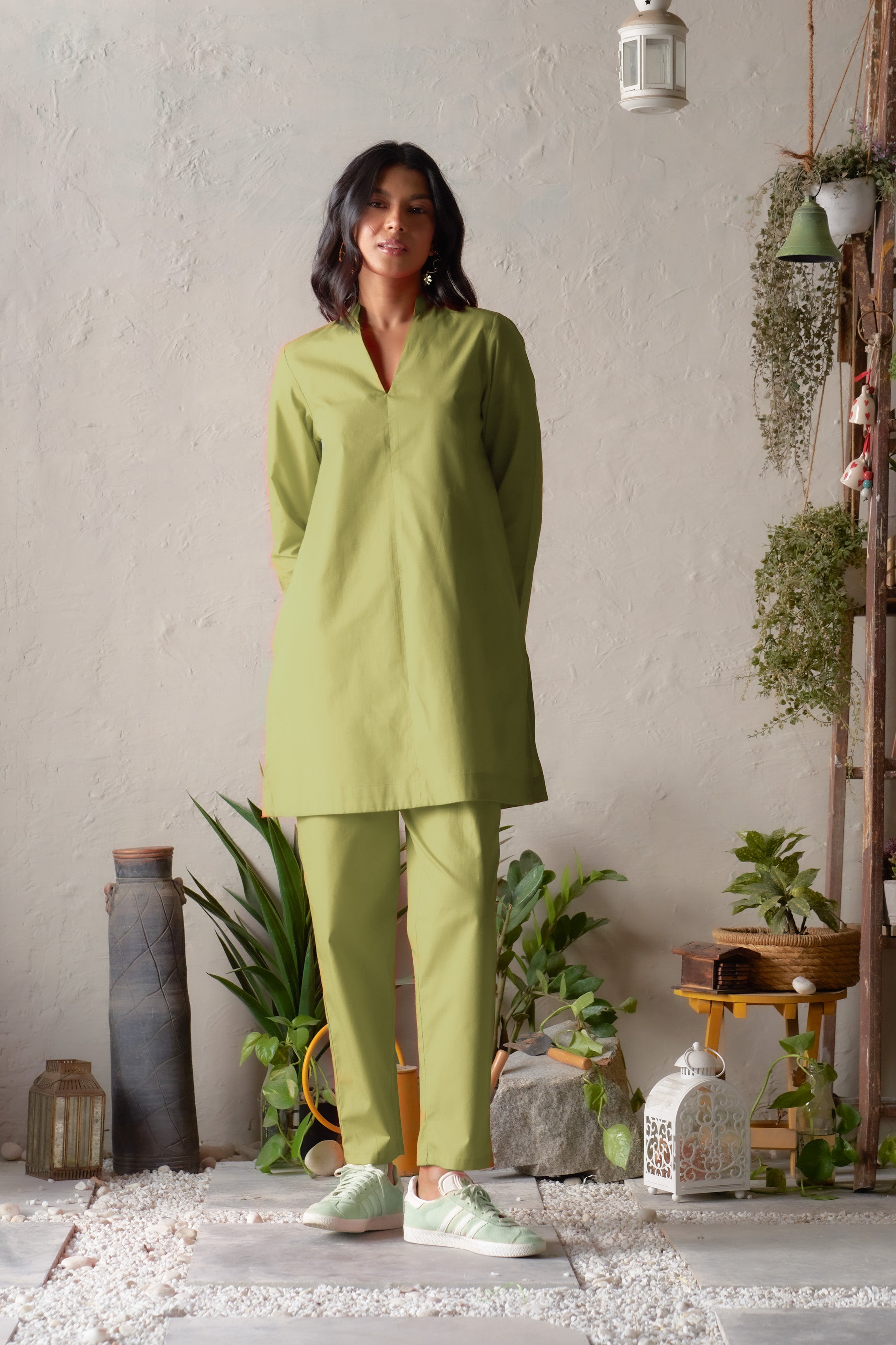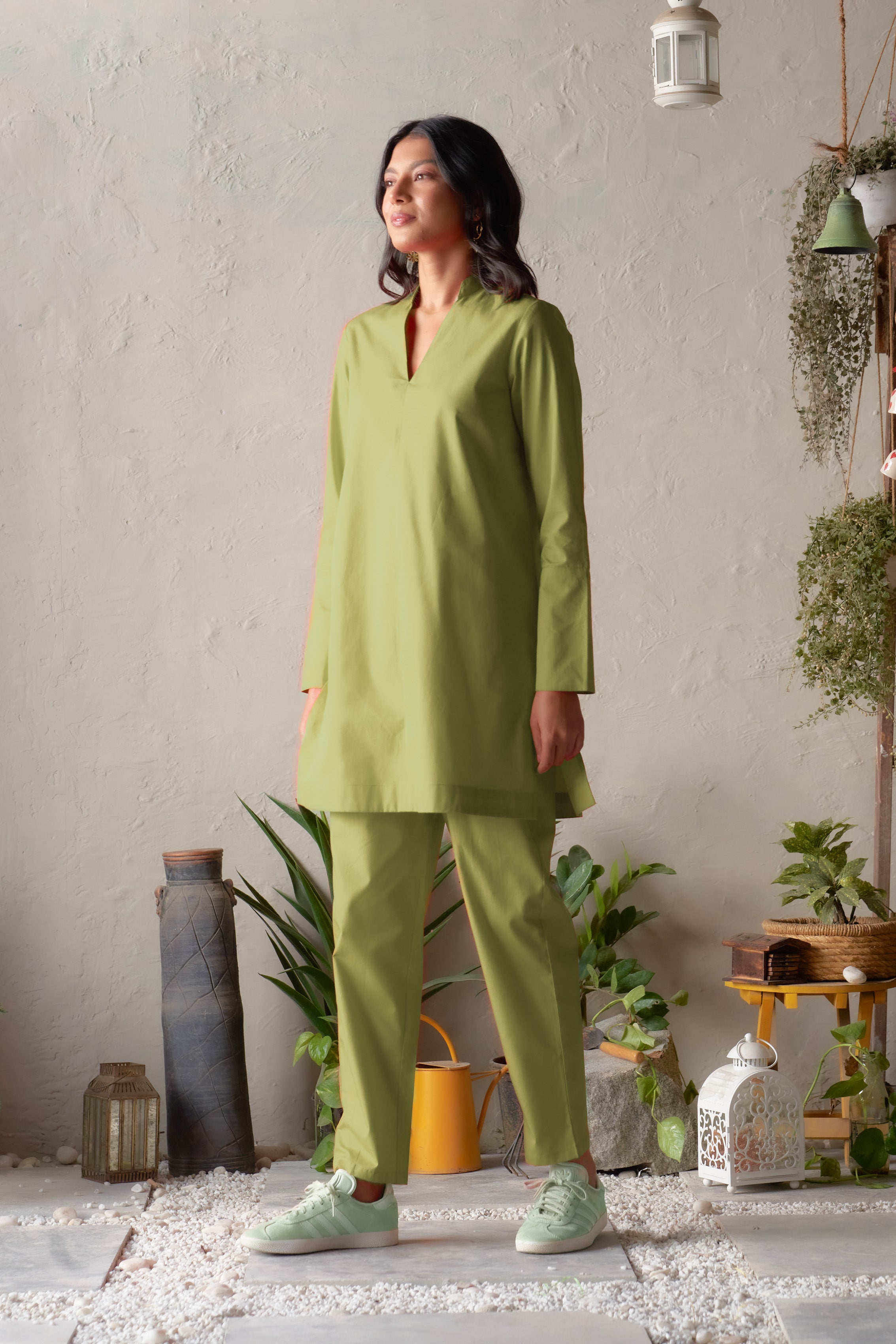 Cool, calming, and thoughtfully designed, the Nirvi Portico Set brings a refreshing sophistication to everyday dressing. The straight-cut kurta is defined by its V-neck band collar and high side slits, offering a sleek, contemporary silhouette. Paired with straight pants that ensure day-long ease, this ensemble harmonises comfort with subtle elegance. Ideal for relaxed outings or polished daytime moments, it exudes a gentle charm that feels effortlessly chic.