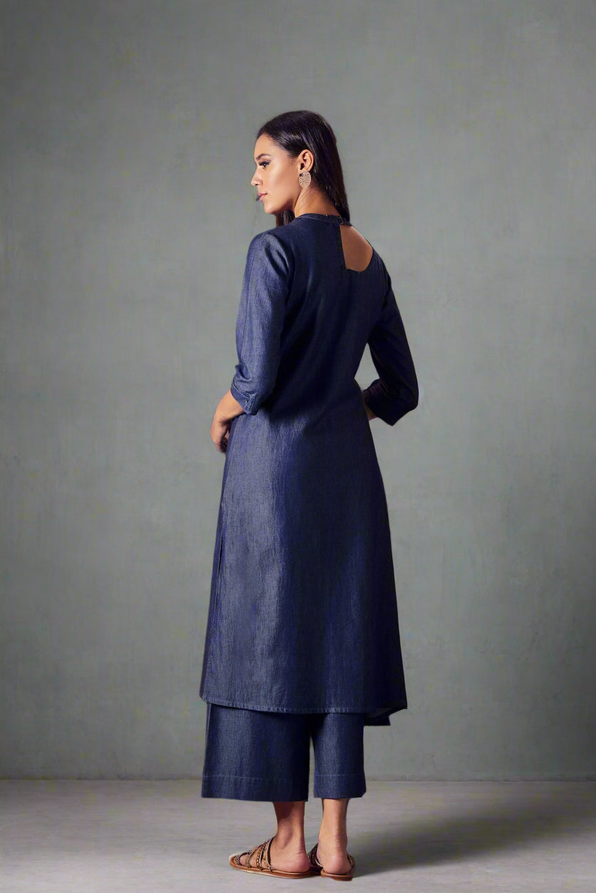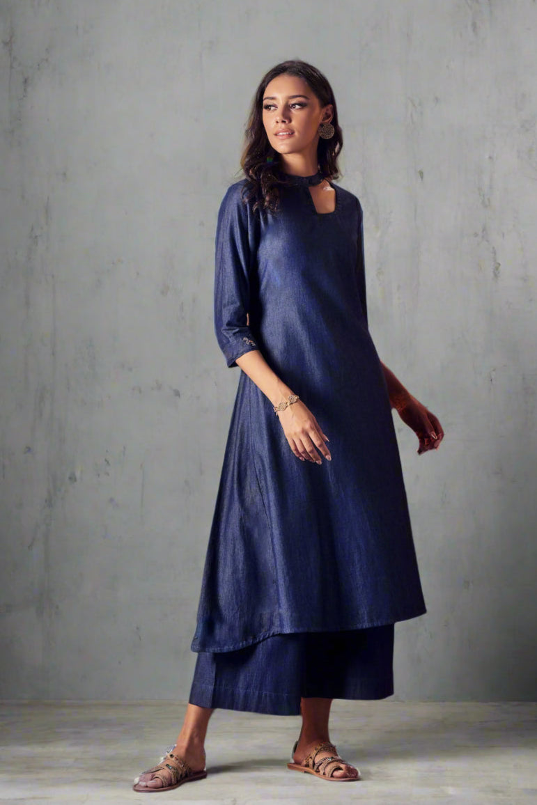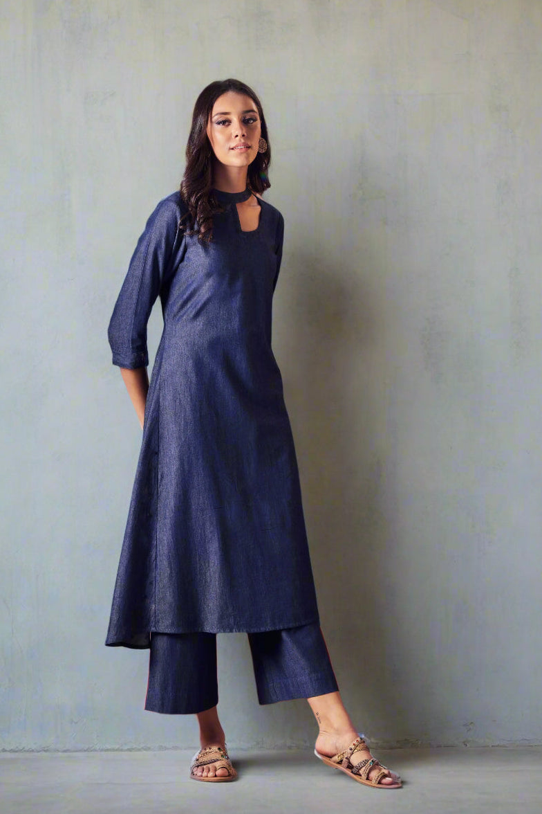 Make a bold statement with the Uber Chic Cut-Out Neck Kurta Set, crafted from super-soft denim fabric. Designed in a modern asymmetric silhouette, this kurta redefines traditional style with a contemporary twist. The cut-out neckline adds a touch of edgy elegance, while the breathable denim ensures all-day comfort. Paired with flared palazzos that is elasticated and has a drawstring, this set offers effortless movement and a striking silhouette.