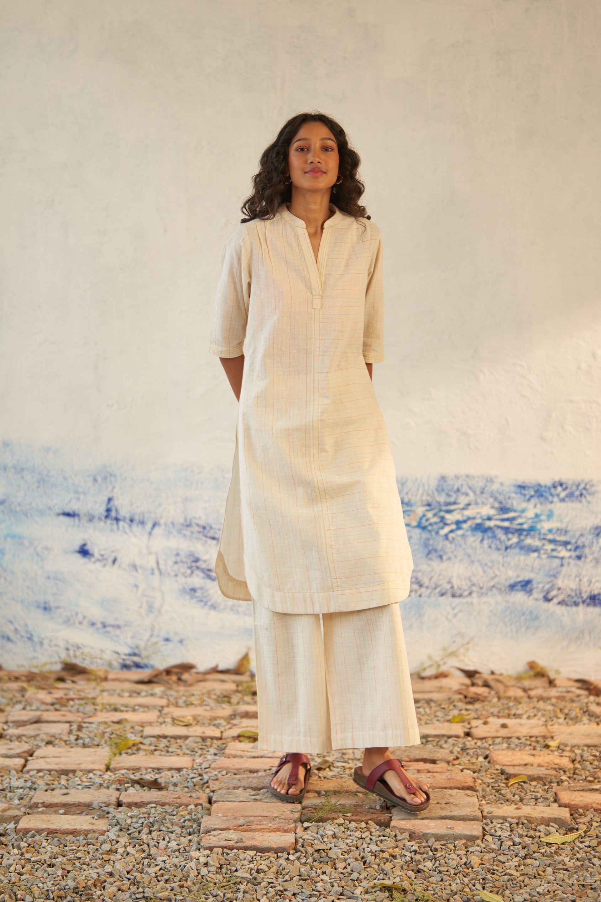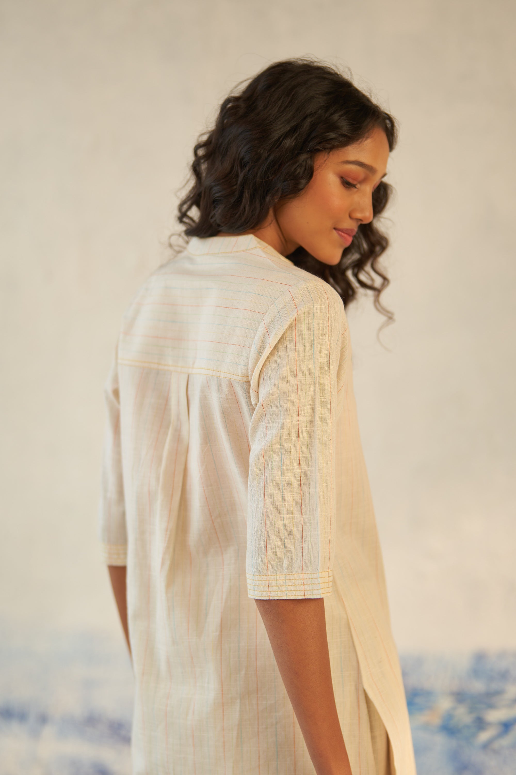 Crafted from lightweight cotton stripe, this versatile kurta is tailored for comfort and ready for exploration on-the-go. With its relaxed yet stylish design, featuring a round hem and a band collar transitioning into a V neckline, along with playful blue stitch detailing throughout, this effortlessly enhances your look.