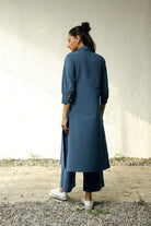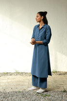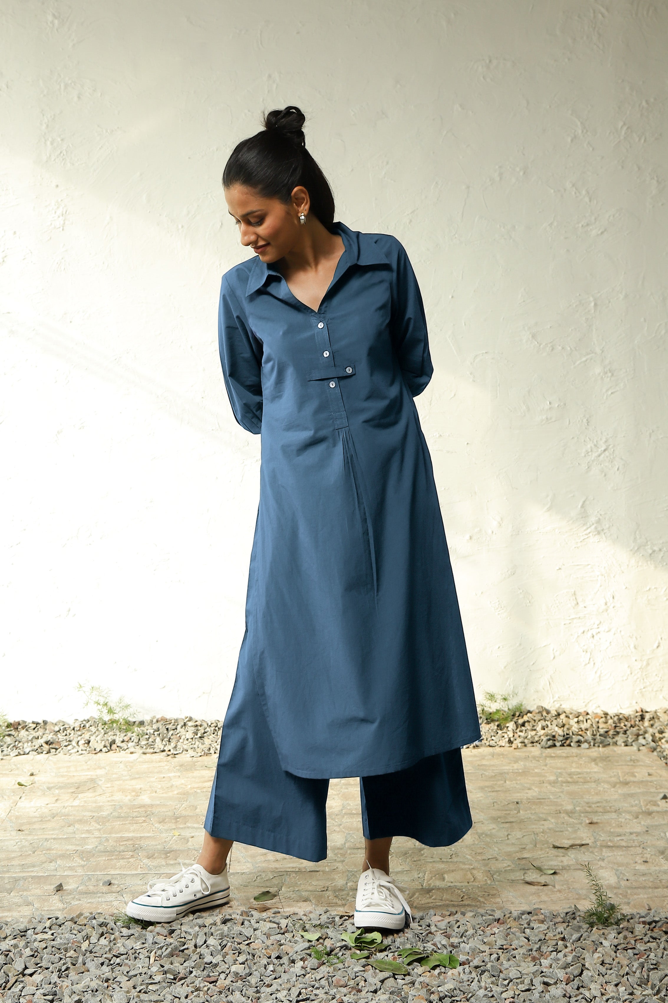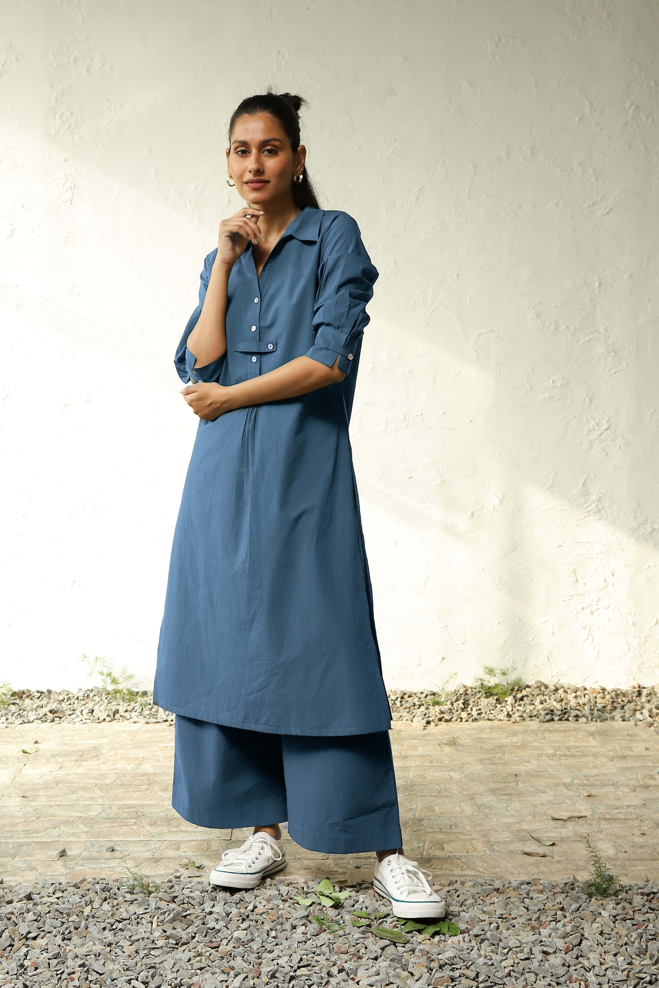 A rivulet exploration in our soothing blue front-buttoned co-ord set. Crafted from premium cotton poplin fabric, the kurta boasts a collared neckline and high side slits, forming a relaxed silhouette. The shell buttons and side seam pockets adds a touch to the style. Paired with a drawstring pleated pants, featuring a comfortable elasticated waistband and inward box pleats that lead to wide legs, creating a breezy silhouette.
