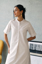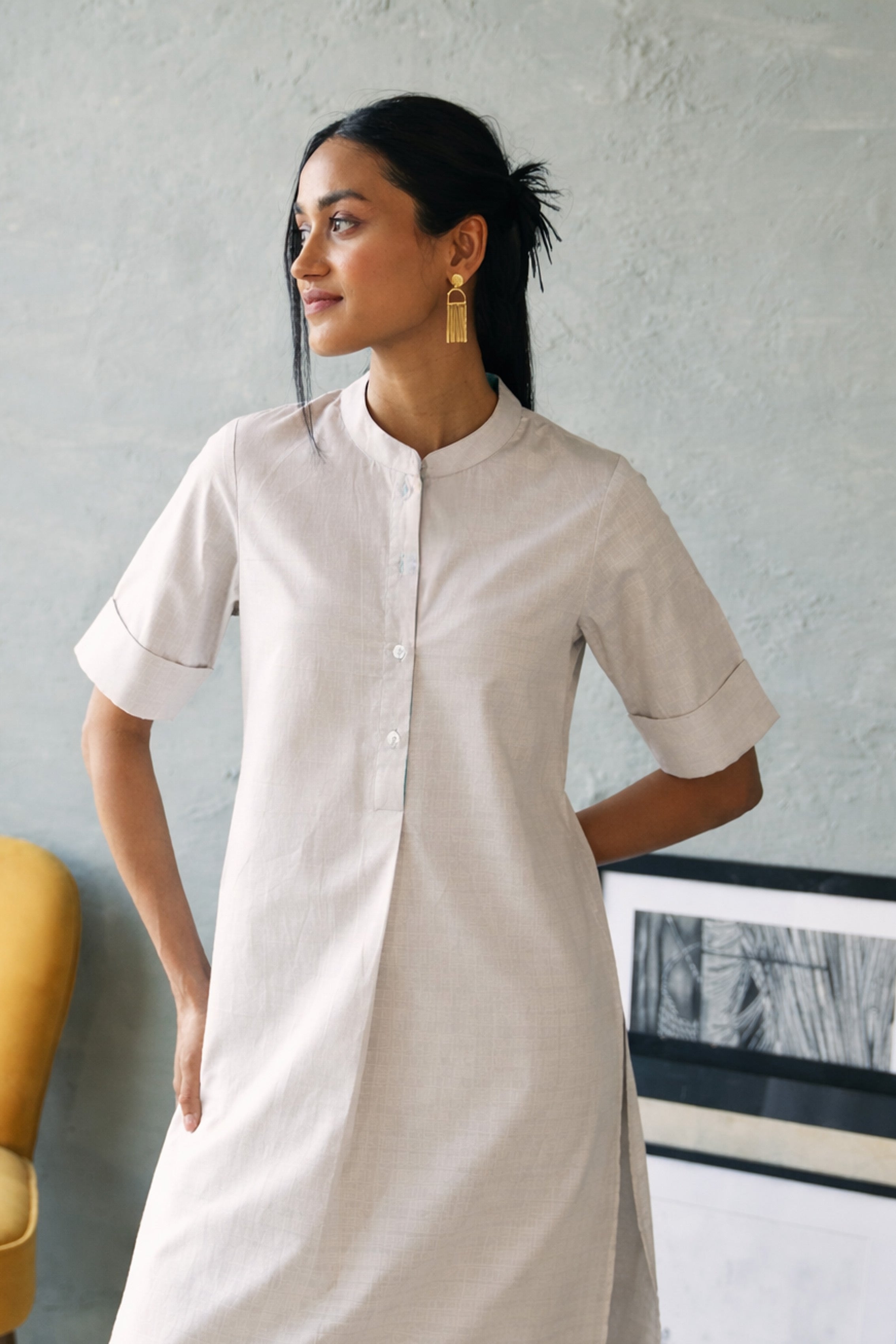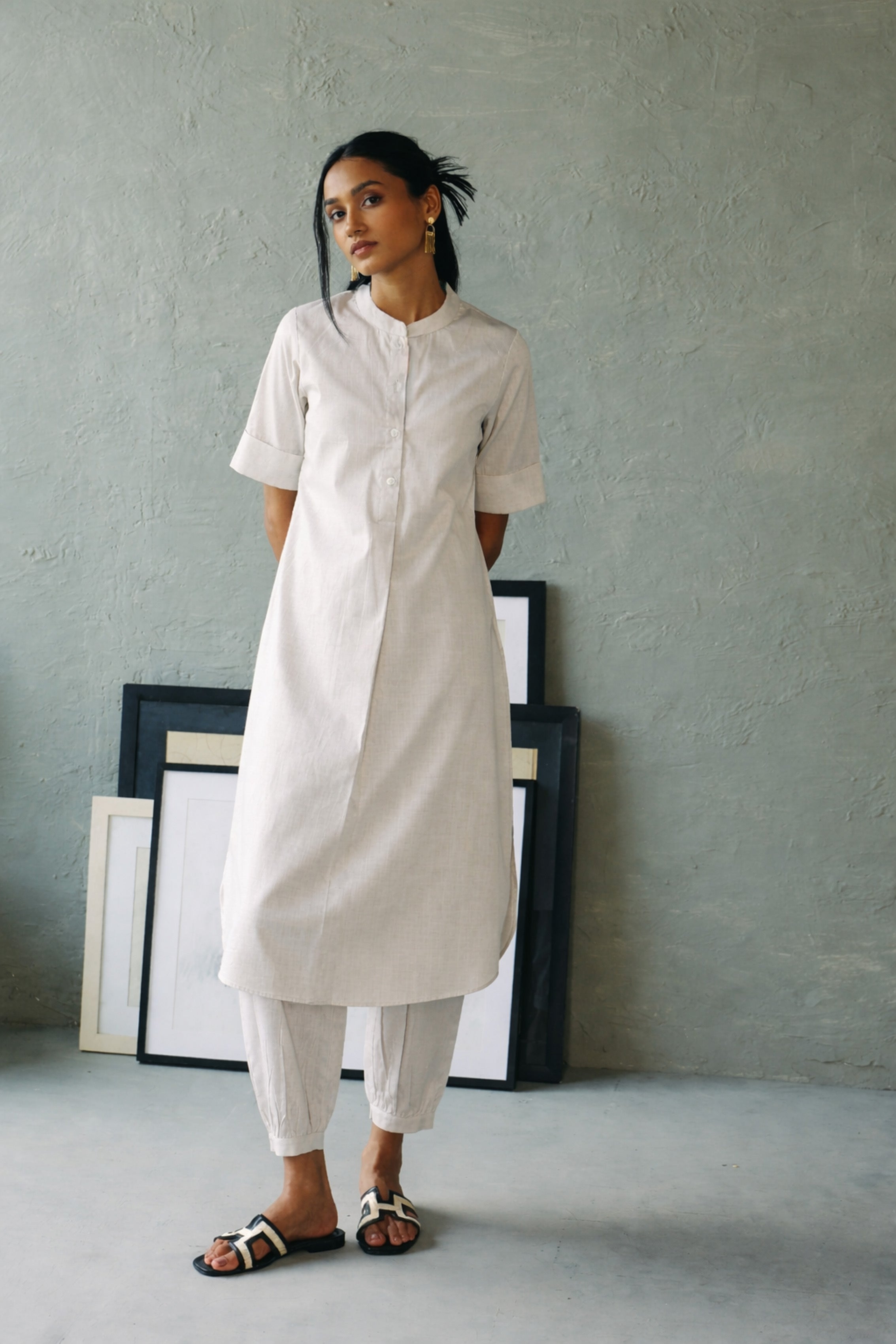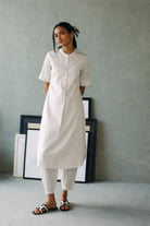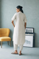 Kurta Set is crafted in soft textured cotton for a comfortable and pleasing ask in off-white with subtle lines inspired from shell surface. The band-collar kurta is detailed with shell buttons, and a flowing front pleat that runs through its length, adding graceful movement. Paired with pleated pants featuring an elasticated waistband.