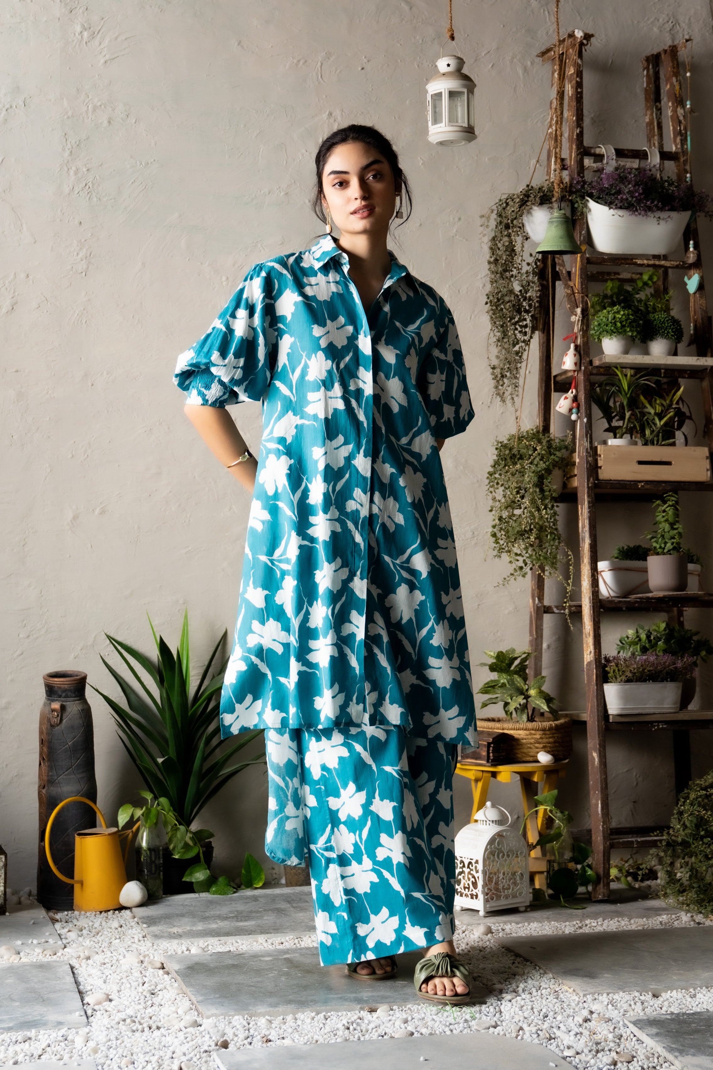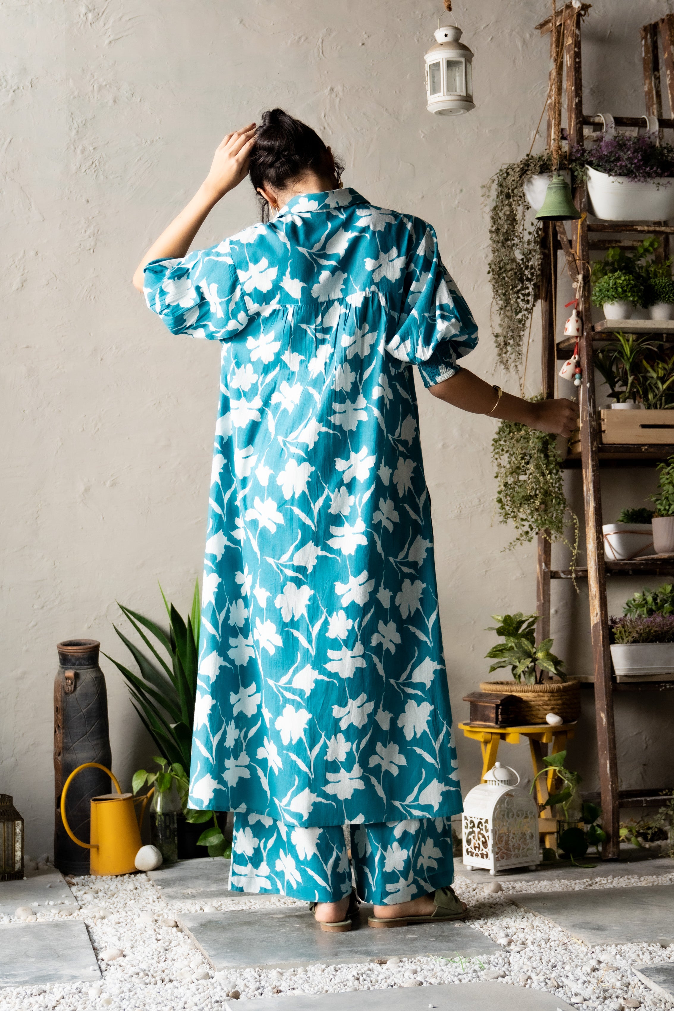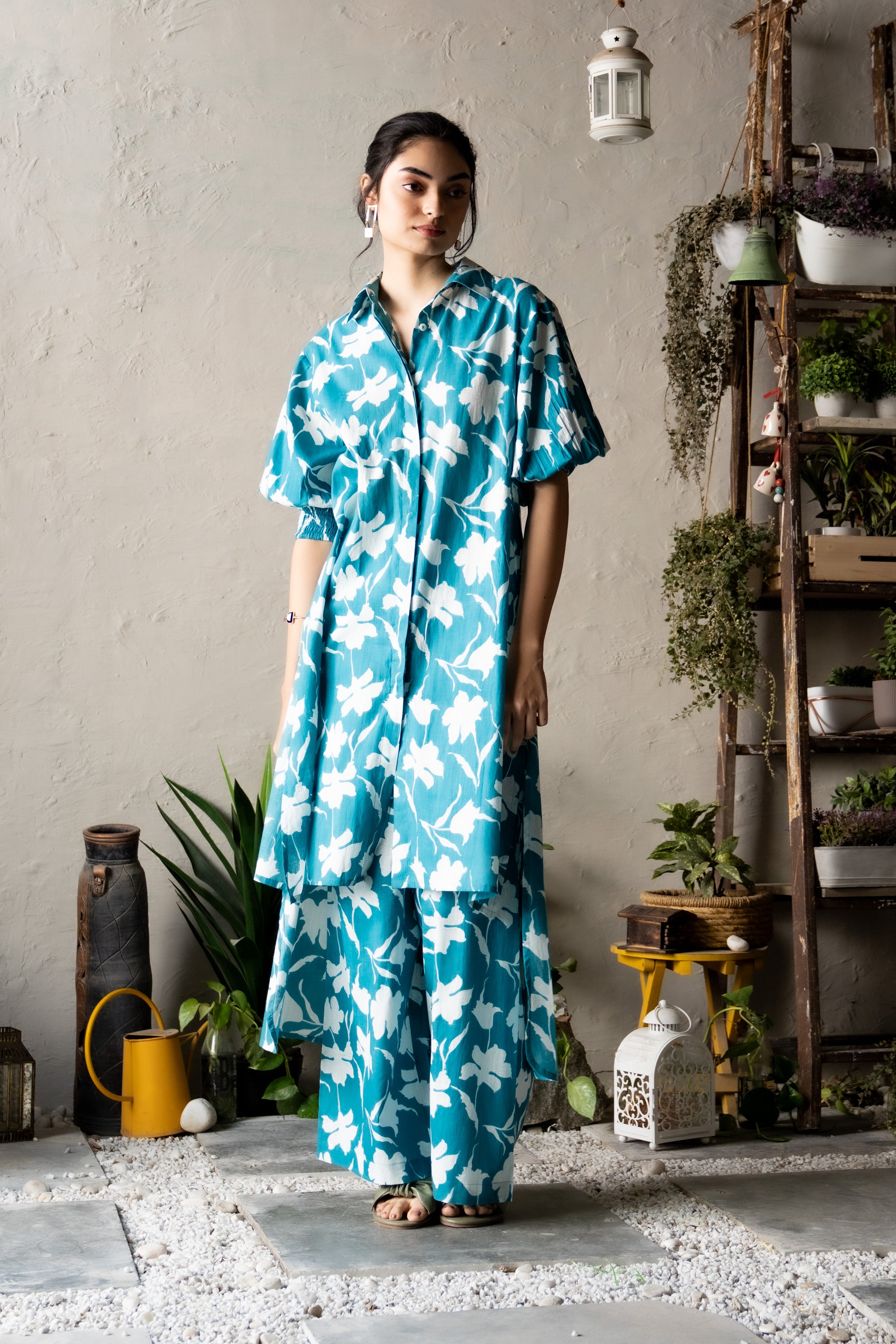 Breeze through your day in the effortless elegance of the Windsong Set. The front-buttoned kurta features a classic collared neckline and smocking details on the sleeve cuffs, adding a touch of sophistication. Its hi-lo panels create a flowy, flattering silhouette. Paired with flared pants designed for both style and practicality, complete with comfortable side pockets, this set combines charm and functionality.