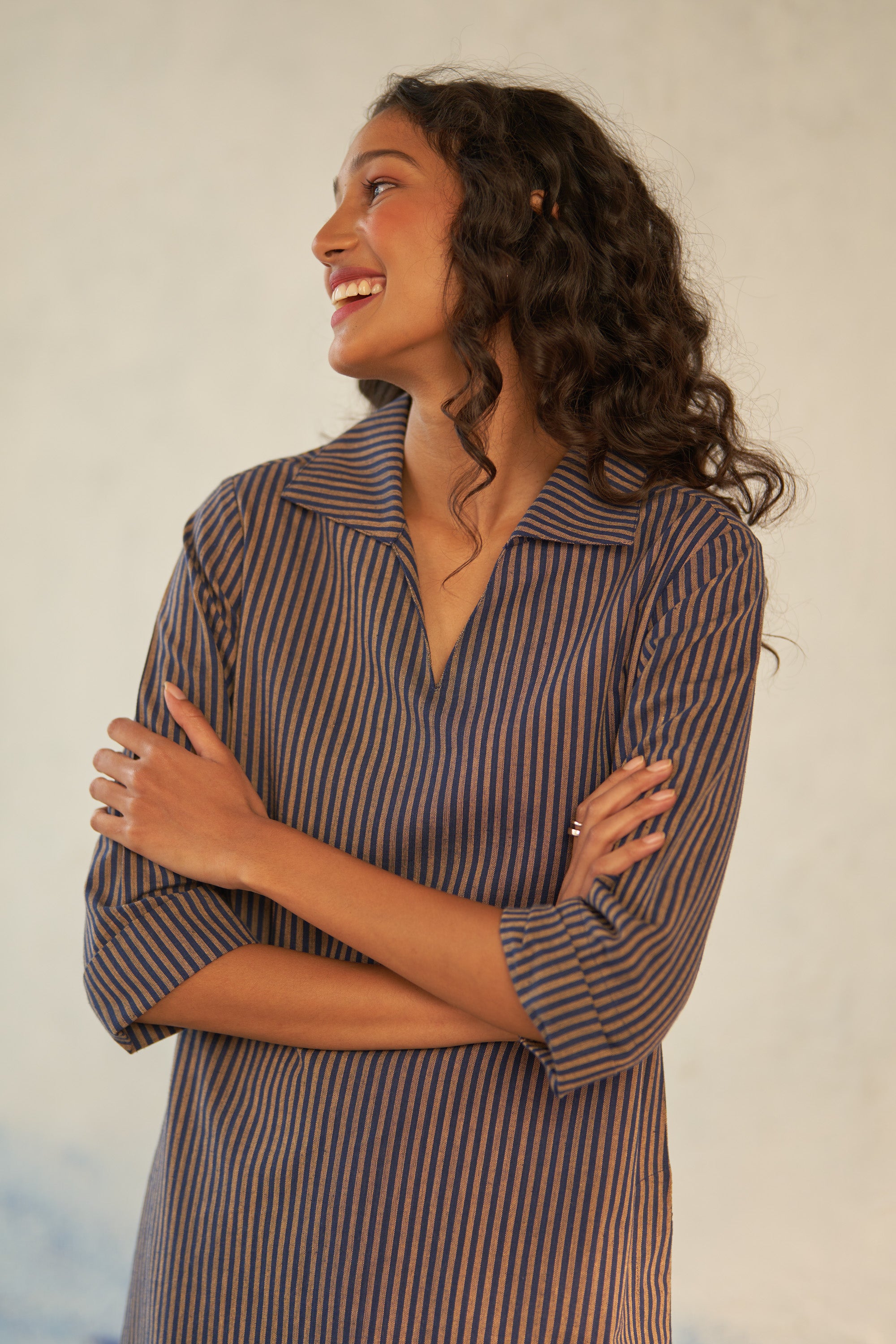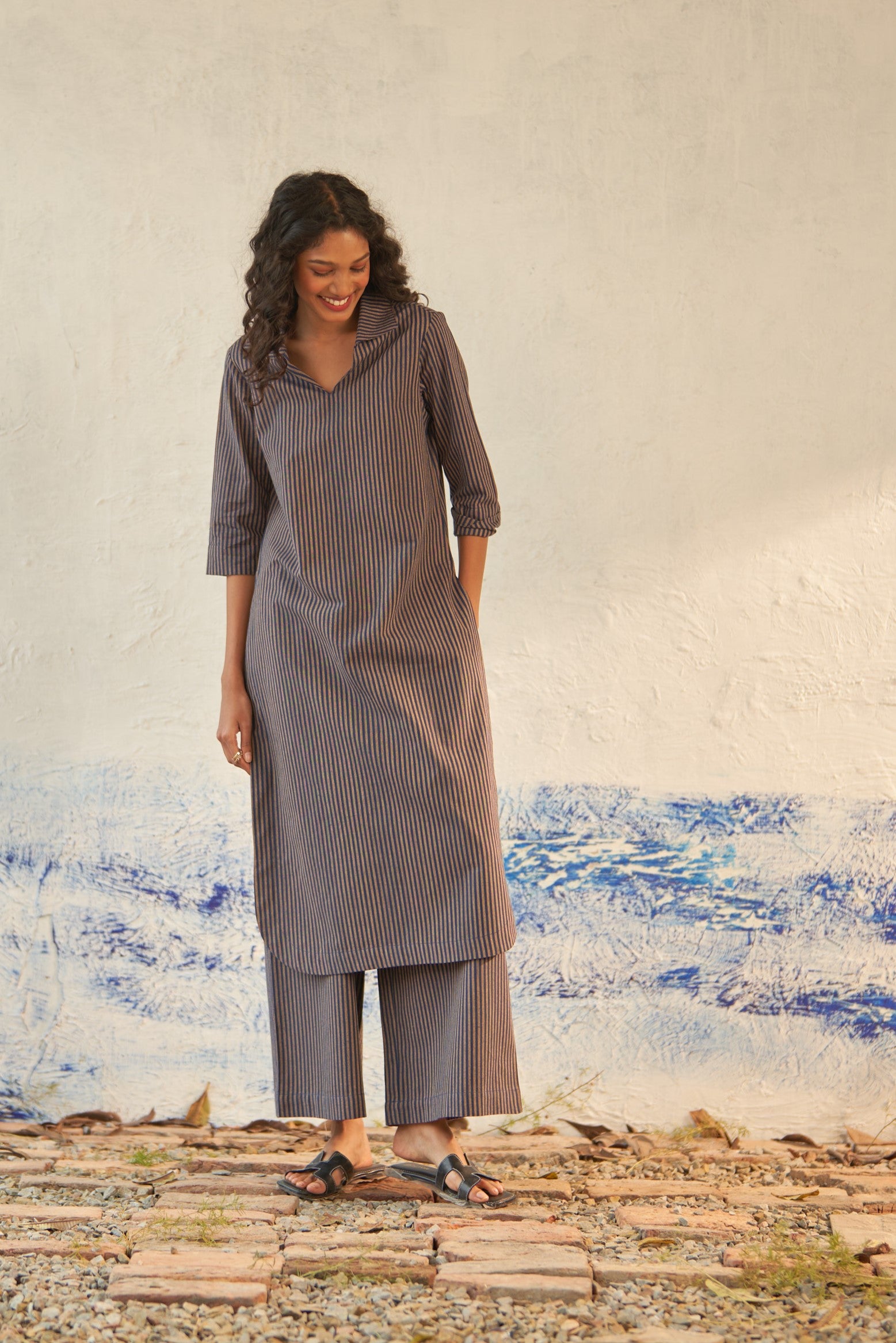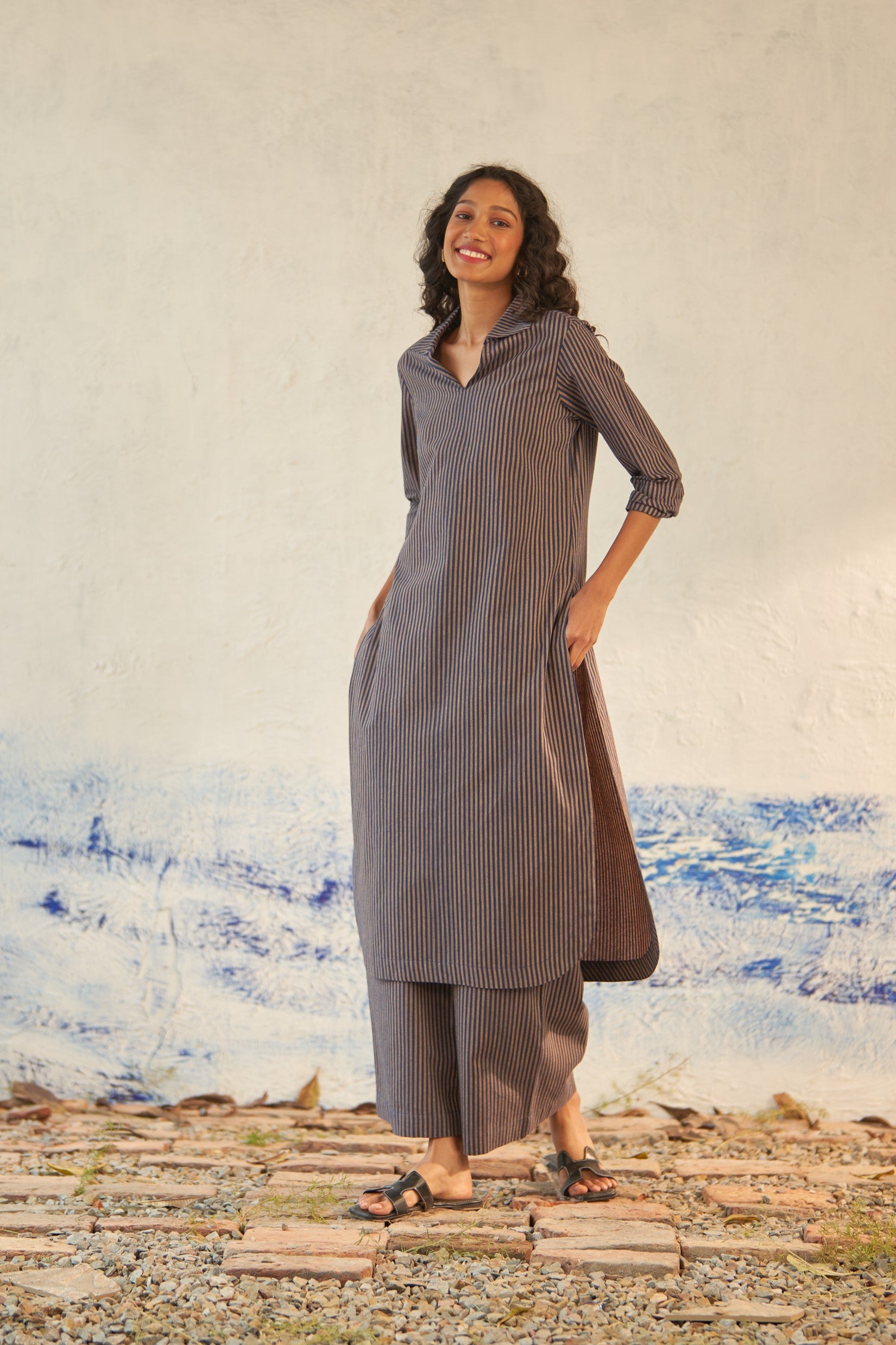 Offered in classic blue and beige stripes, this long kurta is crafted from lightweight cotton that's cut for fluidity and drape. The V-neckline with subtle collars defines the silhouette, while the side slits create subtle movement as you walk.