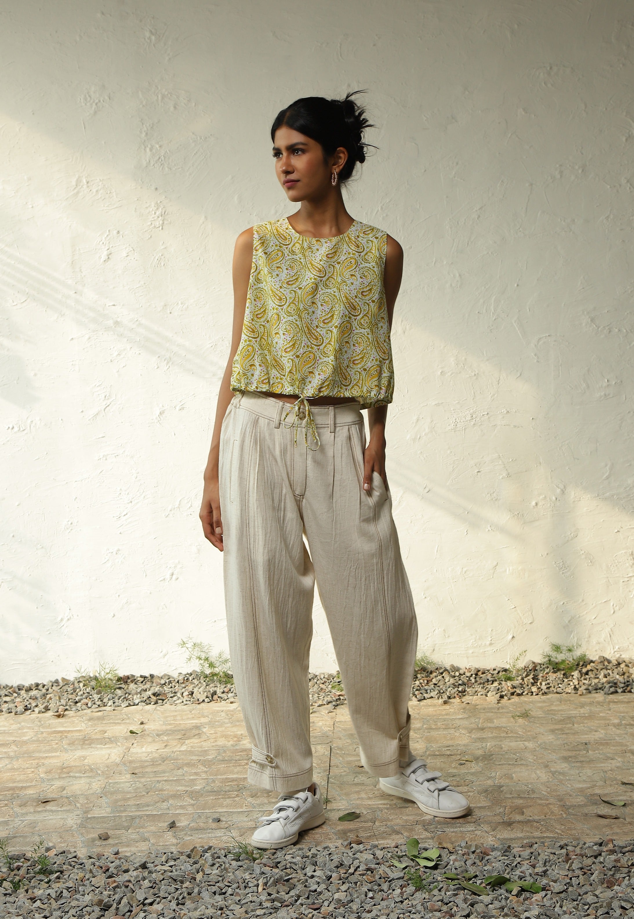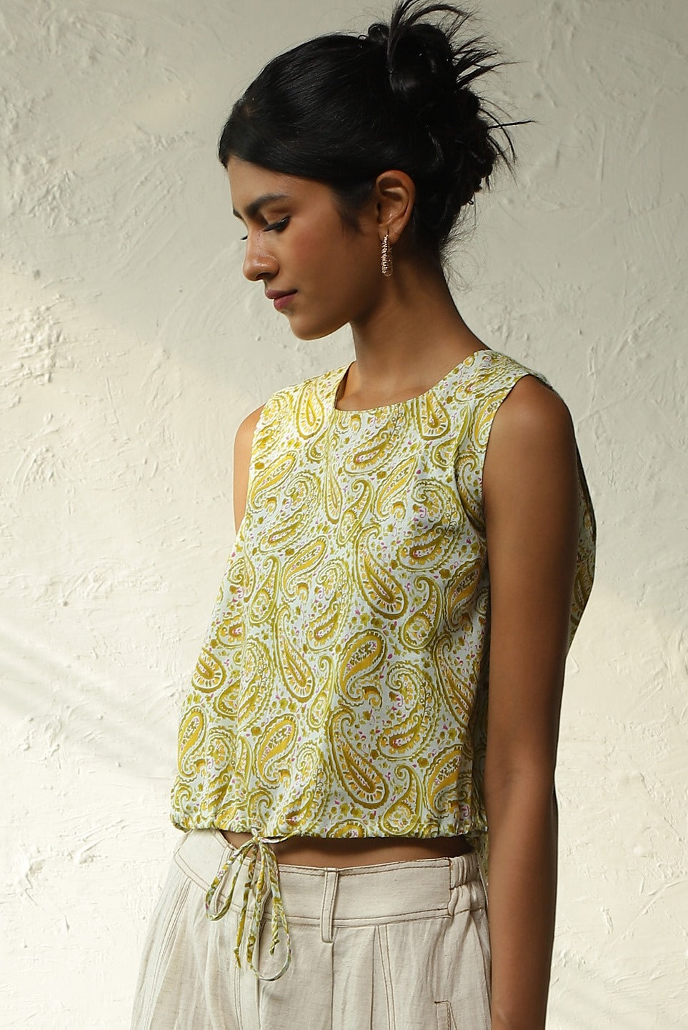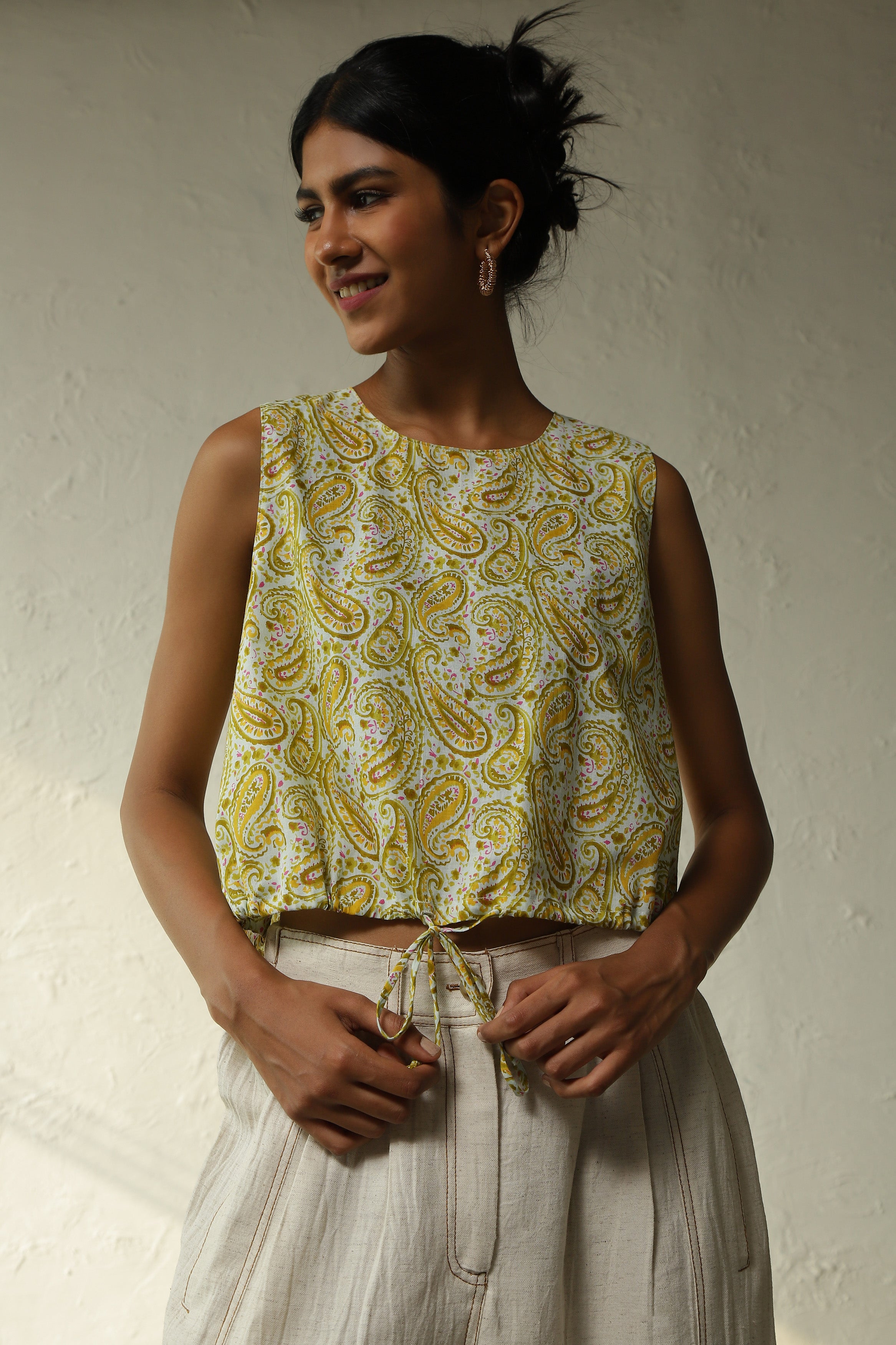 Elevate your wardrobe with our paisley print sleeveless cotton top, destined to be your favorite. Crafted from soft, lightweight cotton, it boasts a waist-perfecting drawstring hem and a delightful knot accent.
