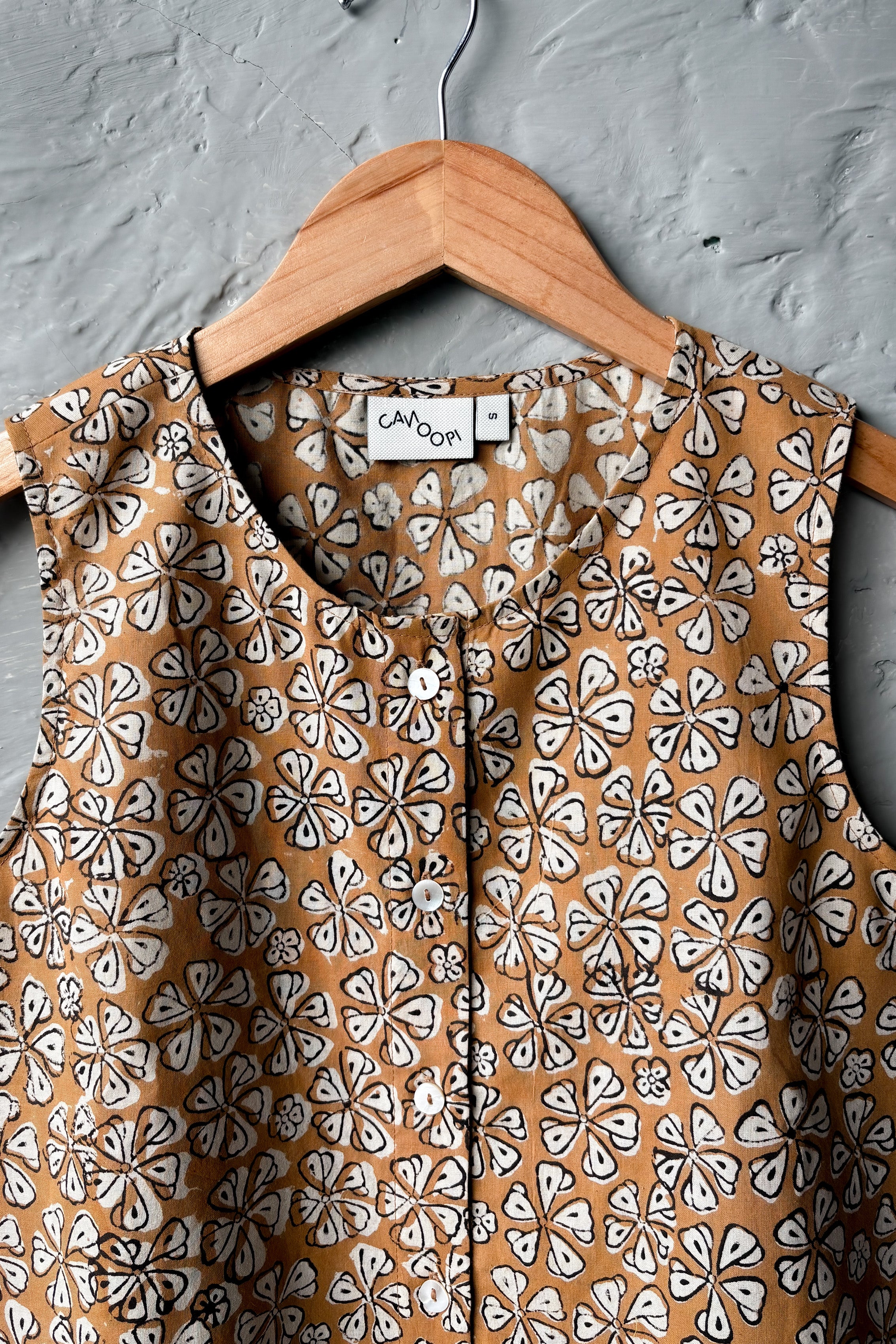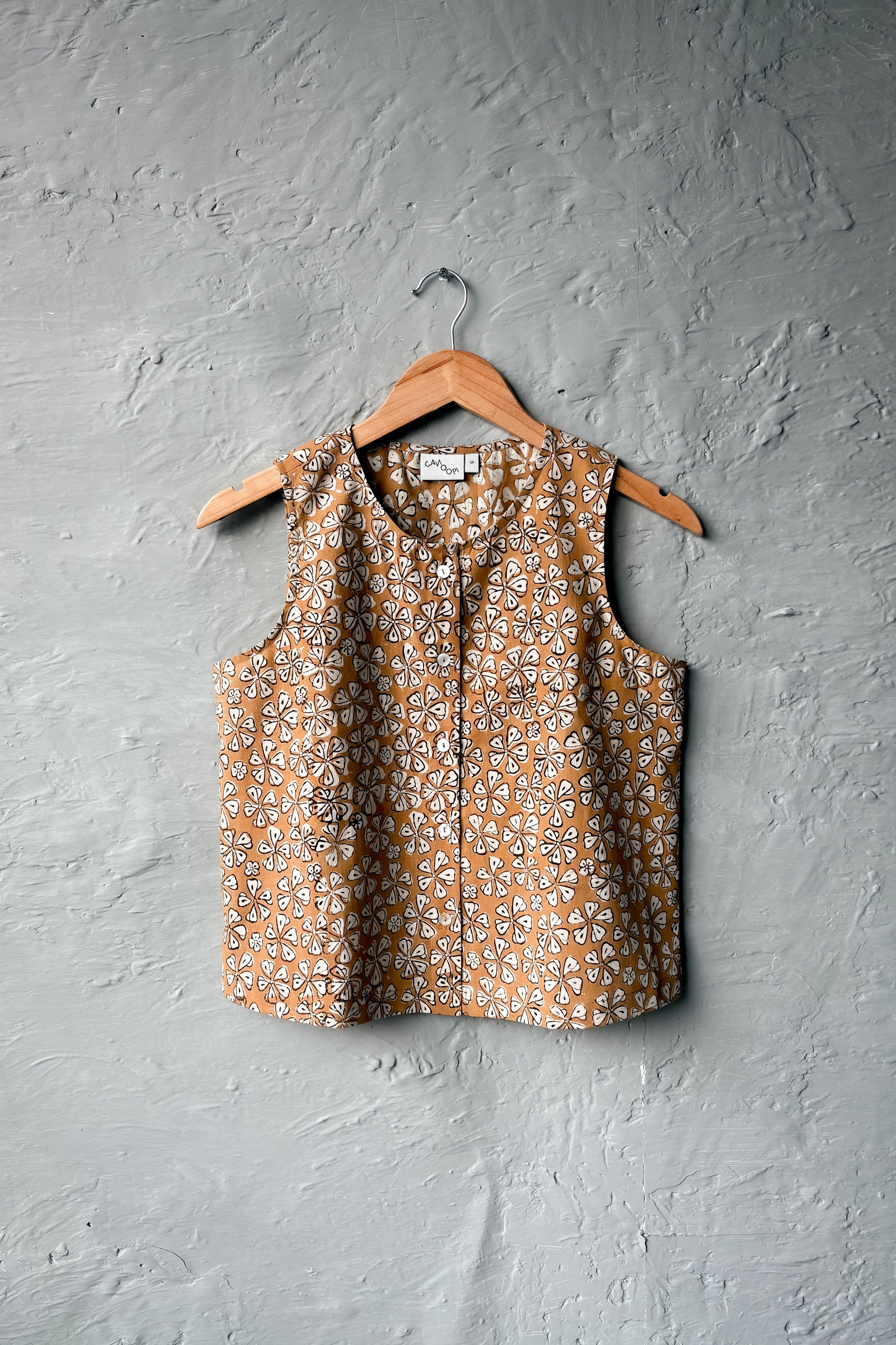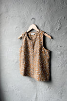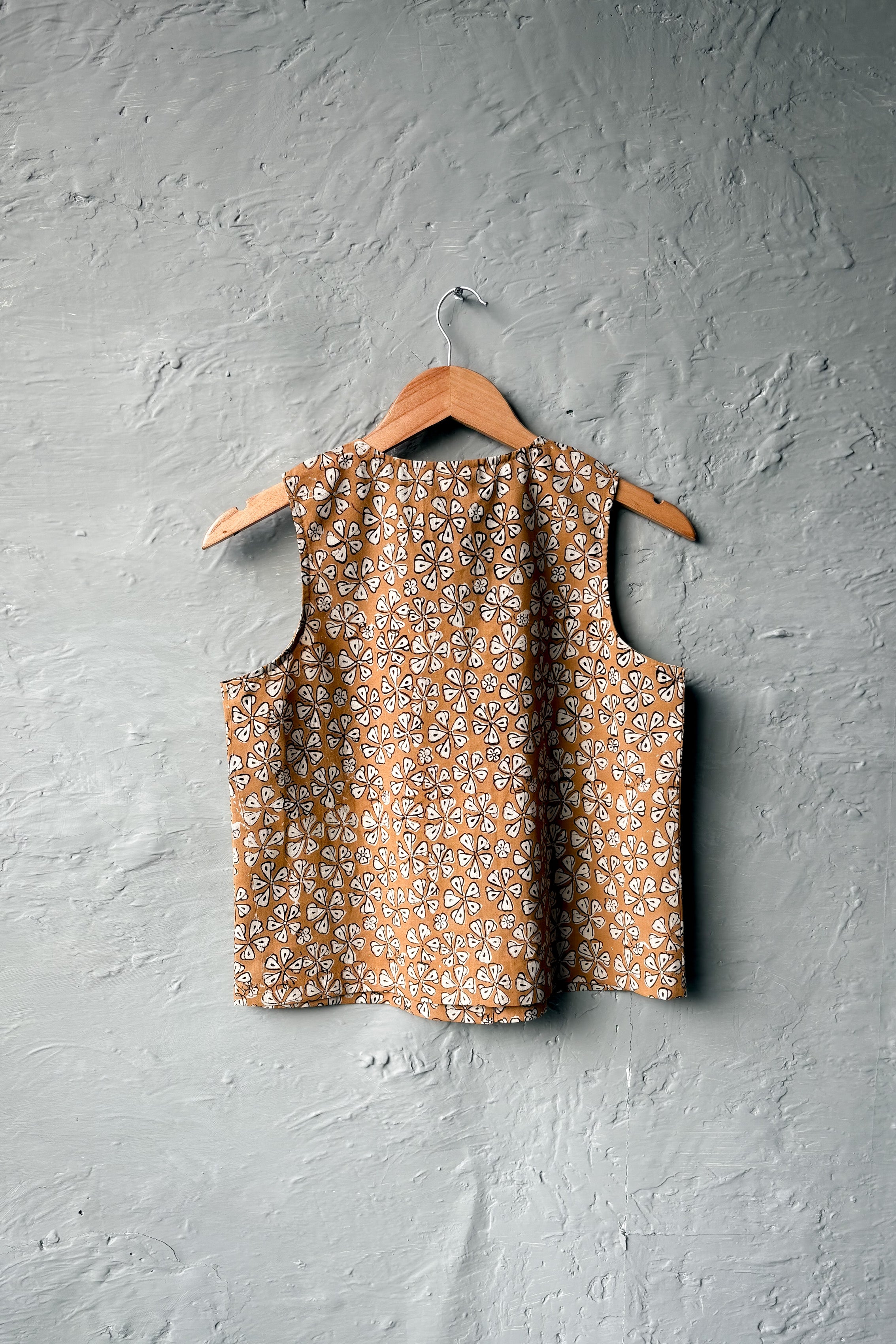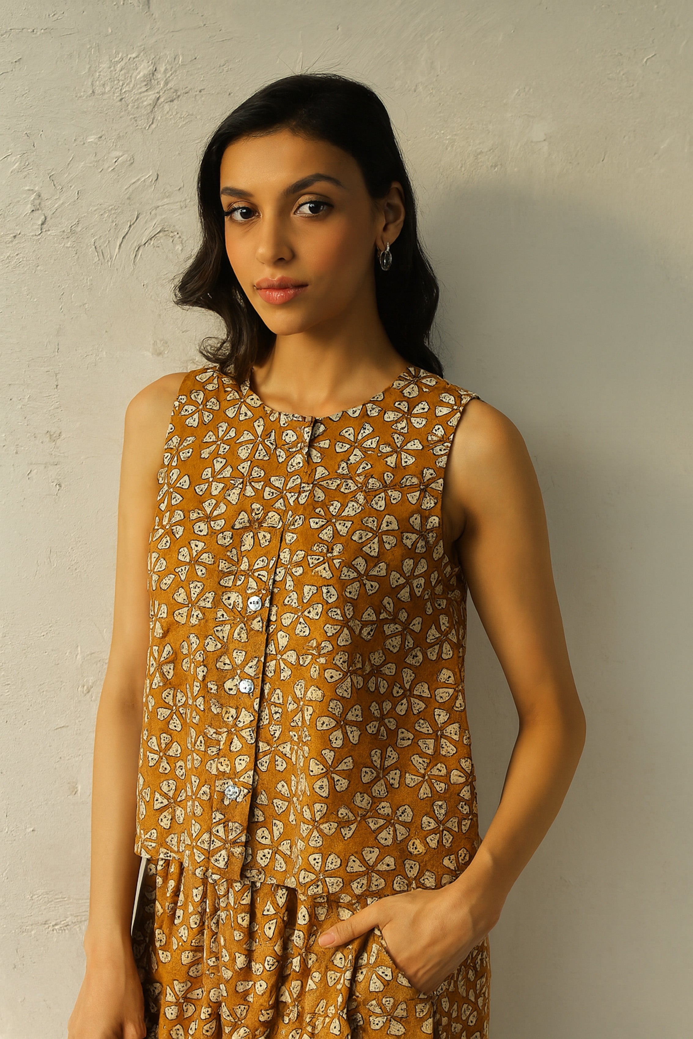 This splendid sleeveless top combines comfort and charm, featuring a relaxed fit and a neat shell buttoned front. Its cropped design pairs perfectly with high-waisted bottoms, be it trousers or shorts. In mustard colour.