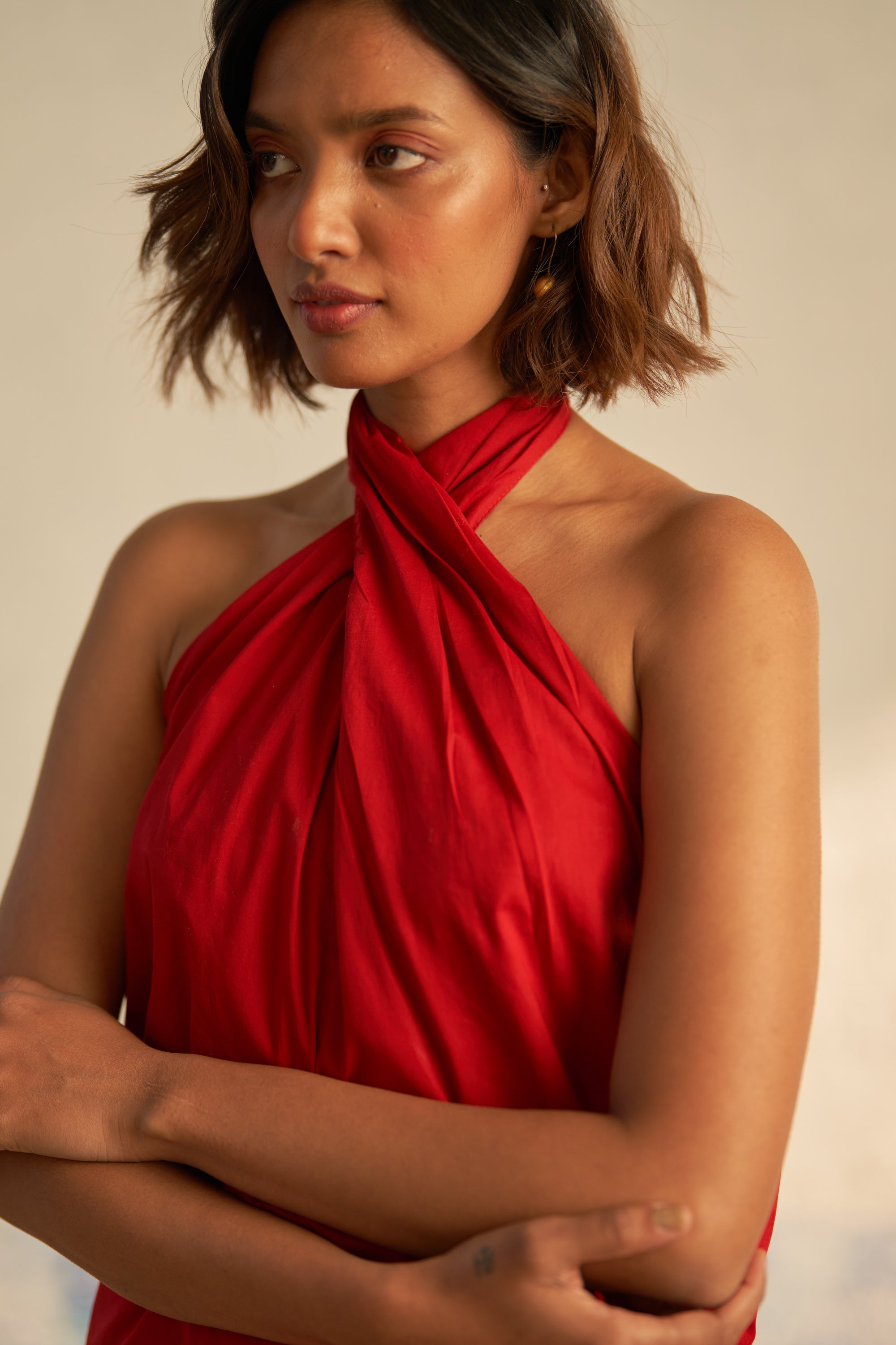 Classic halter top made from soft lightweight cotton fabric, perfect for special occasions. It features two halterneck panels crossed over each other at the neck and a plunging V-neckline with buttoned closure.